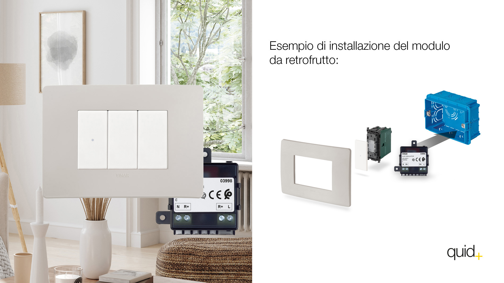 Galvanisches Trennmodul Quid, 1 Eingang für NO Reset-Taste von Anlage A (Slave), 1 Eingang für NO Reset-Taste von Anlage B (Master), 1 Eingang für Nullleiter Anlage A (Slave), 1 Eingang für Phase Anlage B (Master), Installation in Abzweig- oder Einsatzdosen