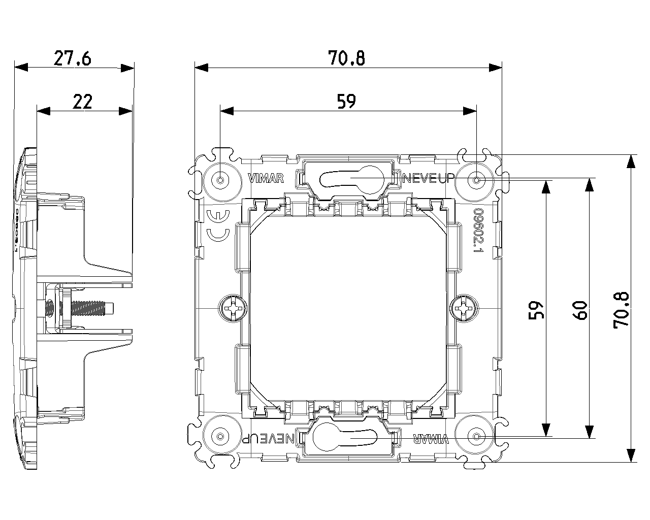 2-Modul-Halterung, mit Krallen, für Unterputzdosen ø 60 mm, kombinierbar mit StifTabstand 71 mm