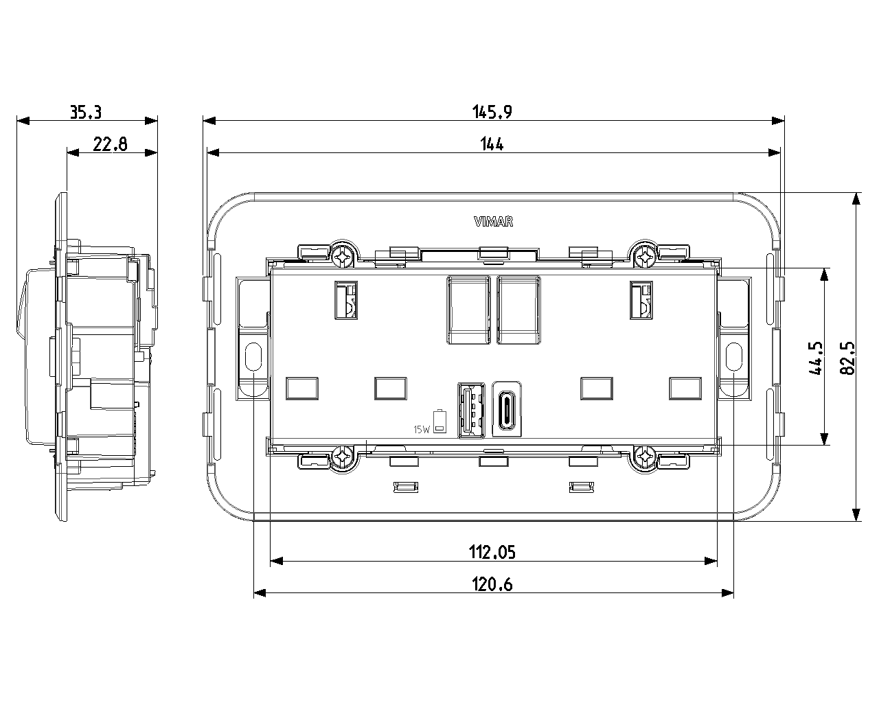 Zwei Steckdosen SICURY 2P+E 13 A 250 V~ englischer Standard eingeschaltet durch zwei Schaltern 2P mit roter Linie, einem USB-Ausgang Typ A und einem USB-Ausgang Typ C, inkl. Halterung für die Installation in Dosen zur Ergänzung mit Abdeckrahmen 5 Module, englischer Standard, weiß