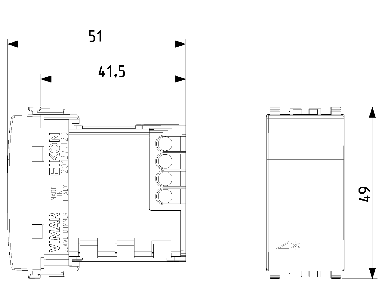 SLAVE-Dimmer 120 V~ 60 Hz für: Glühlampen 40-500 W, elektronische Trafos 40-300 VA, CFL-Leuchstofflampen 10-200 W, LED-Lampen 3-200 W Steuerung über MASTER-Dimmer CFL-LED mit Bleeder, im Dunkeln sichtbar, grau. Nicht für Isoset-Gehäuse