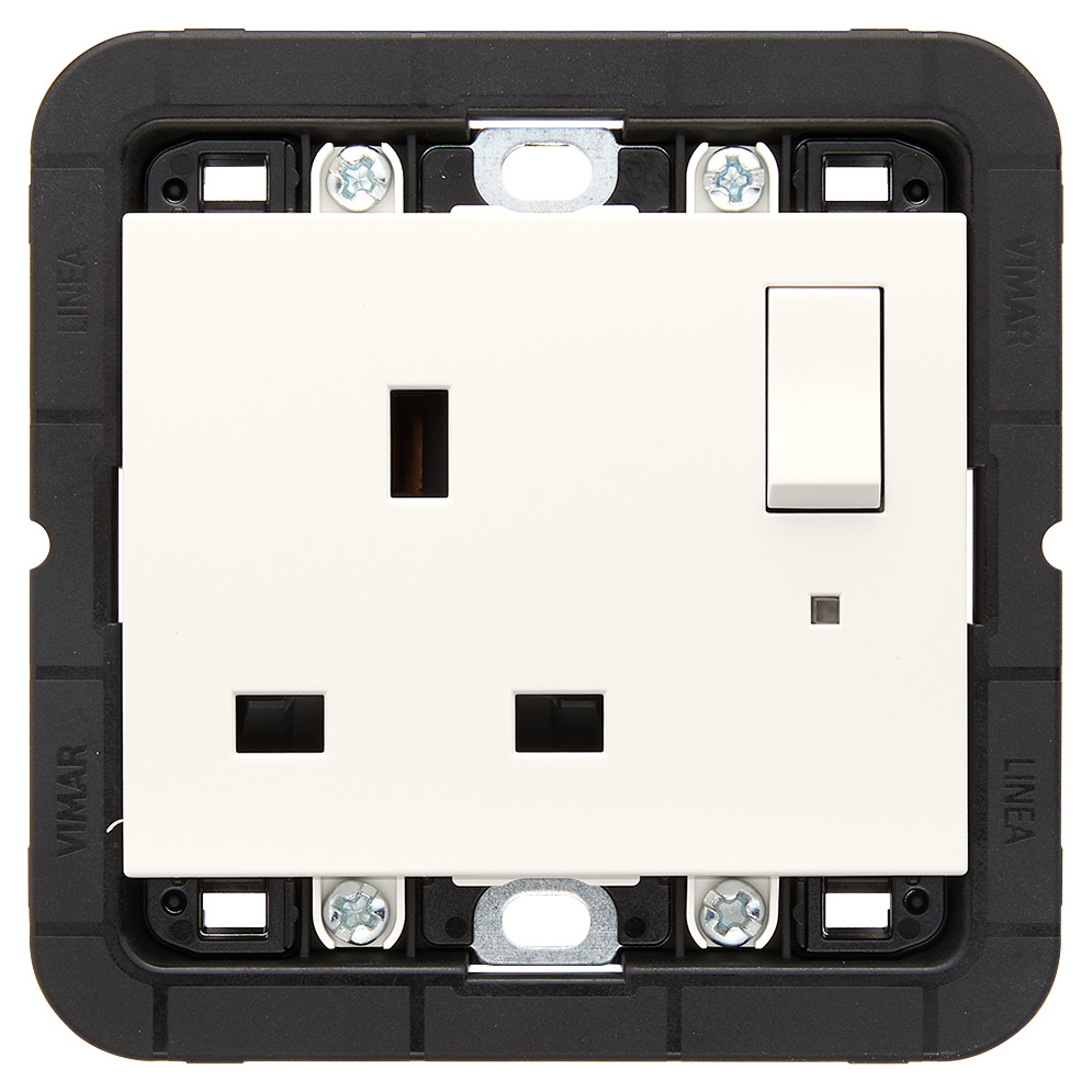 Steckdose SICURY 2P+E 13 A 250 V~ englischer Standard mit Schalter 2P mit Leuchtanzeige, inkl. Halterung für die Installation in quadratischen Dosen BS, zur Ergänzung mit 3-Modul-Abdeckrahmen BS, weiß