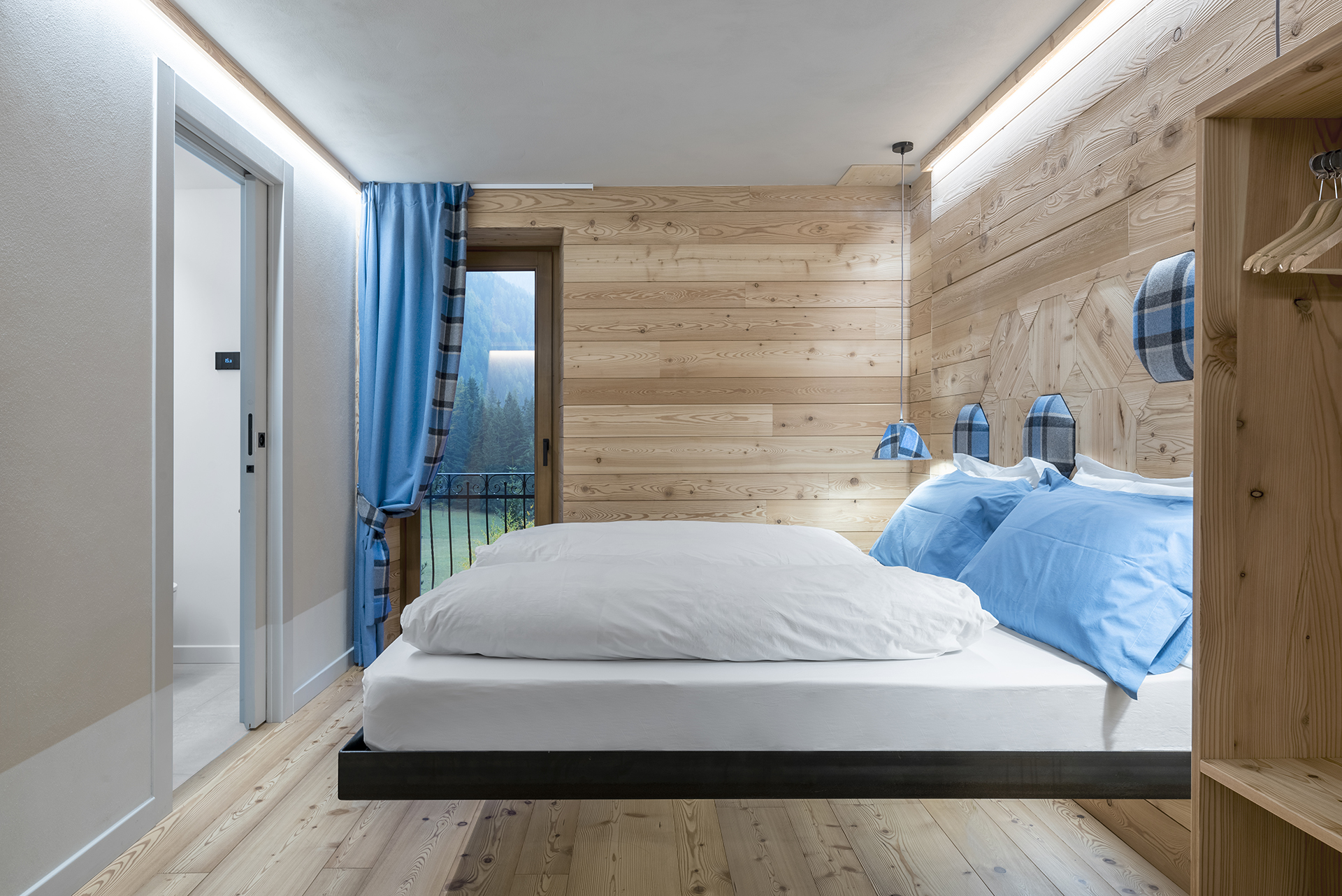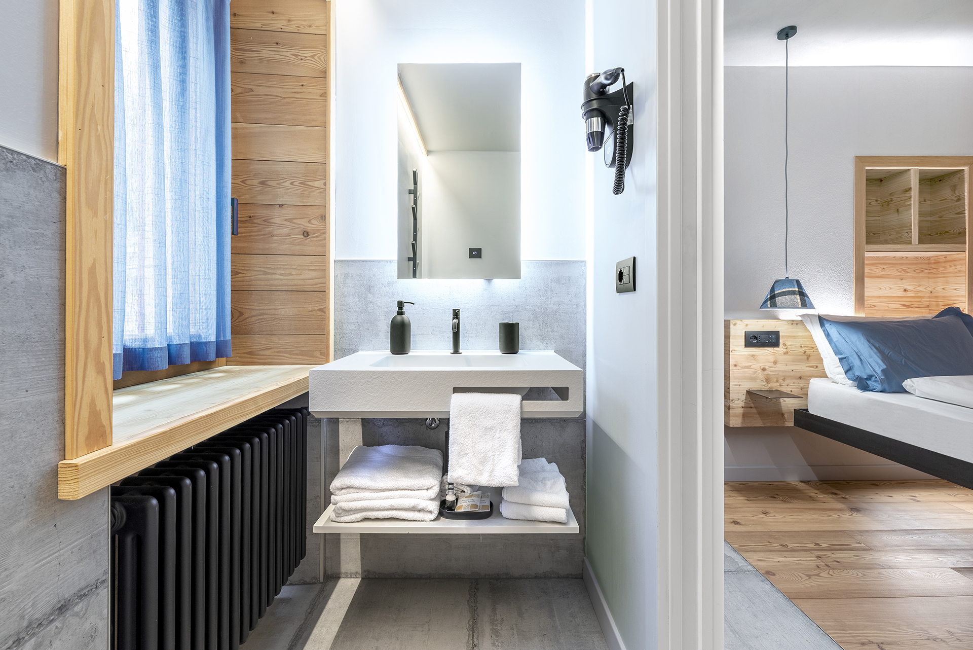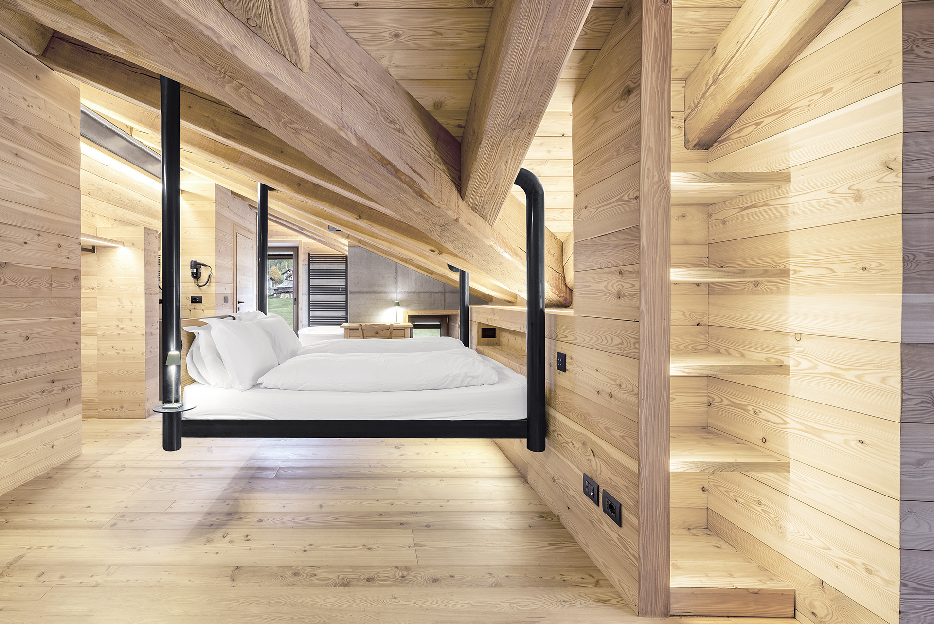 Von der Steinverkleidung bis zu den charakteristischen roten und weißen Holzbalkonen, deren Fenster einen Panoramablick auf die Berge bieten, ergibt sich die Höhe des mansardierten Gebäudes aus der Notwendigkeit, das abschüssige Gelände optimal zu nutzen und somit eine ausreichende Anzahl an Zimmern für die Gäste zu schaffen, die in den 50er Jahren dank der ersten Skilifte begannen, das Hotel auch für ihren Winterurlaub zu wählen. Seit vier Generationen von derselben Familie geführt, verfügt das Hotel heute über 22 Zimmer. Unter Beibehaltung der Authentizität des ursprünglichen Gebäudes wurden die Gästeetagen kürzlich mit einem modernen und innovativen Design renoviert. Ein überraschendes Wechselspiel zwischen Vergangenheit und Gegenwart empfängt den Besucher. Im Erdgeschoss bewahren die Gemeinschaftsbereiche die Wärme der Erinnerung, umgeben von einer intimen Atmosphäre und Details, die an die Geschichte des Ortes anknüpfen. In den oberen Stockwerken ändert sich die Perspektive: Hängende Betten, Verkleidungen aus Lärchenholz und Zimmer mit essentiellem, zeitgenössischem Design umgeben den Gast mit modernem Komfort, der durch die harmonische Verwendung natürlicher Materialien und Technologie die Tradition erneuert.