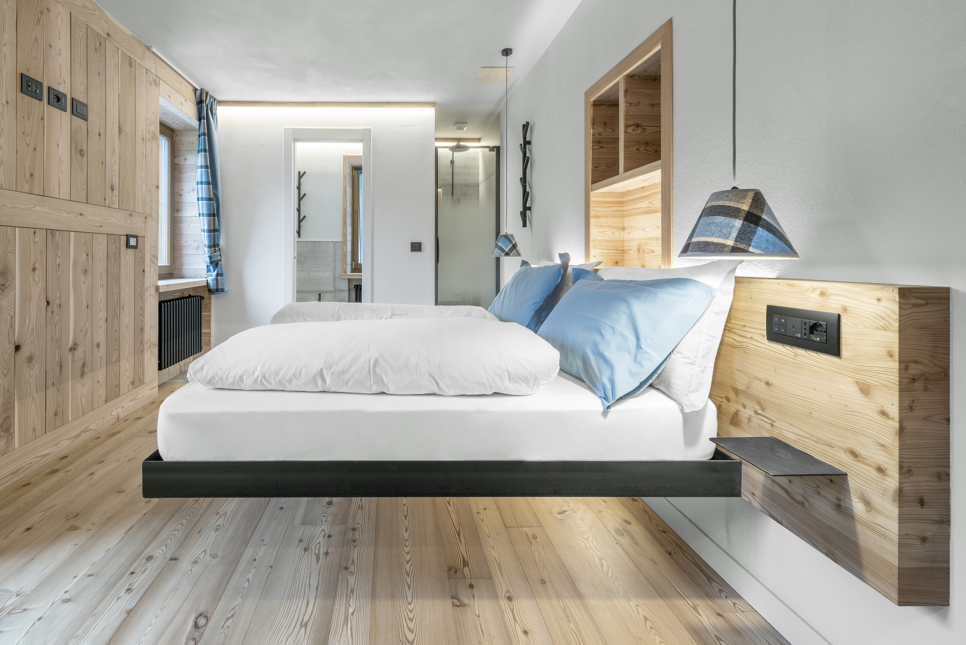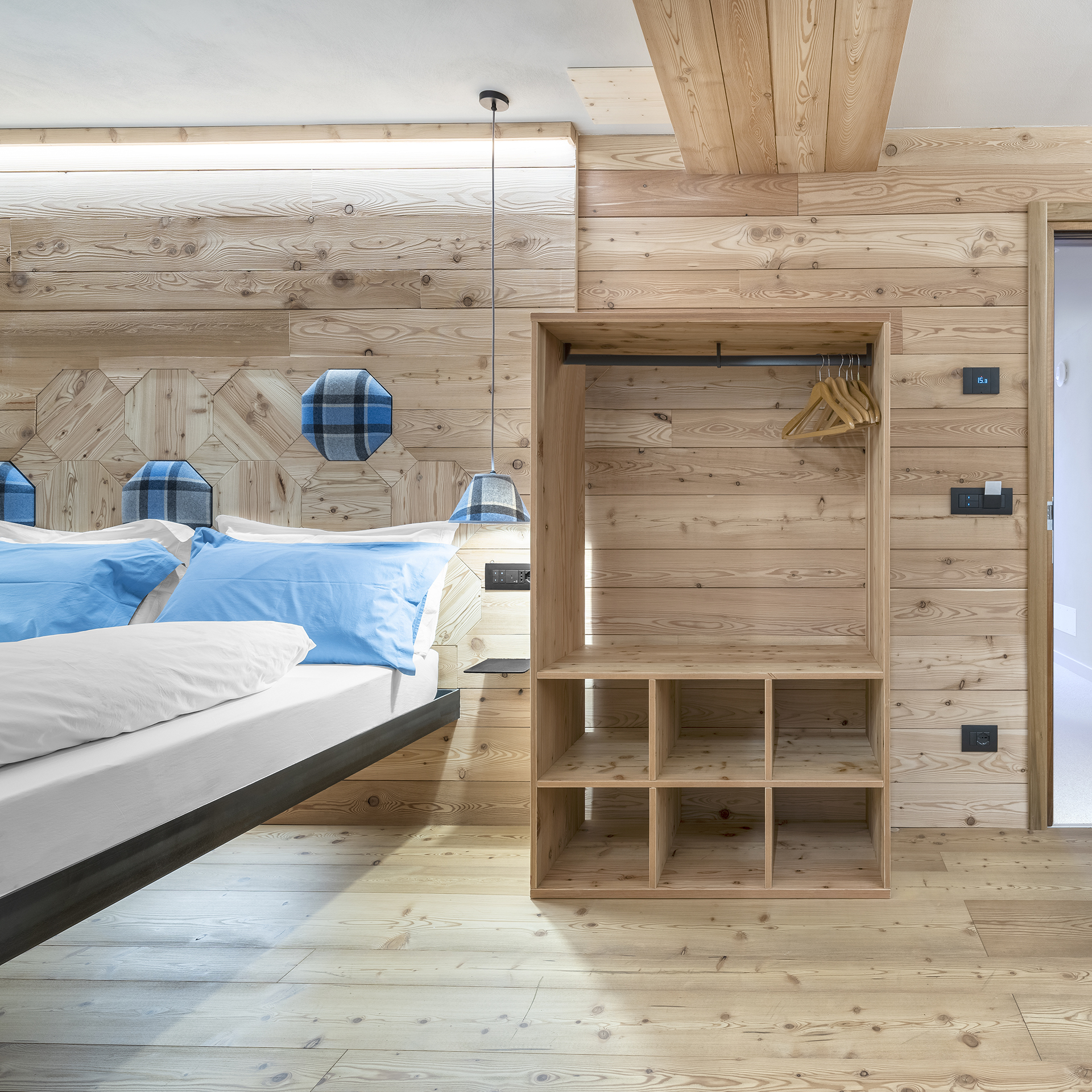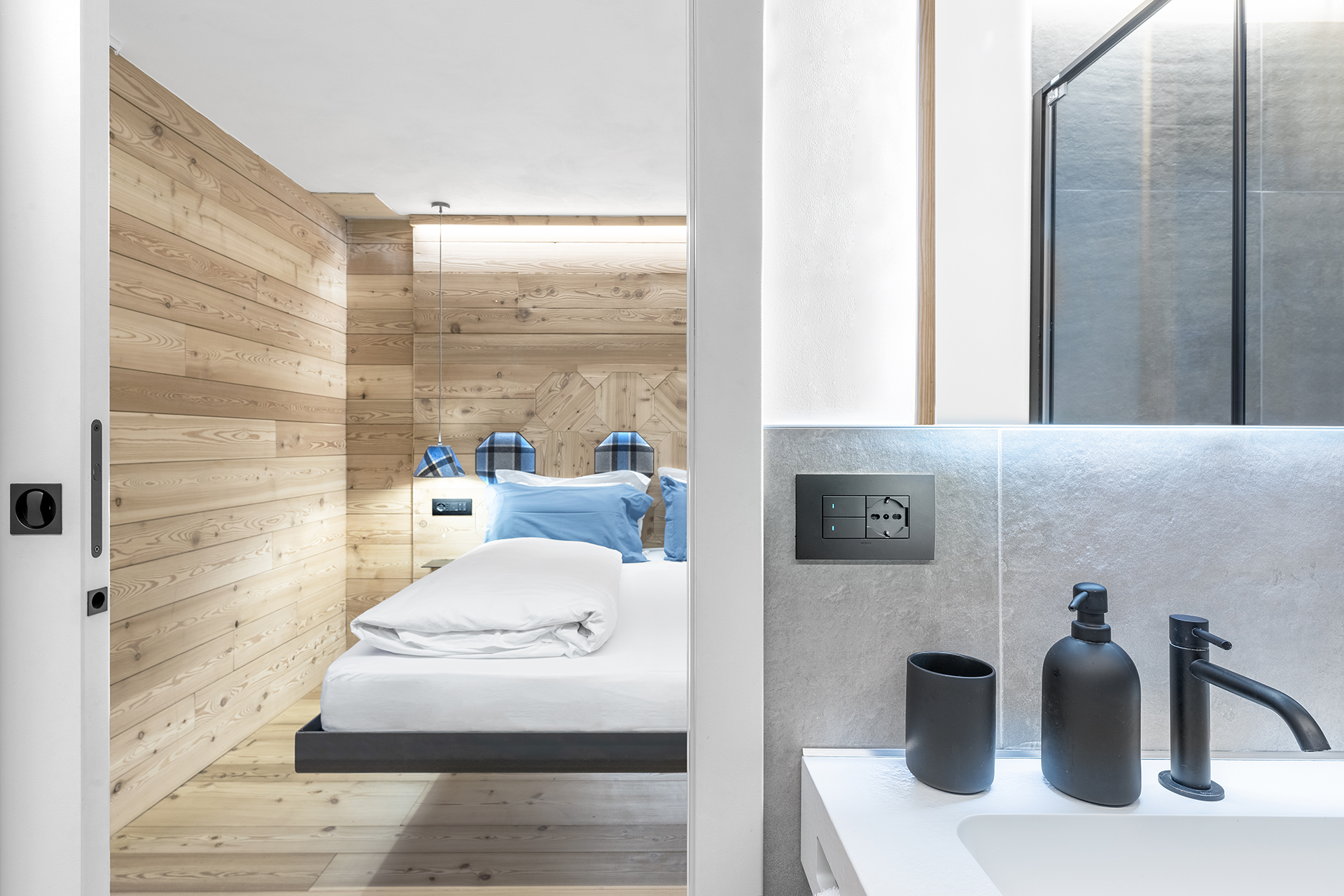 Genau in diesem Umfeld kommt Vimar ins Spiel und bietet ein konkretes Beispiel für die Integration von Systemen. Insbesondere wurde das Hausleitsystem By-me Plus gewählt, um Beleuchtung, Temperatur und Stromverbrauch synergetisch zu steuern. Ergänzt wird die Anlage durch den Multisensor der Linea XT-Plattform in Schwarz für die Integration der Klimaregelung sowie der Funktionen Thermostat und Hygrostat. Mit vier Sensoren und einer LED-Matrix zur Überwachung der Umgebungsparameter ausgestattet, ermöglicht das Gerät die Erfassung von Innen- und Außentemperatur, relativer Feuchtigkeit und Luftqualität. In den Zimmern aktiviert die im Transponder-Schlitz eingesteckte Karte die Verbraucher (Lichter, Steckdosen und Klimaanlage) und optimiert über das System nicht nur das Klima und die Lichtverhältnisse für eine optimale Energieeinsparung, sondern fördert auch ein nachhaltiges Wohlbefinden ohne unnötige Verschwendung. Eine Technologie, die stets eine vollständige ästhetische Abstimmung ermöglicht: Im Hotel Monte Cervino fügt sich die Serie für den Wohnbereich Arké Classic im Total Look schwarz mit linearem Profil und prägnanten Kanten elegant in die Holzvertäfelung ein.