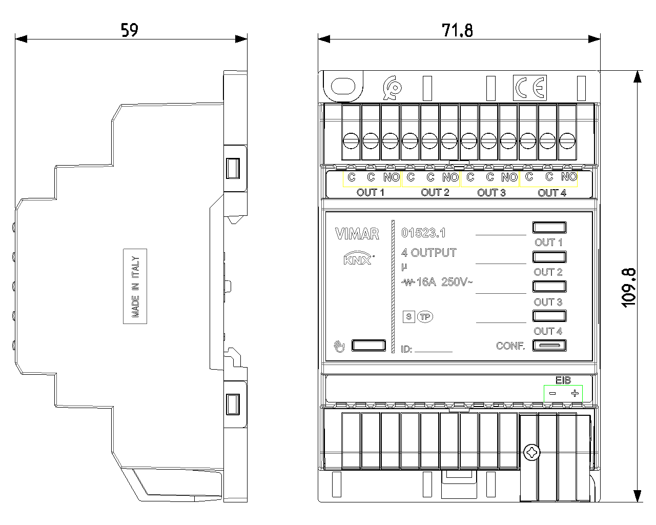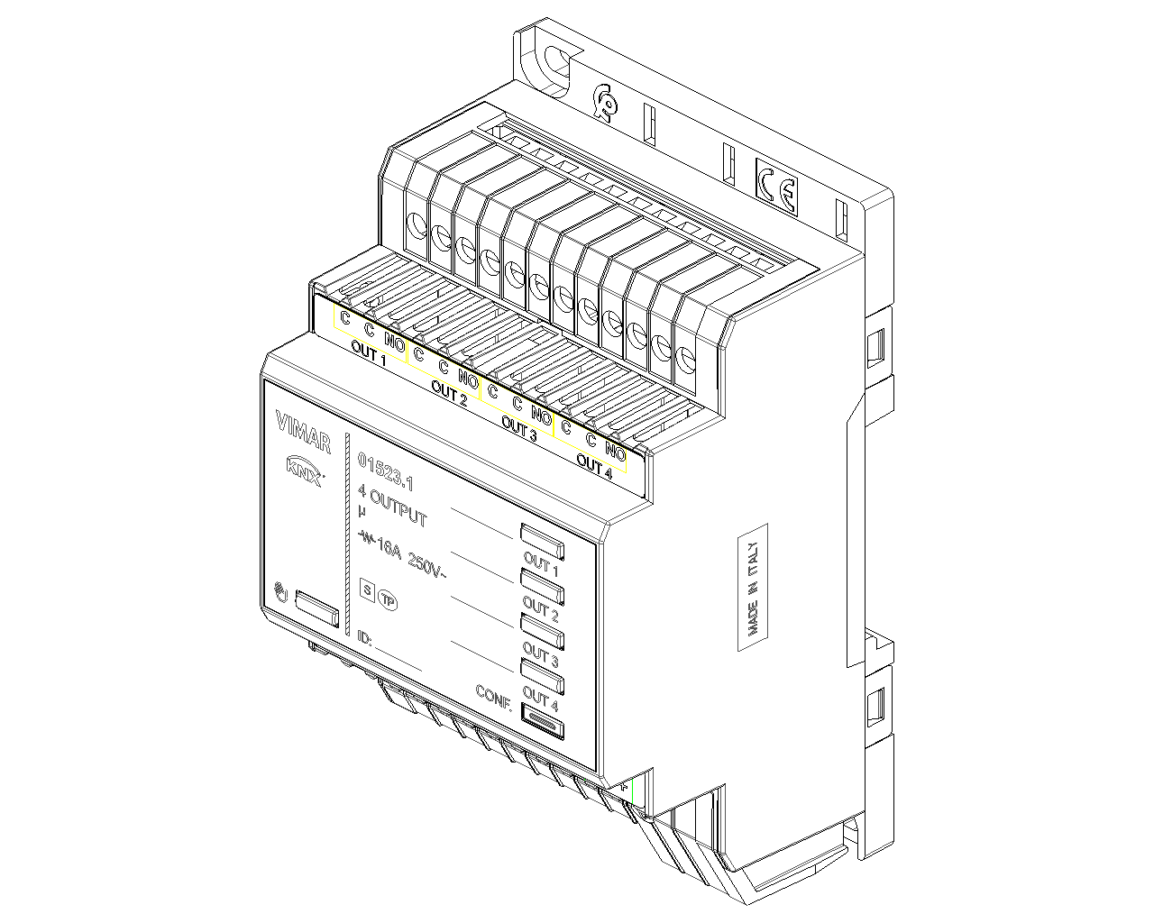 Εκκινητής με 4 εξόδους με ρελέ NO 16 A 250 V~, προγραμματιζόμενες με λειτουργία ελέγχου φώτων, ρολά με προσανατολισμό των περσίδων, πλήκτρα για τοπικό έλεγχο, πρότυπο KNX, εγκατάσταση σε οδηγό DIN (60715 TH35), με κάλυψη 4 στοιχείων των 17,5 mm