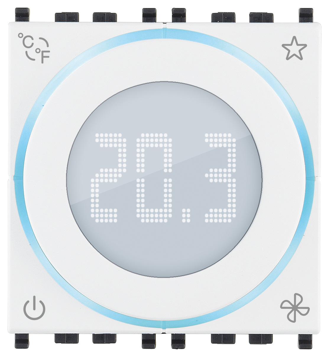 Θερμοστάτης με τροχό και έξοδο με ρελέ NO 5(2) A 240 V~, διακόπτης fan-coil με 3 ταχύτητες και αναλογικό έλεγχο, τεχνολογία IoT σύμφωνα με το πρότυπο Bluetooth technology 5.0 για την υλοποίηση συστήματος mesh View Wireless, 1 είσοδος για αισθητήρα εξωτερικής θερμοκρασίας, θέρμανση και κλιματισμός στη λειτουργία ON/OFF και PID, μηχανισμός ελέγχου θερμοκρασίας κατηγορίας I (συνεισφορά 1%) στη λειτουργία ON/OFF, κατηγορίας IV (συνεισφορά 2%) στη λειτουργία PID, οπίσθιος φωτισμός με λευκή λυχνία LED και ρύθμιση της έντασης, τροφοδοσία 100-240 V 50/60 Hz, λευκό - 2 στοιχείων. Συνδυάζεται με πλαίσια Eikon, Arké, Plana. Για τη σειρά Idea, μπορεί να εγκατασταθεί με το ειδικό στήριγμα 16723