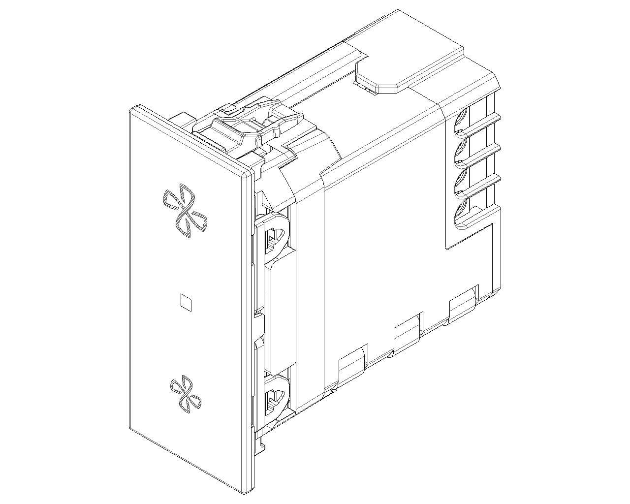 Dimmer 120 V~ 60 Hz αποκοπής κύματος για ανεμιστήρες οροφής 15-150 W, έλεγχος ON/OFF και ρύθμιση με ενσωματωμένα πλήκτρα ή από πολλά σημεία με κουμπιά NO, ρύθμιση 4 ταχυτήτων, λειτουργία Superslow, δυνατότητα εντοπισμού στο σκοτάδι, μαύρος. Η συσκευή δεν μπορεί να εγκατασταθεί σε κουτιά Isoset
