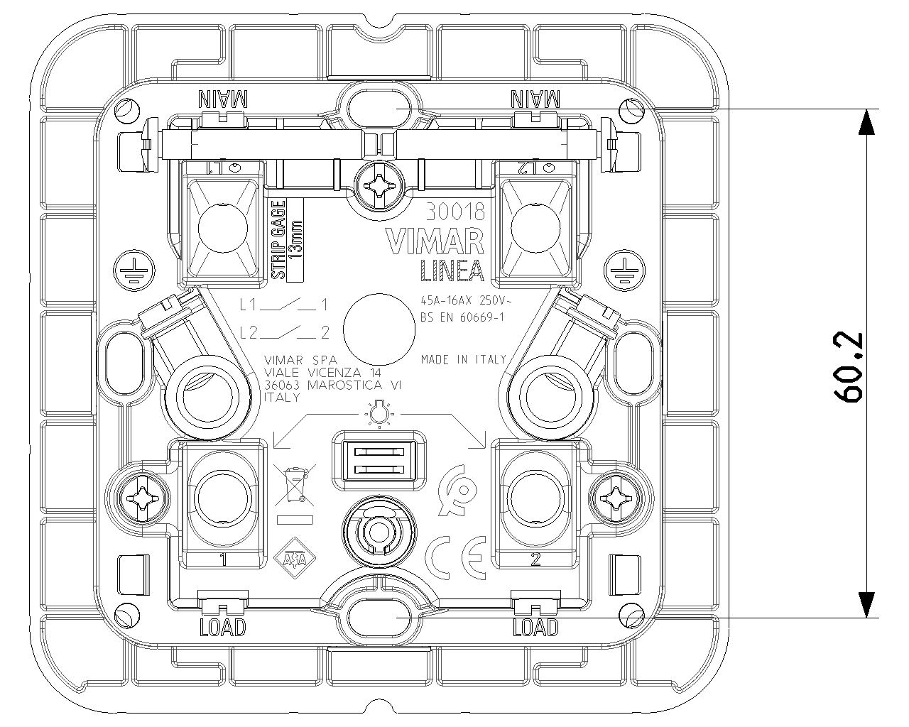 Vimar reserves the right to change at any time and without notice the characteristics of the products reported. Installation should be carried out by qualified staff in compliance with the current regulations regarding the installation of electrical equipment in the country where the products are installed. For the terms of use of the information on the product info sheet see Conditions of Use.