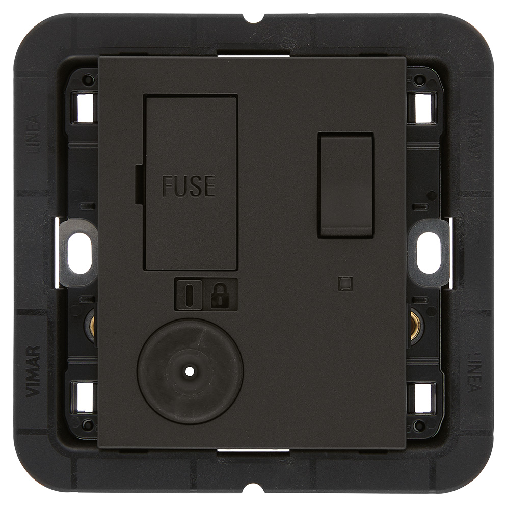 13 A 250 V~ connection unit with 2P 1-way switch with pilot light, cable output, protection fuse complete with mounting frame for installation in square BS mounting boxes, to be completed with BS 3-module cover plate, black