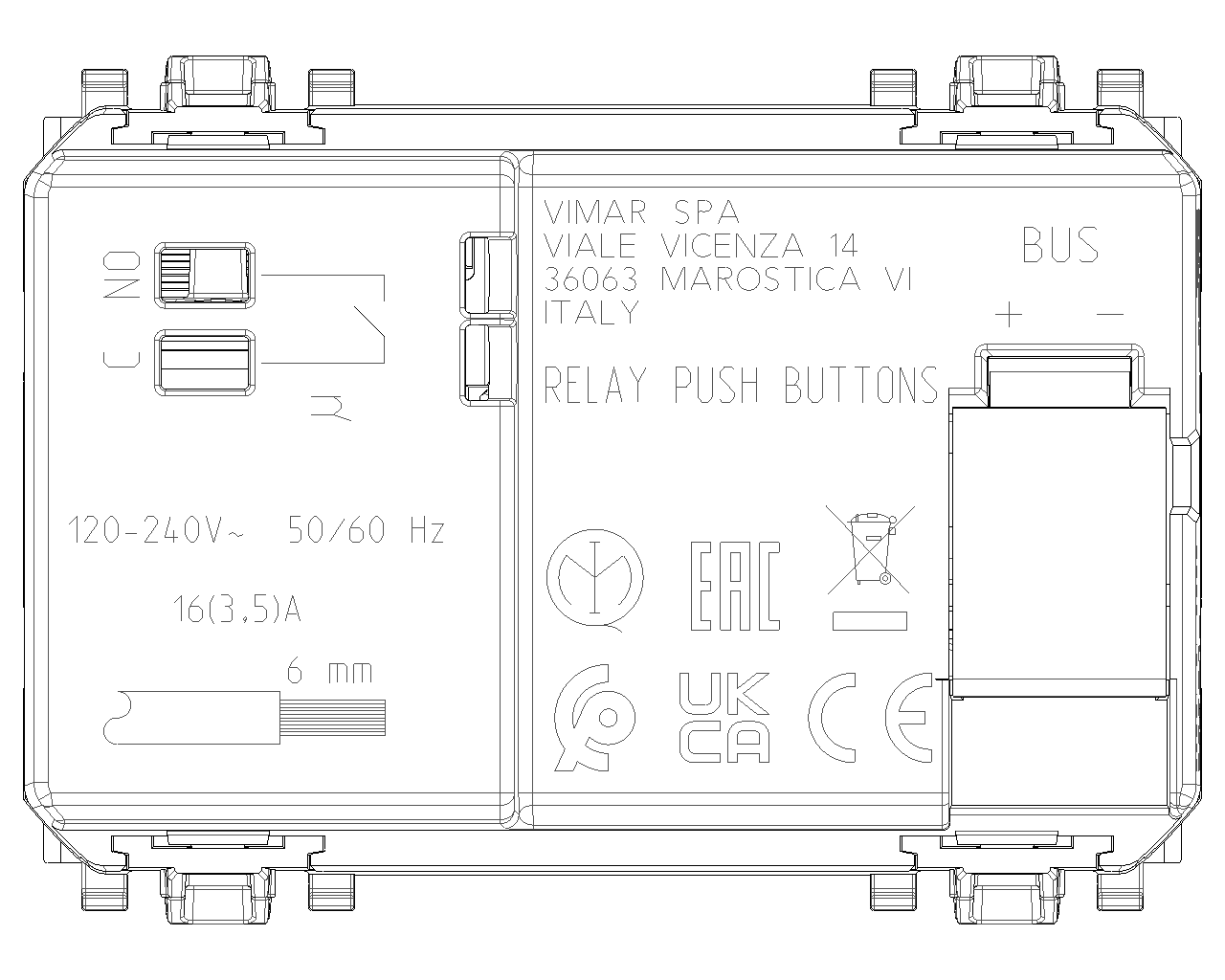 Home automation control device with six push buttons and actuator with NO relay output 16 A 120-240 V~ 50/60 Hz, RGB LED visible in darkness with brightness control, to be completed with two 1- or 2-module interchangeable half-button caps - 3 modules