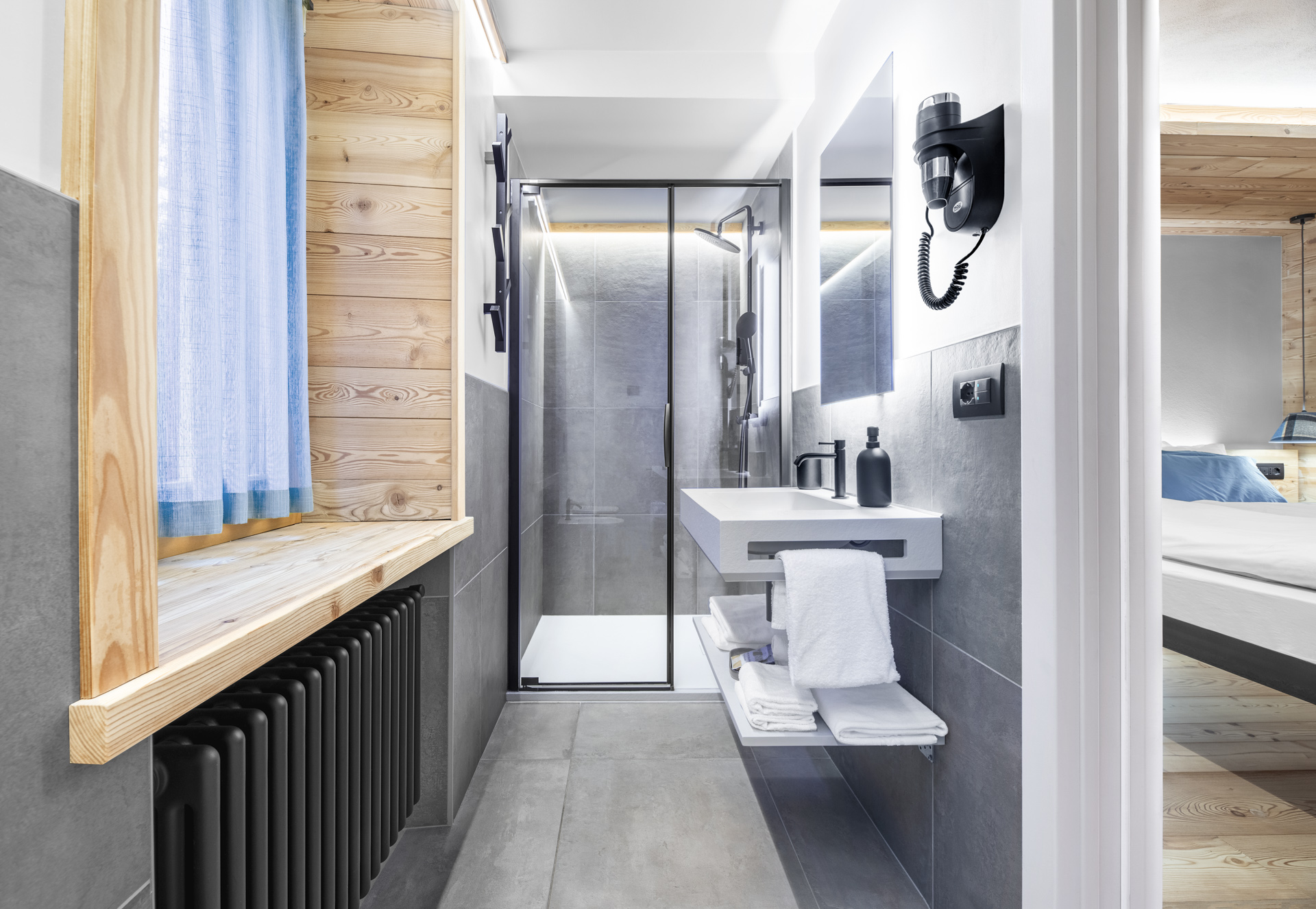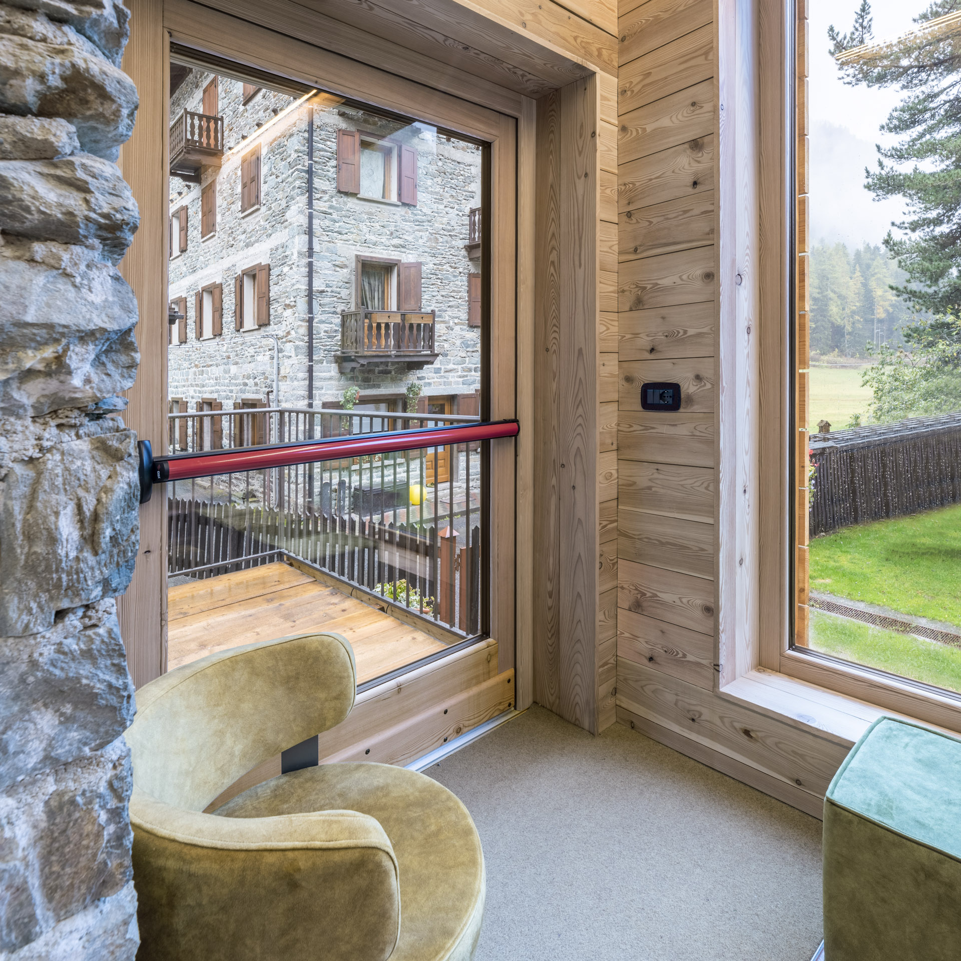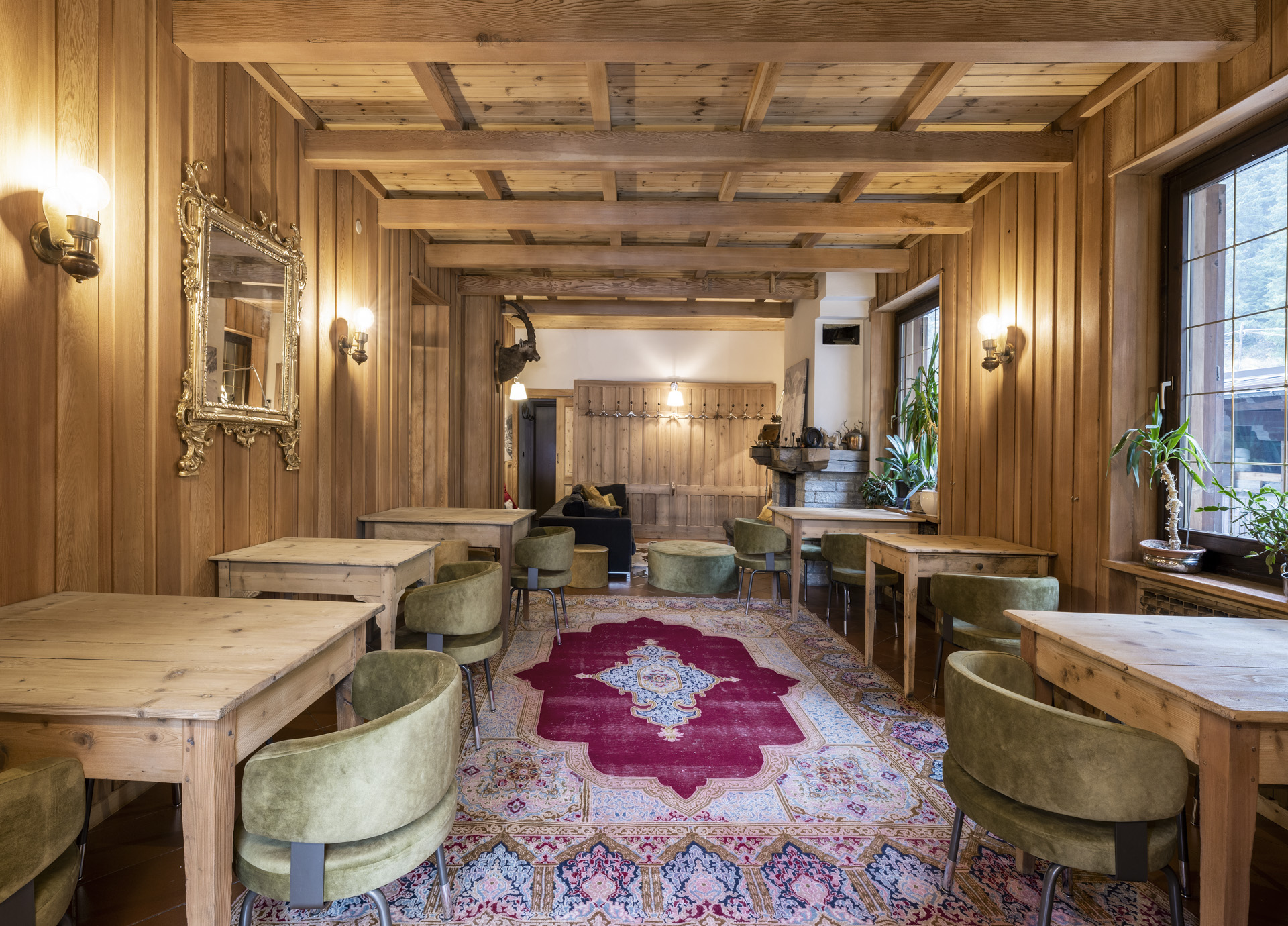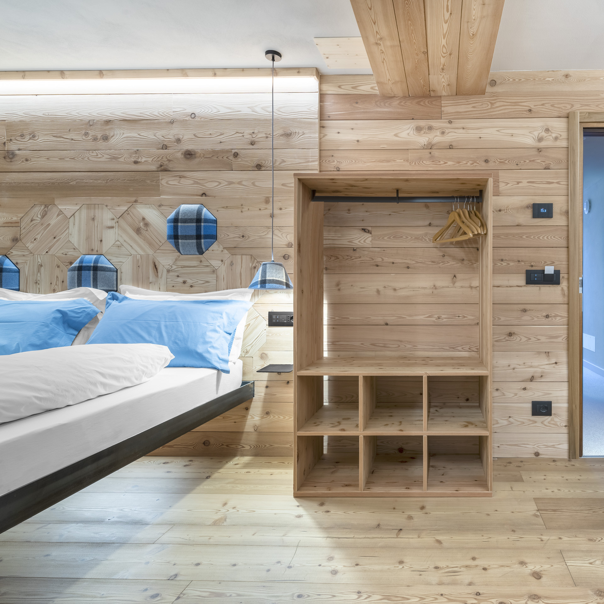 From the stone cladding to the characteristic red and white wooden balconies, whose windows afford panoramic mountain views, the height of the attic-style building arose from the need to make the best use of the steep terrain. This allowed for a sufficient number of guest rooms which, in the 1950s, began to attract visitors for winter holidays following the construction of the first ski lifts. Managed by the same family for four generations, the hotel now offers 22 rooms. While preserving the authenticity of the original structure, the hospitality floors have recently been renovated with a modern and innovative design. A striking dialogue between past and present welcomes guests. On the ground floor, the communal spaces preserve the warmth of the past, steeped in intimate atmospheres and details that evoke the history of the location. On the upper floors, the perspective shifts. With suspended beds and larch cladding, the rooms feature a sleek and contemporary design, enveloping guests in modern comfort that renews tradition through the harmonious use of natural materials and technology.