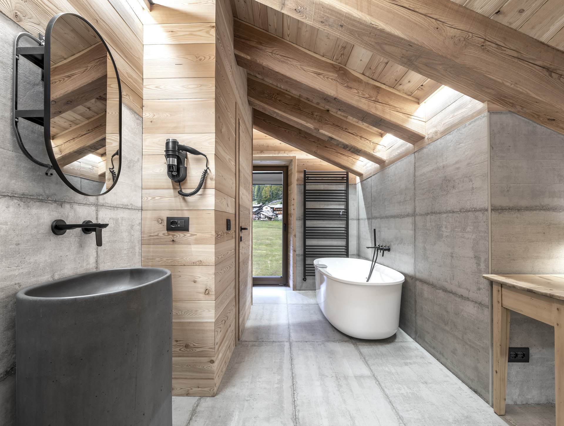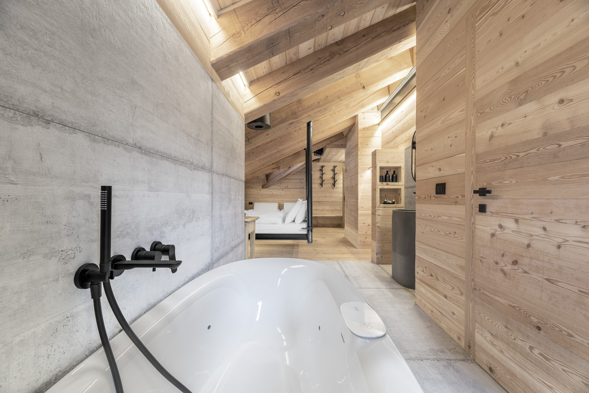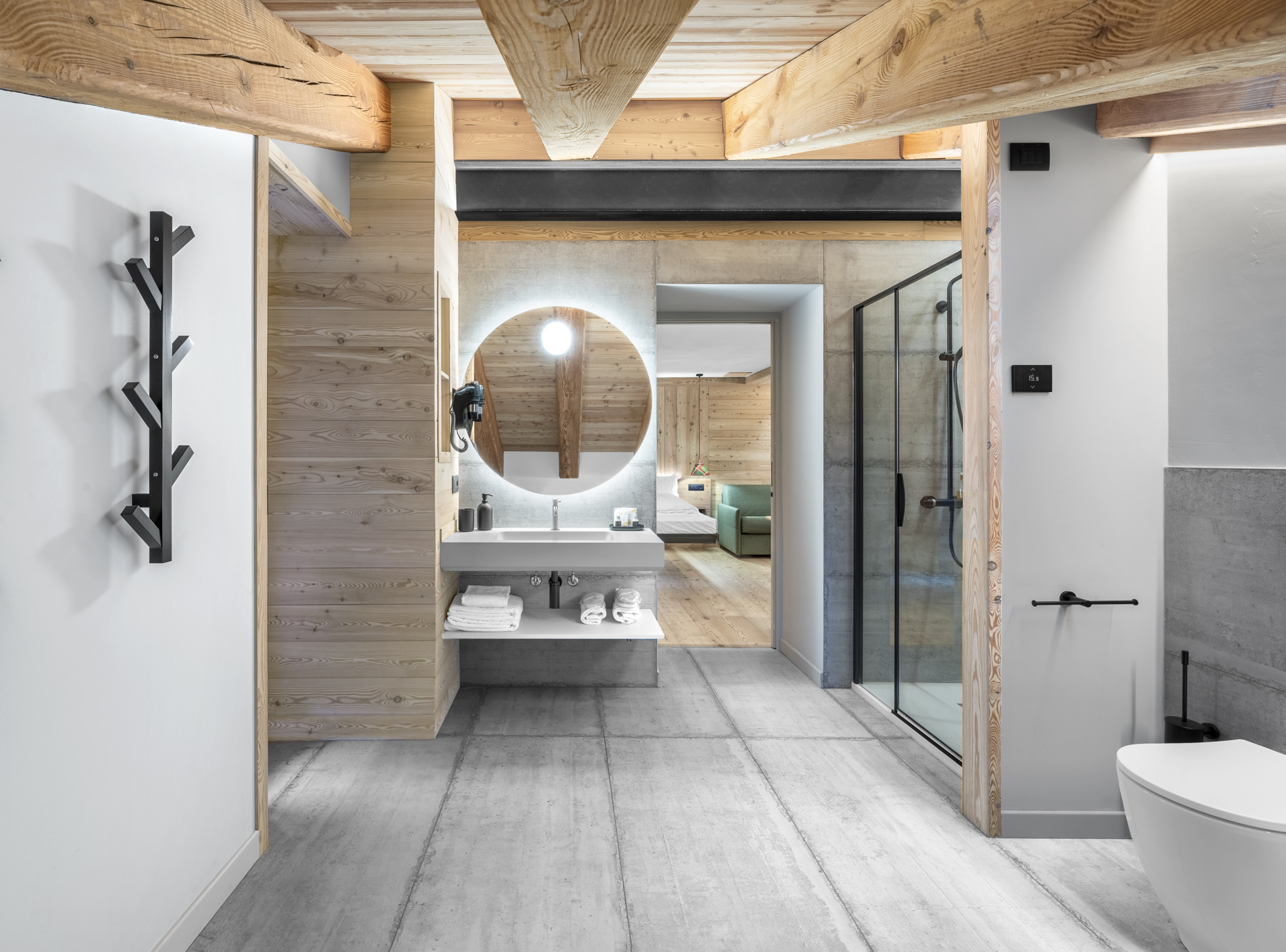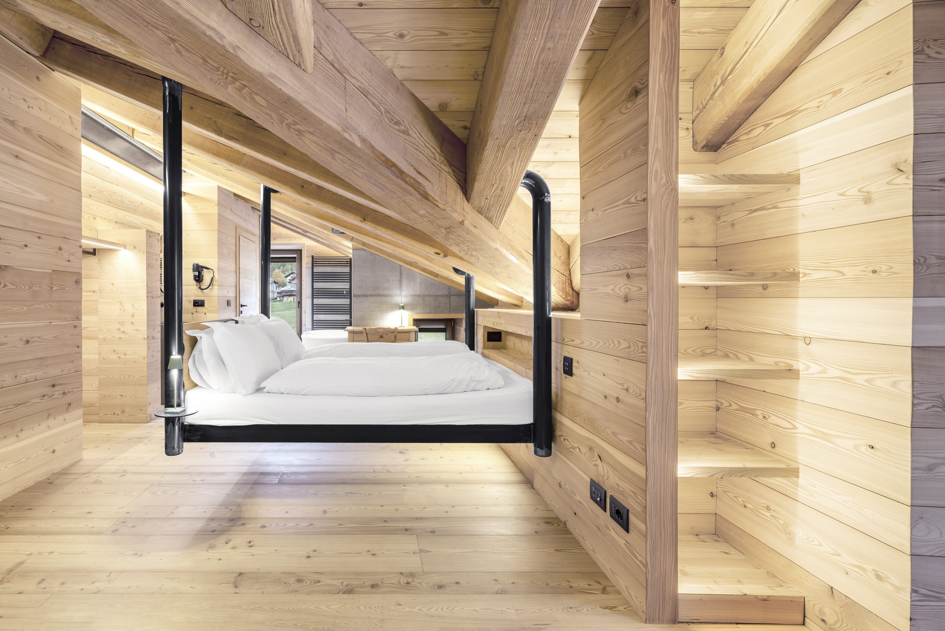 From the stone cladding to the characteristic red and white wooden balconies, whose windows afford panoramic mountain views, the height of the attic-style building arose from the need to make the best use of the steep terrain. This allowed for a sufficient number of guest rooms which, in the 1950s, began to attract visitors for winter holidays following the construction of the first ski lifts. Managed by the same family for four generations, the hotel now offers 22 rooms. While preserving the authenticity of the original structure, the hospitality floors have recently been renovated with a modern and innovative design. A striking dialogue between past and present welcomes guests. On the ground floor, the communal spaces preserve the warmth of the past, steeped in intimate atmospheres and details that evoke the history of the location. On the upper floors, the perspective shifts. With suspended beds and larch cladding, the rooms feature a sleek and contemporary design, enveloping guests in modern comfort that renews tradition through the harmonious use of natural materials and technology.
