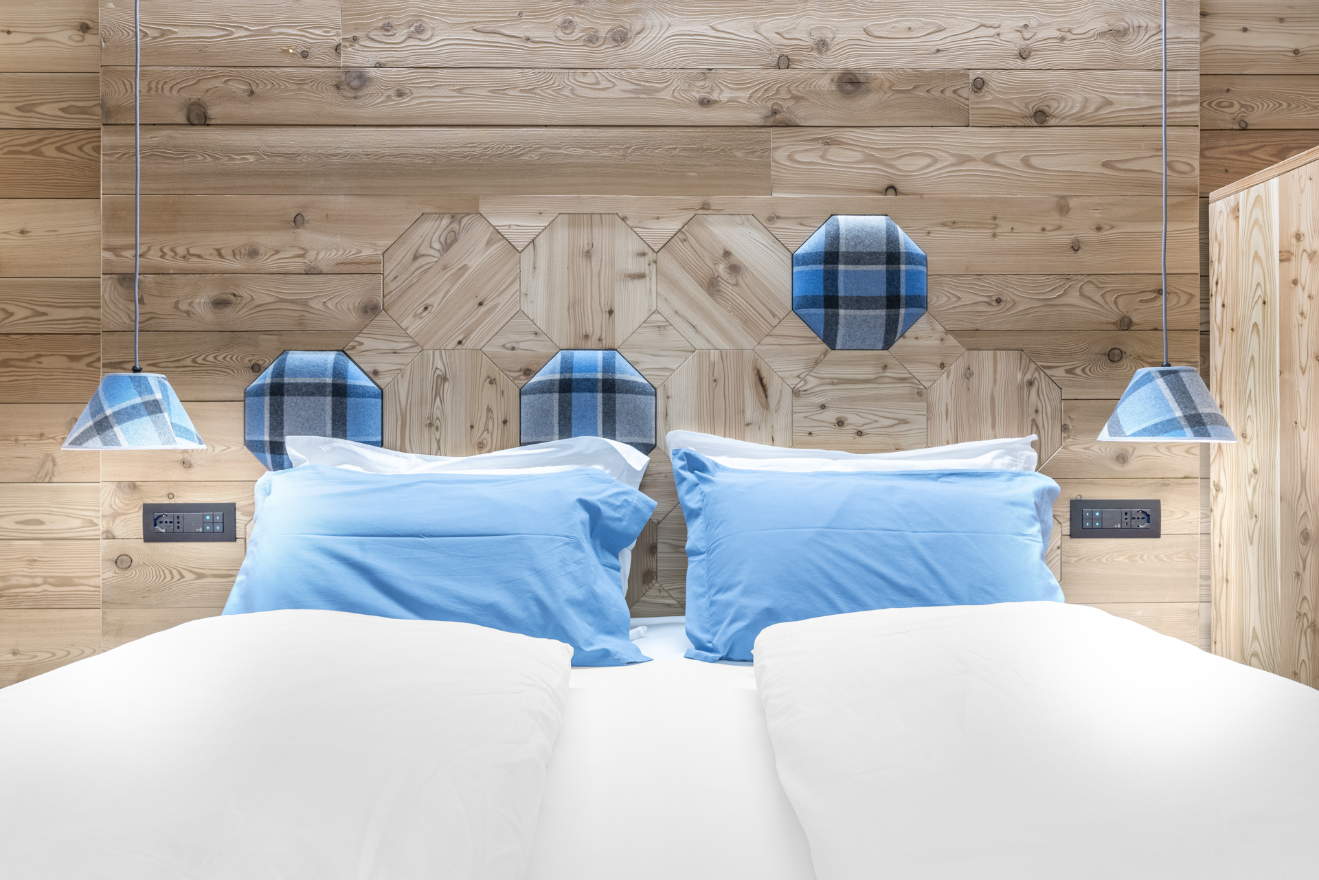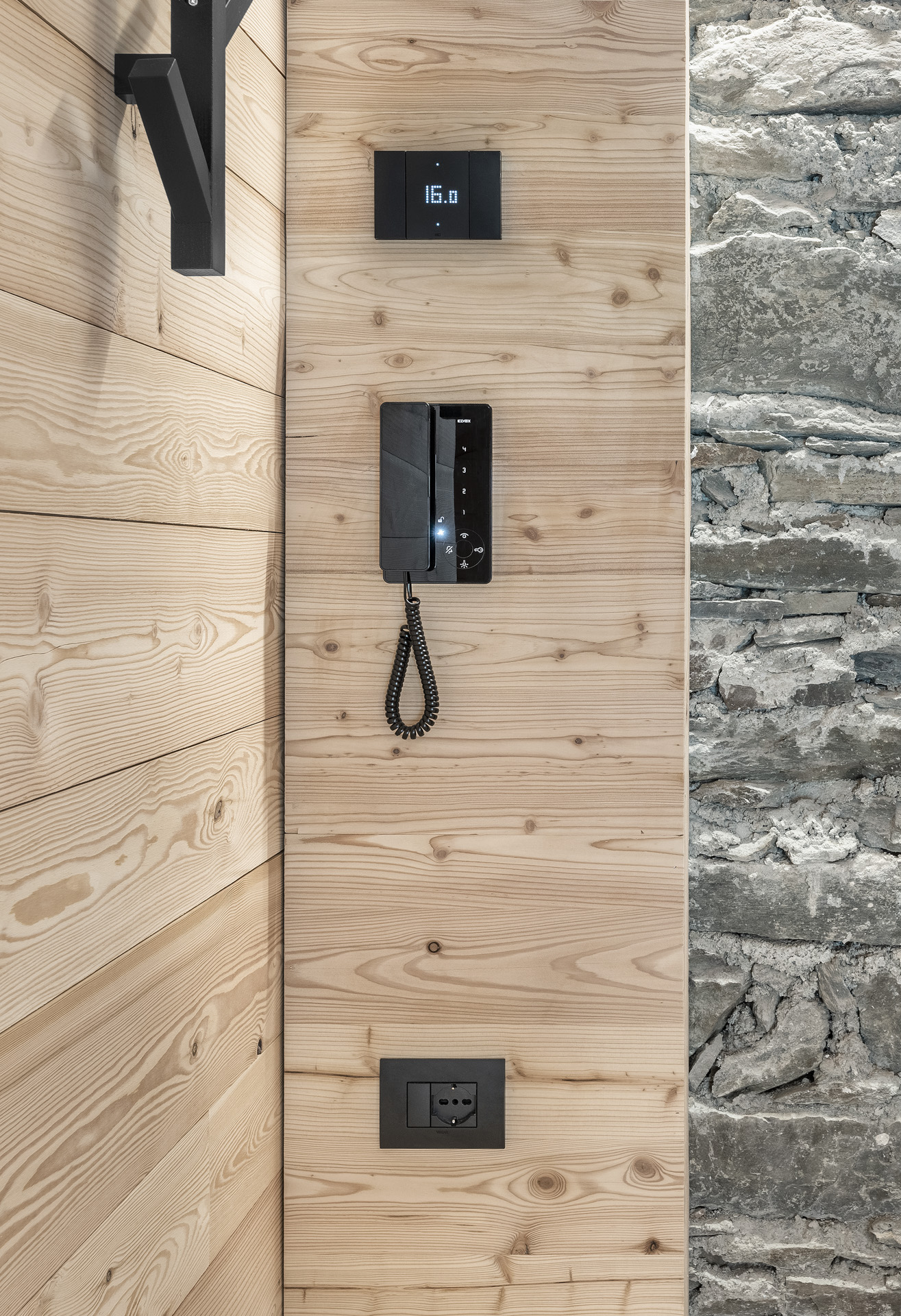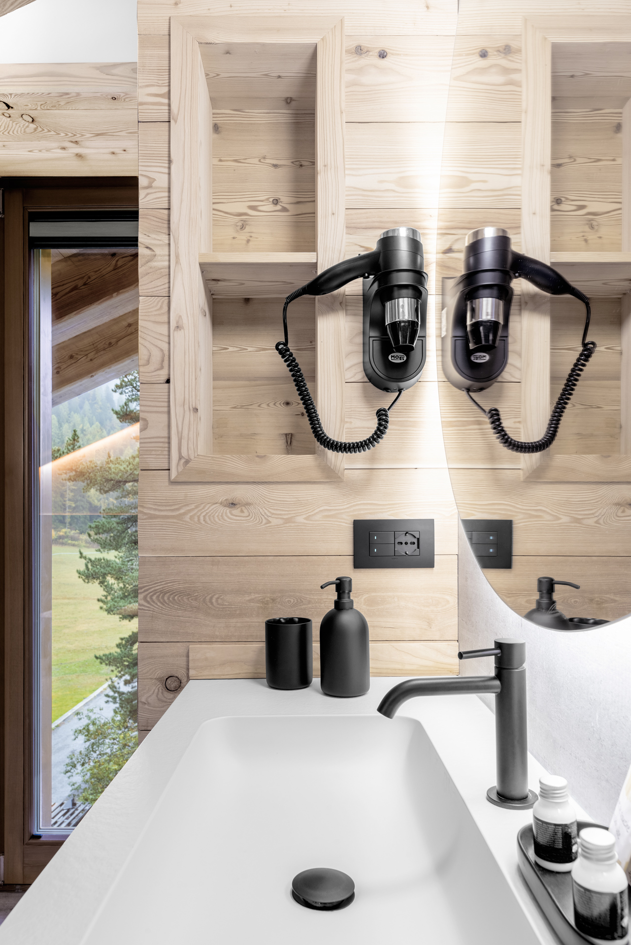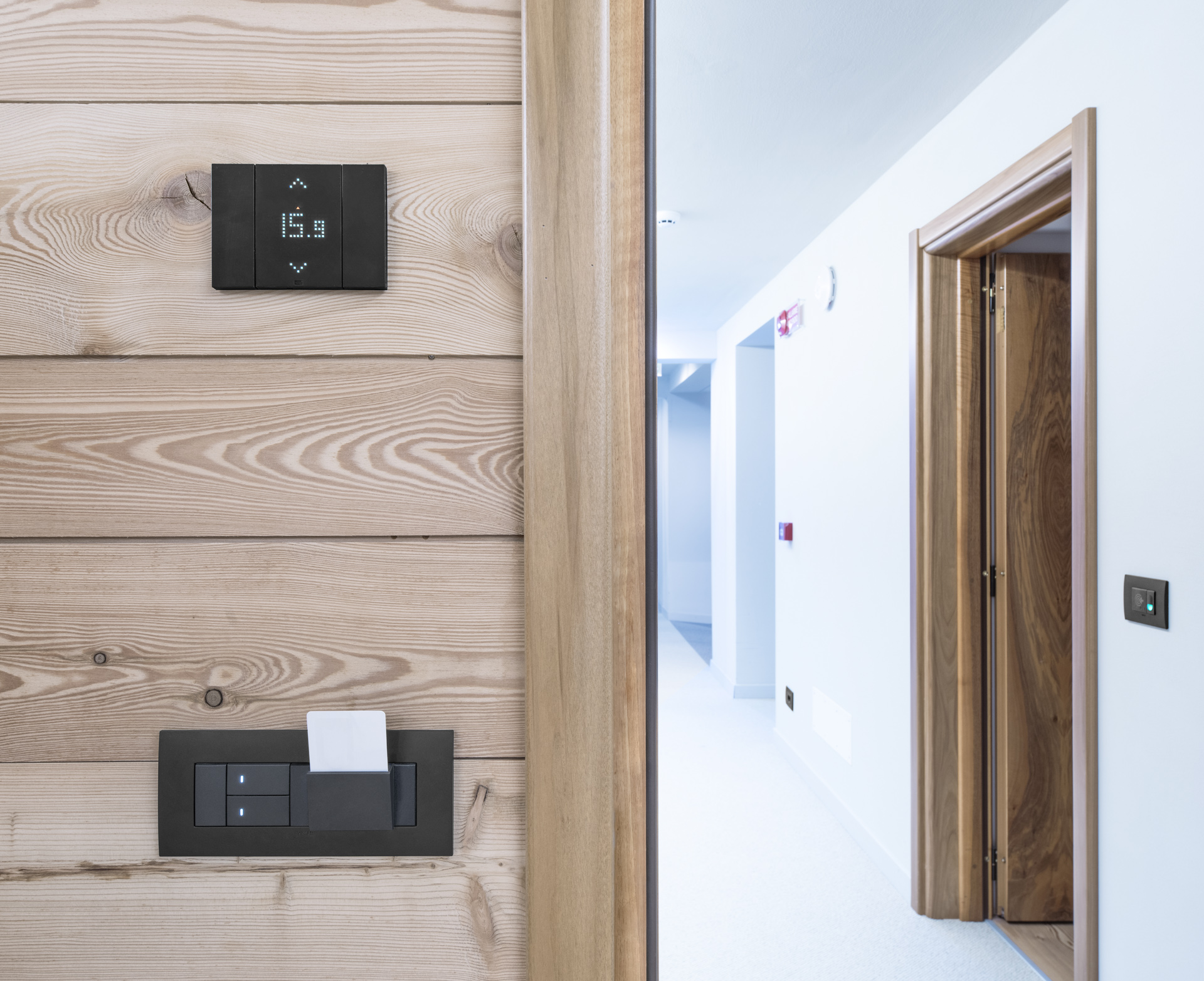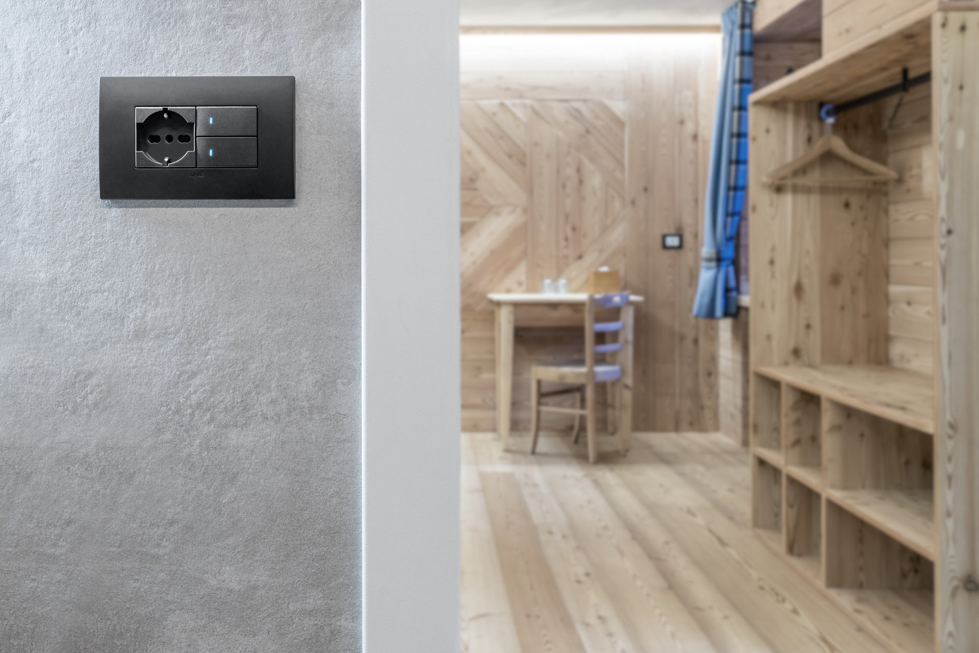 It is precisely in this context that Vimar plays a key role, offering a concrete example of system integration. Specifically, the By-me Plus home automation system was chosen synergistically to manage lighting, temperature control and electricity consumption. Completing the installation is the multisensor from the Linea XT Platform in black, which incorporates controls for climate management, along with thermostat and humidistat functions. Equipped with four sensors and an LED matrix for monitoring environmental parameters, the device allows for the detection of internal and external temperature, relative humidity, and air quality. Inside the rooms, a card inserted into the transponder pocket activates the utilities (lights, current socket outlets, and climate control). Through the system, this choice not only optimises the climate control and lighting balance for ideal energy savings, but it also promotes sustainable well-being by preventing unnecessary waste. This technology ensures completely matching styling throughout. At the Hotel Monte Cervino, the Arké Classic wiring series in the total look black version, featuring a linear profile and sharp corners, integrates elegantly with the wooden wall cladding.