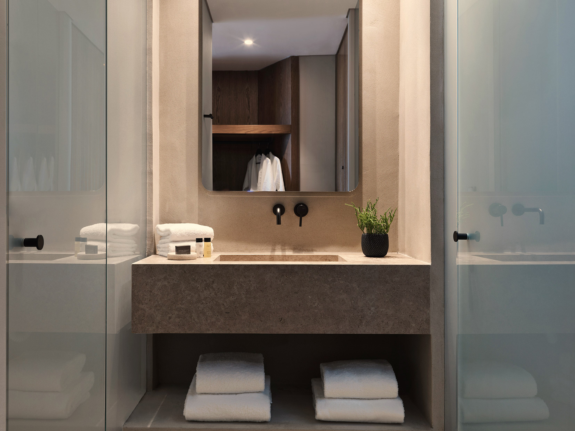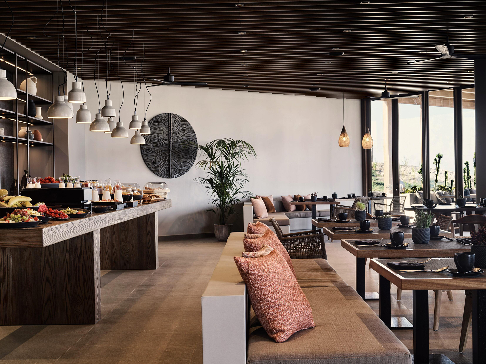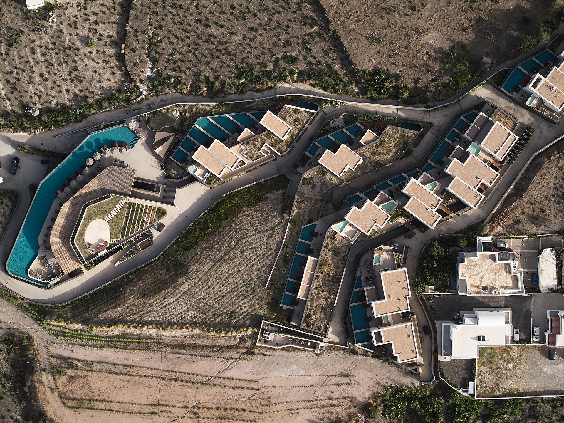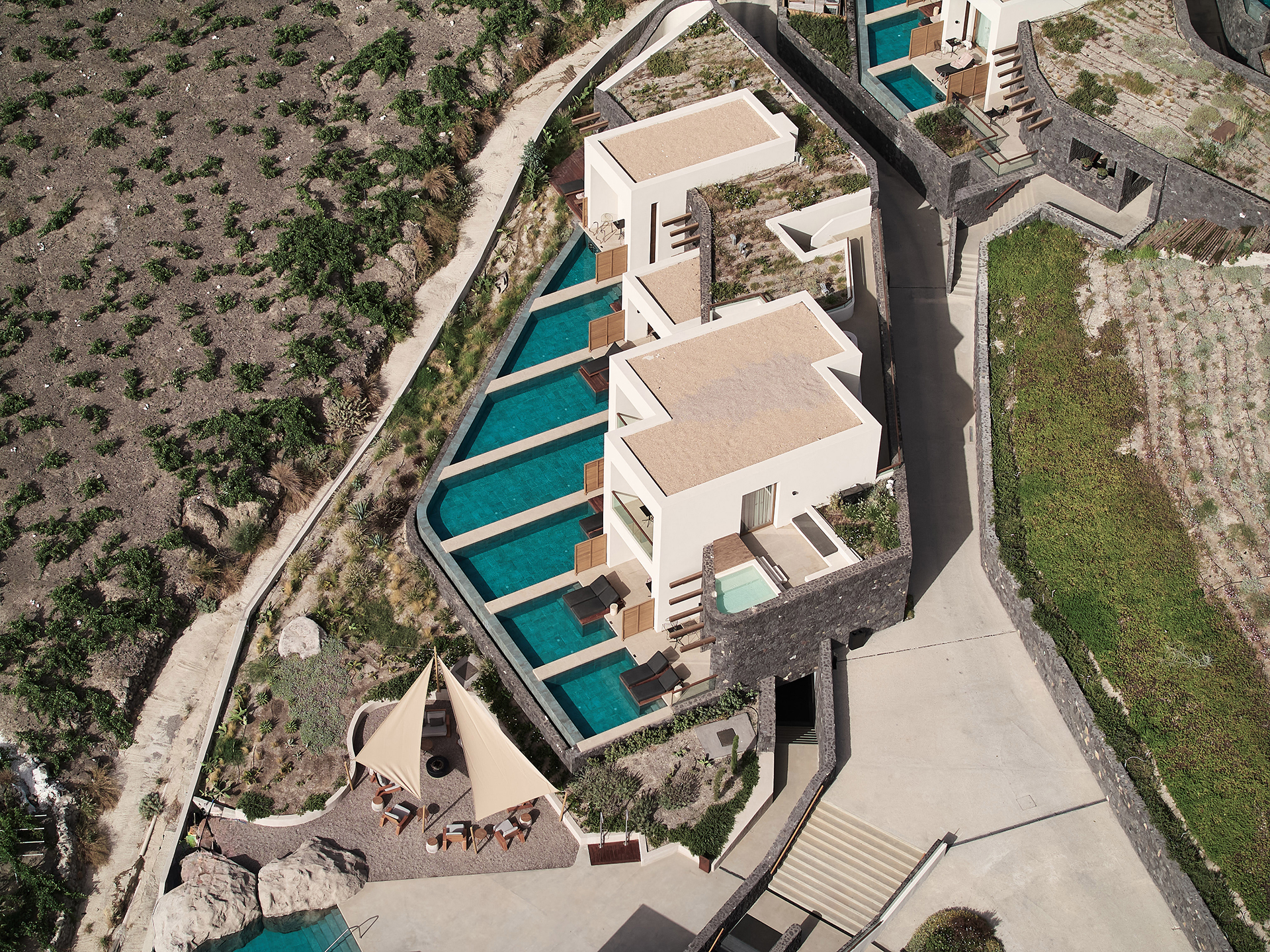 Boasting 59 rooms and suites overlooking the Aegean Sea, the resort offers breathtaking views, private pools, and an atmosphere of absolute peace and quiet, nestled among lush vineyards. The architecture is inspired by traditional dwellings, reinterpreted with a contemporary twist through white geometric volumes and volcanic stone cladding. Communal areas, such as the spa and reception, are cleverly integrated into underground spaces, helping to maintain a discreet and respectful dialogue with the natural landscape.