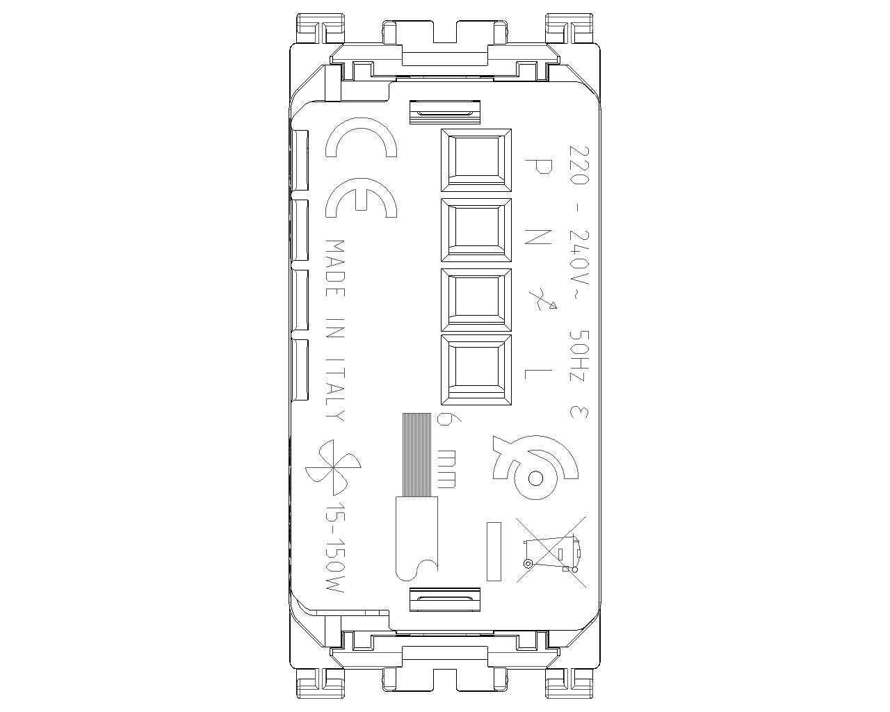Variador de 220 - 240 V~ 50/60 Hz con corte de fase para ventiladores de 15-150 W, mando ON/OFF y regulación con pulsadores incorporados o desde varios puntos con pulsadores NO, regulación de 4 velocidades, función Superslow, visibilidad en la oscuridad, blanco. Aparato no instalable en cajas Isoset