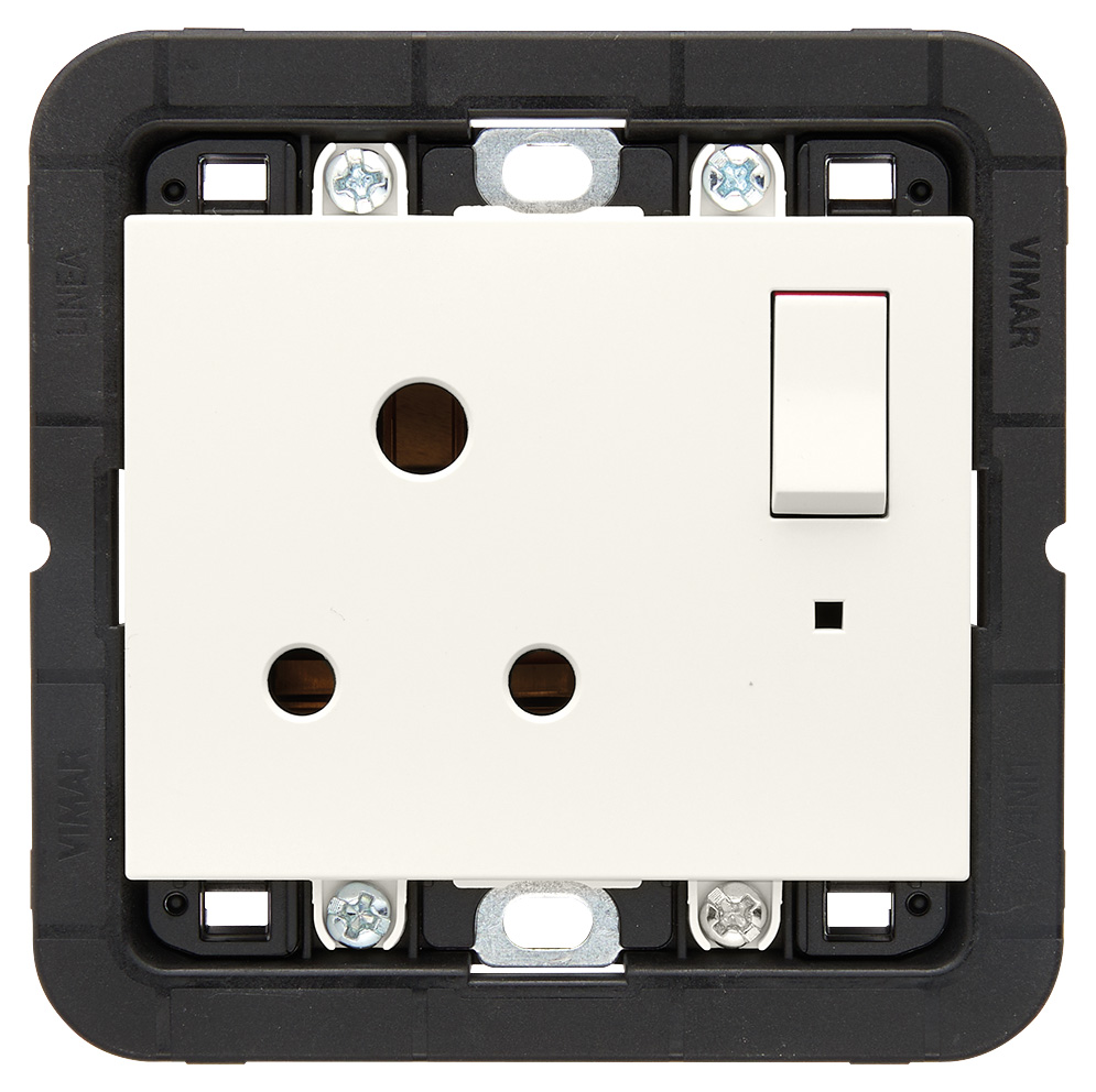 Toma de corriente SICURY 2P+T, 5 A y 250 V~, estándar inglés, con interruptor 2P y soporte para montaje en cajas cuadradas BS, se completa con placa de 3 módulos BS, blanco