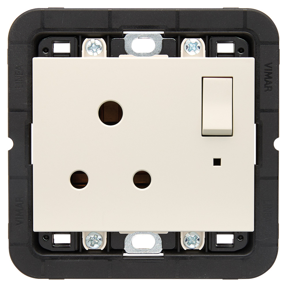 Toma de corriente SICURY 2P+T 5 A 250 V~, estándar inglés, con interruptor 2P y soporte para montaje en cajas cuadradas BS, se completa con placa de 3 módulos BS, hueso