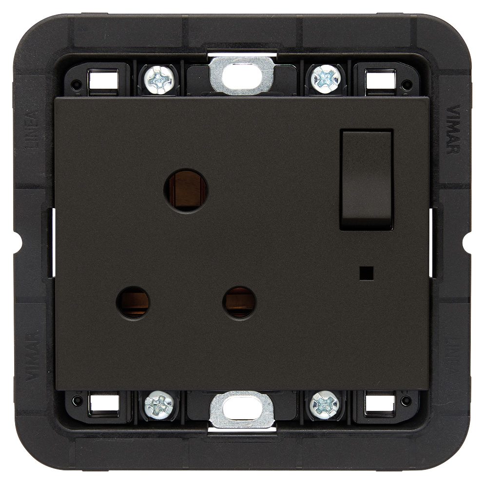 Toma de corriente SICURY 2P+T 5 A 250 V~, estándar inglés, con interruptor 2P y soporte para montaje en cajas cuadradas BS, se completa con placa de 3 módulos BS, negro