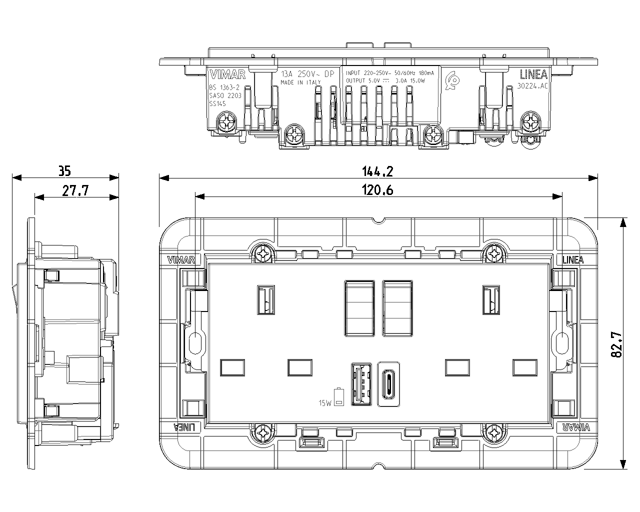 2tomas 2P+T13ABS+interr.rojo+USB A/C bla