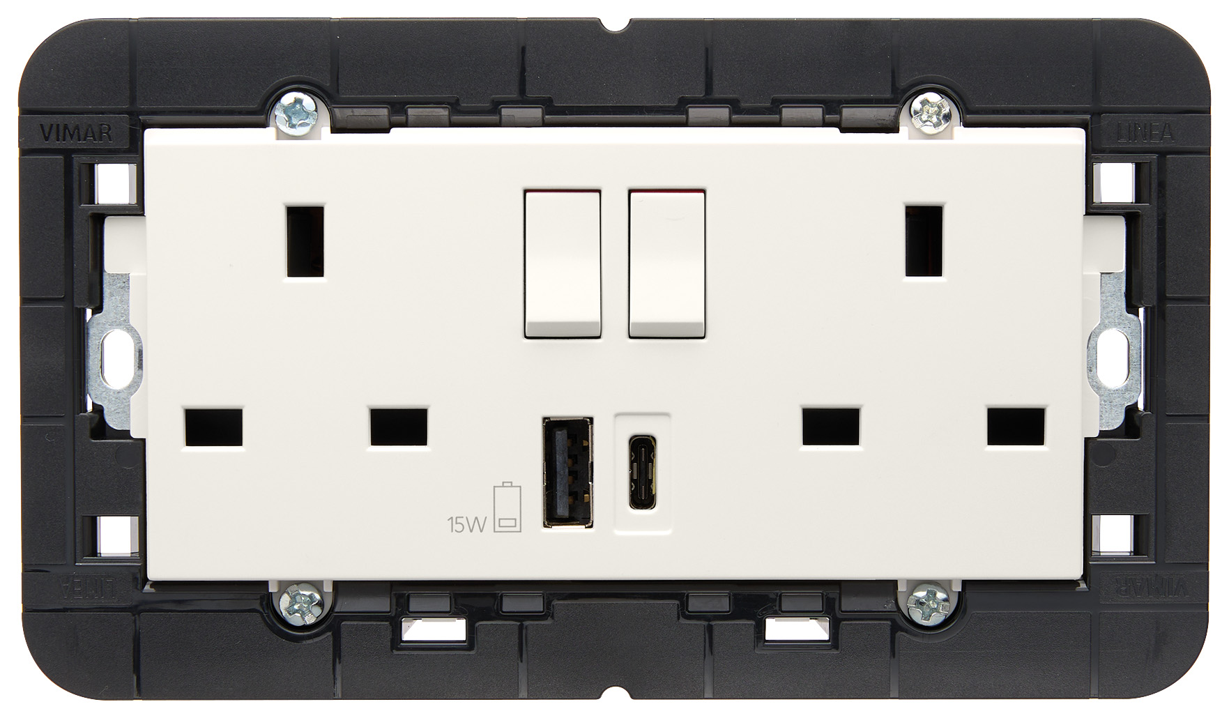 Dos tomas de corriente SICURY 2P+T 13 A 250 V~ estándar inglés con dos interruptores 2P con marca roja, alimentador USB 15 W 3 A 5 V con 1 salida USB tipo A y 1 salida USB tipo C optimizadas para cargar 2 dispositivos a la vez (por ejemplo, tablet, smartphone), y con soporte para montaje en cajas rectangulares BS, se completan con placa de 5 módulos BS, blanco