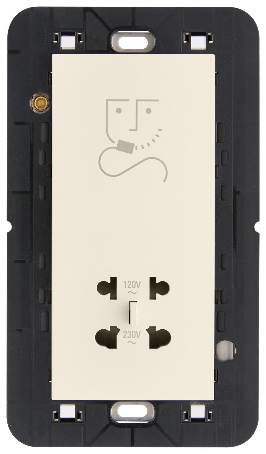 Toma de corriente para afeitadoras con transformador de aislamiento 20 VA, alimentación 230 V~ 50-60 Hz, salida 120/230 V~, con soporte para montaje en cajas rectangulares BS, se completa con placa de 5 módulos BS, hueso
