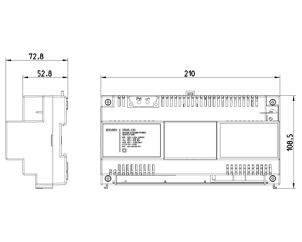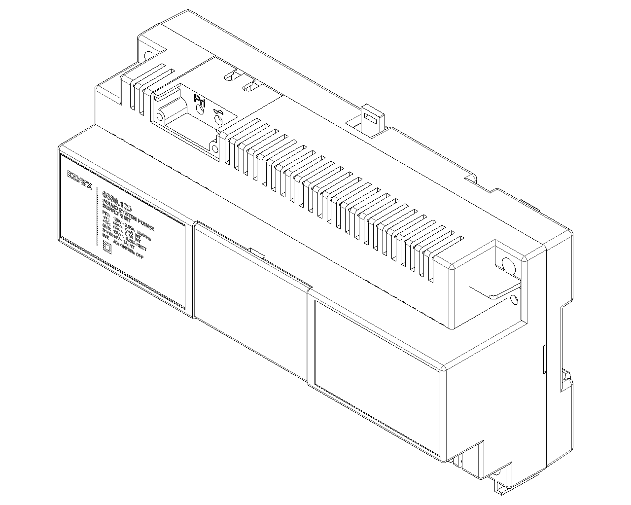 Alimentador para videoporteros Sound System con salida 13 Vcc, 15 V, 18 Vcc, alimentación 120 V~ 50/60 Hz 60 VA, instalación en riel DIN (60715 TH35), ocupa 12 módulos de 17,5 mm