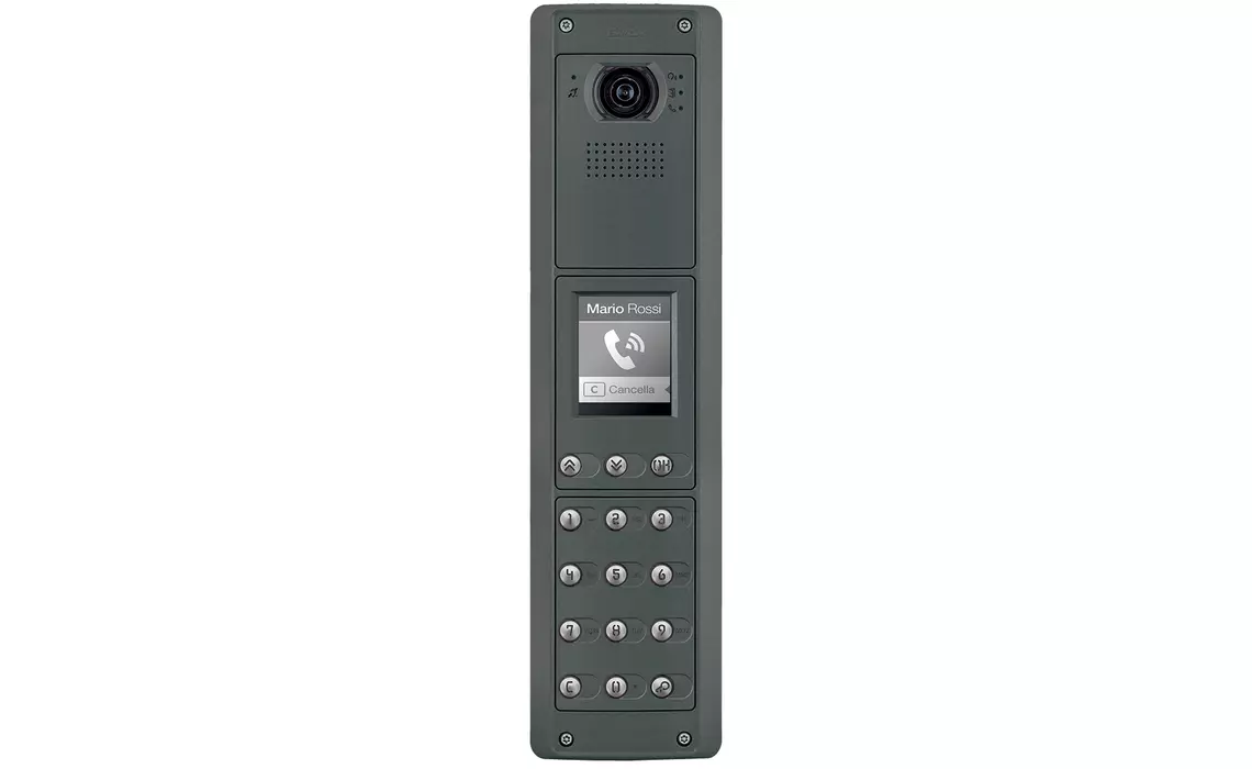 Es modulable con unidades electrónicas Due Fili Plus audio, audio/vídeo, audio/vídeo gran angular, con pantalla LCD en color de 3,5” y teclado alfanumérico. Esta modularidad permite ampliar la placa hasta alcanzar un máximo de 84 pulsadores, para satisfacer cualquier necesidad de montaje.