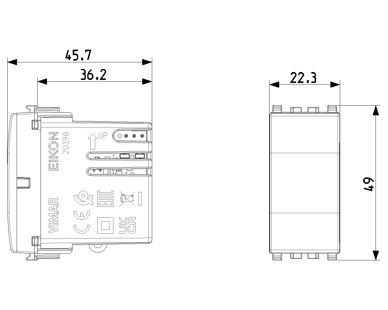 Vimar se réserve le droit de modifier les caractéristiques des produits à tout moment et sans préavis. L'installation doit être confiée à des techniciens qualifiés et exécutée conformément aux dispositions qui régissent l'installation du matériel électrique en vigueur dans le pays concerné. Pour les conditions d'utilisation des informations données sur la fiche produit, consulter Conditions d'utilisation.