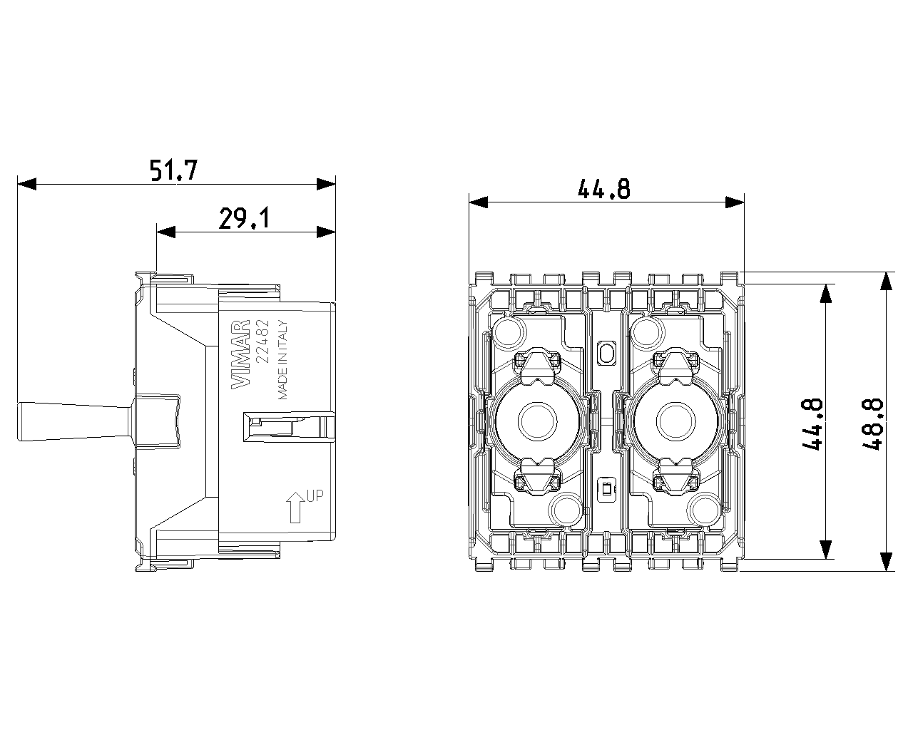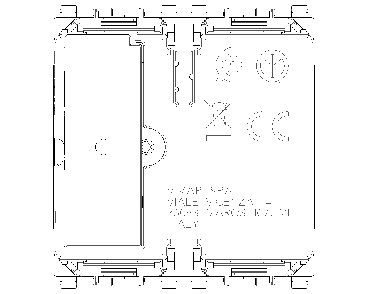 Vimar se réserve le droit de modifier les caractéristiques des produits à tout moment et sans préavis. L'installation doit être confiée à des techniciens qualifiés et exécutée conformément aux dispositions qui régissent l'installation du matériel électrique en vigueur dans le pays concerné. Pour les conditions d'utilisation des informations données sur la fiche produit, consulter Condizioni di utilizzo.