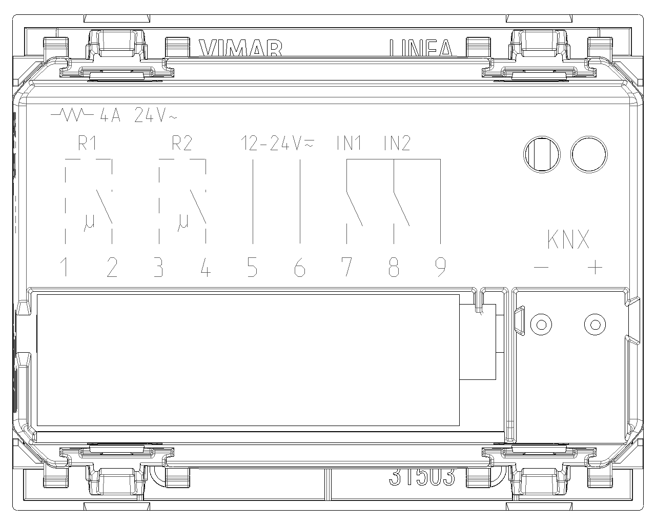 Lecteur de carte à transpondeur avec poche verticale pour l'installation à l'intérieur d'une pièce, standard KNX, 2 sorties à relais NO 4 A 24 V~, 2 entrées, alimentation 12-24 V~ 50-60 Hz et 12-24 Vcc (TBTS), noir - 3 modules