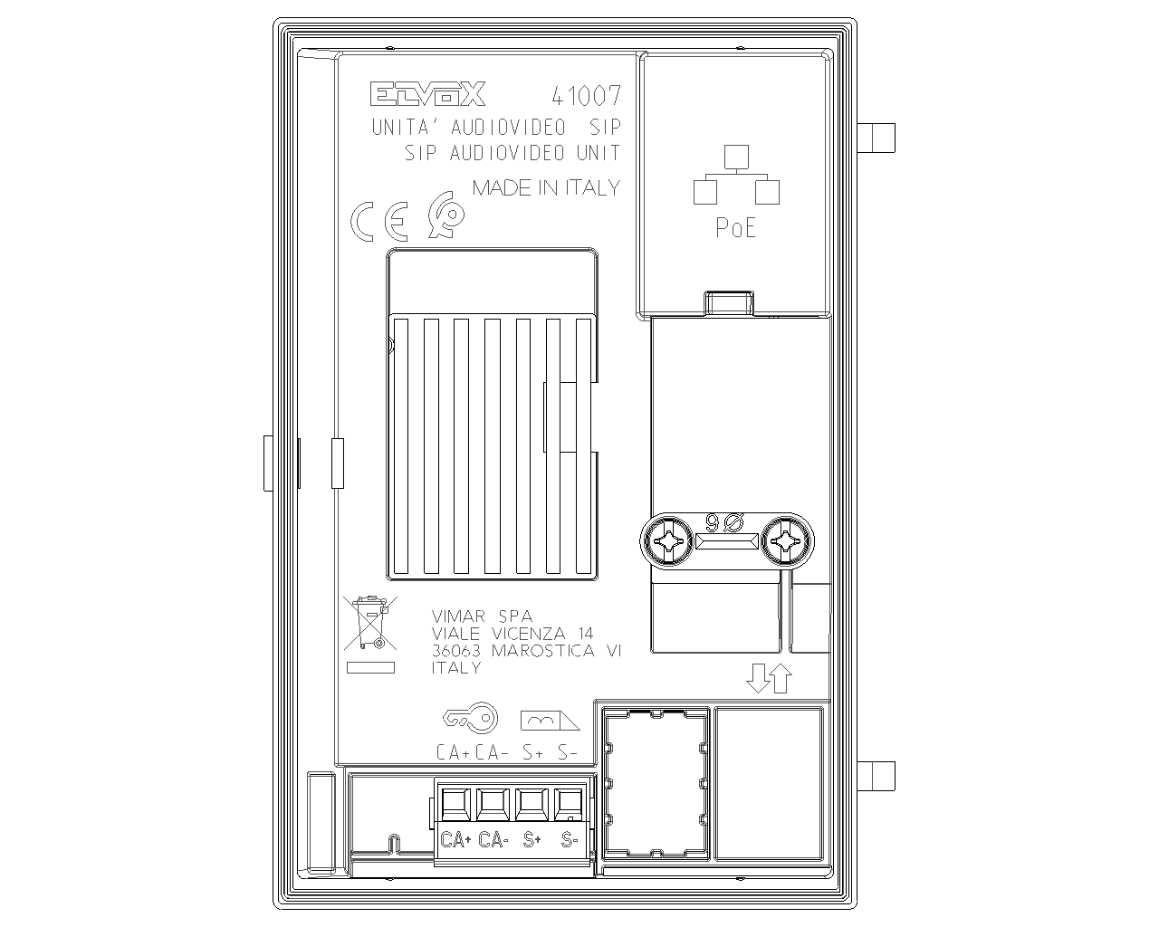 Unité électronique SIP pour platine audio-vidéo, caméra couleurs grand angle, réglage automatique de l’éclairage du champ visuel, annulation d'écho, réglage automatique de la balance audio, contrôle automatique du niveau du haut-parleur, contrôle automatique du niveau du micro, téléboucle pour prothèses auditives, 4 poussoirs d'appel rétroéclairés par LEDs blanches avec gestion crépusculaire de l'éclairage, LED de signalisation de l'état d'appel, 1 sortie pour ouverture directe de l’électroserrure connectée aux bornes S+ et S-, 1 entrée programmable pour la connexion d’un poussoir pour la commande d’ouverture gâche connectée aux bornes CA+ et CA-, ou pour un capteur d’état de la porte, à compléter avec façade audio/vidéo et touche simple, double ou obturateur, alimentation PoE