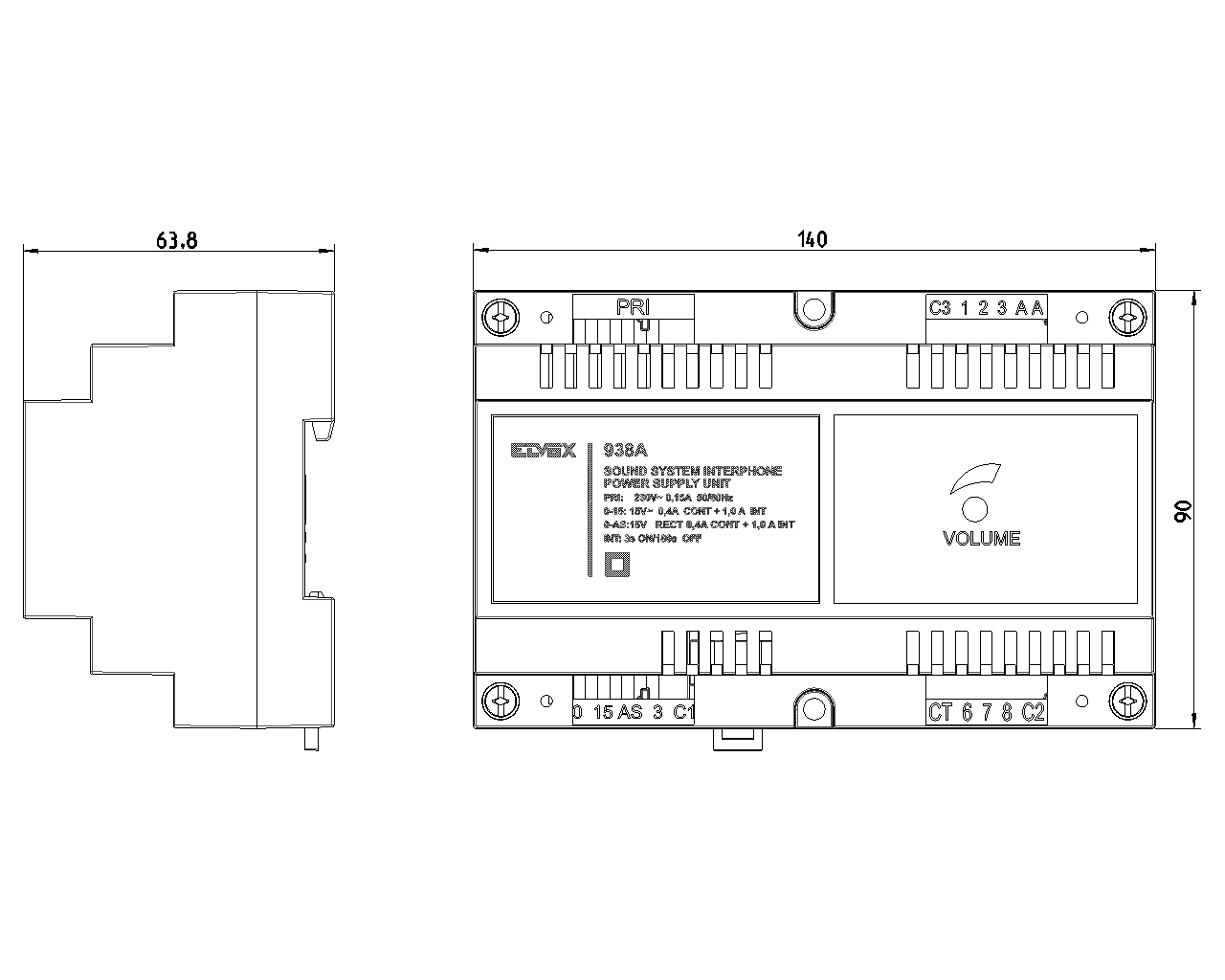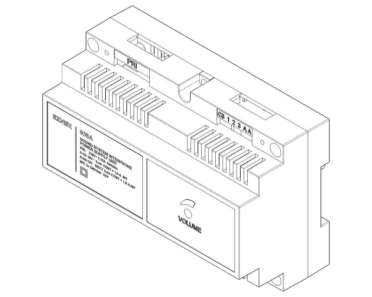 Alimentation pour portiers Sound System avec sortie 15 V, alimentation 230 V~ 50/60 Hz 55 VA, fonction appel sur platine, avec triple générateur de note pour appels depuis la platine de rue, palier et intercommunicants, pour unités électroniques 0930/000.04 et 930A, installation sur rail DIN (60715 TH35), occupe 8 modules de 17,5 mm
