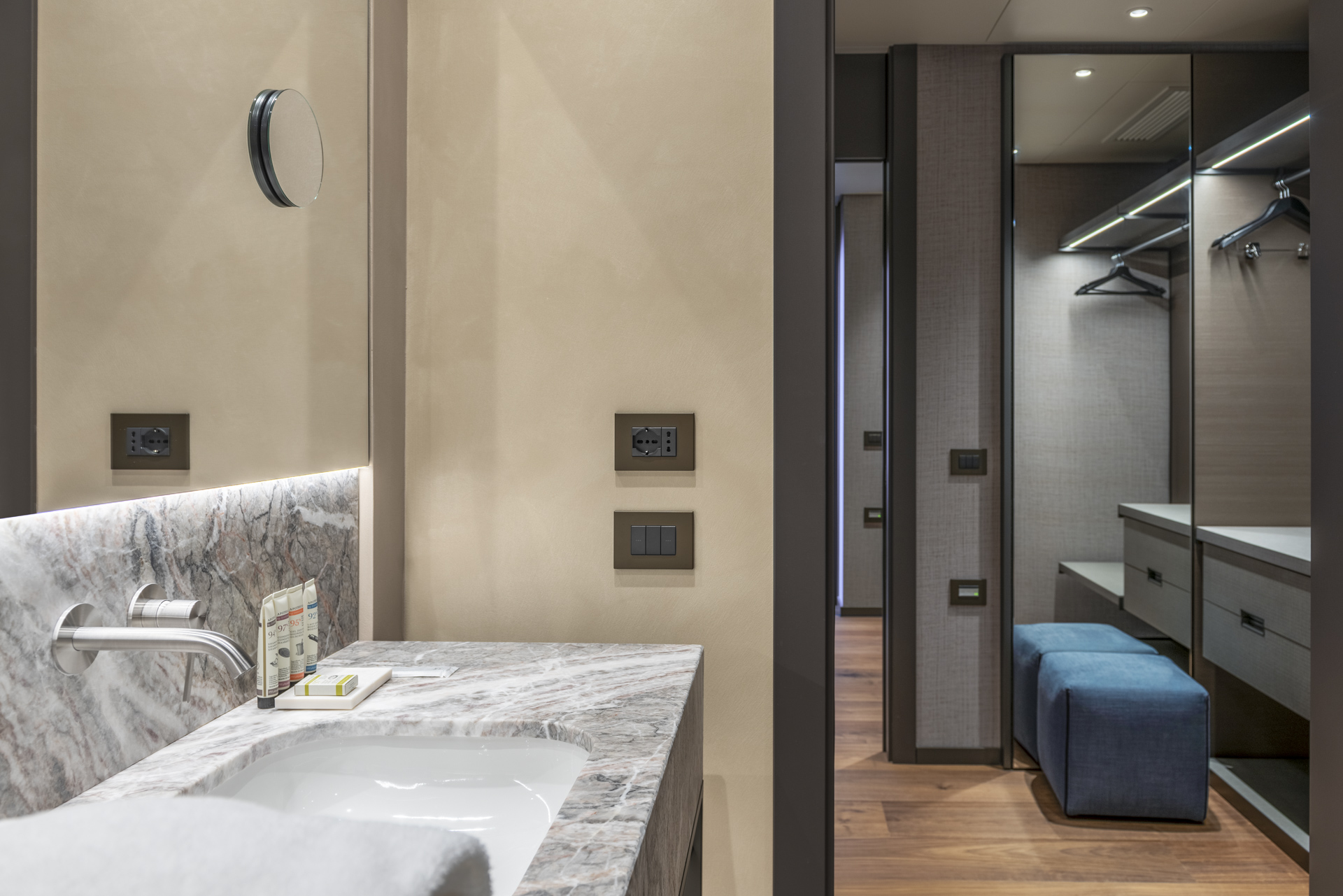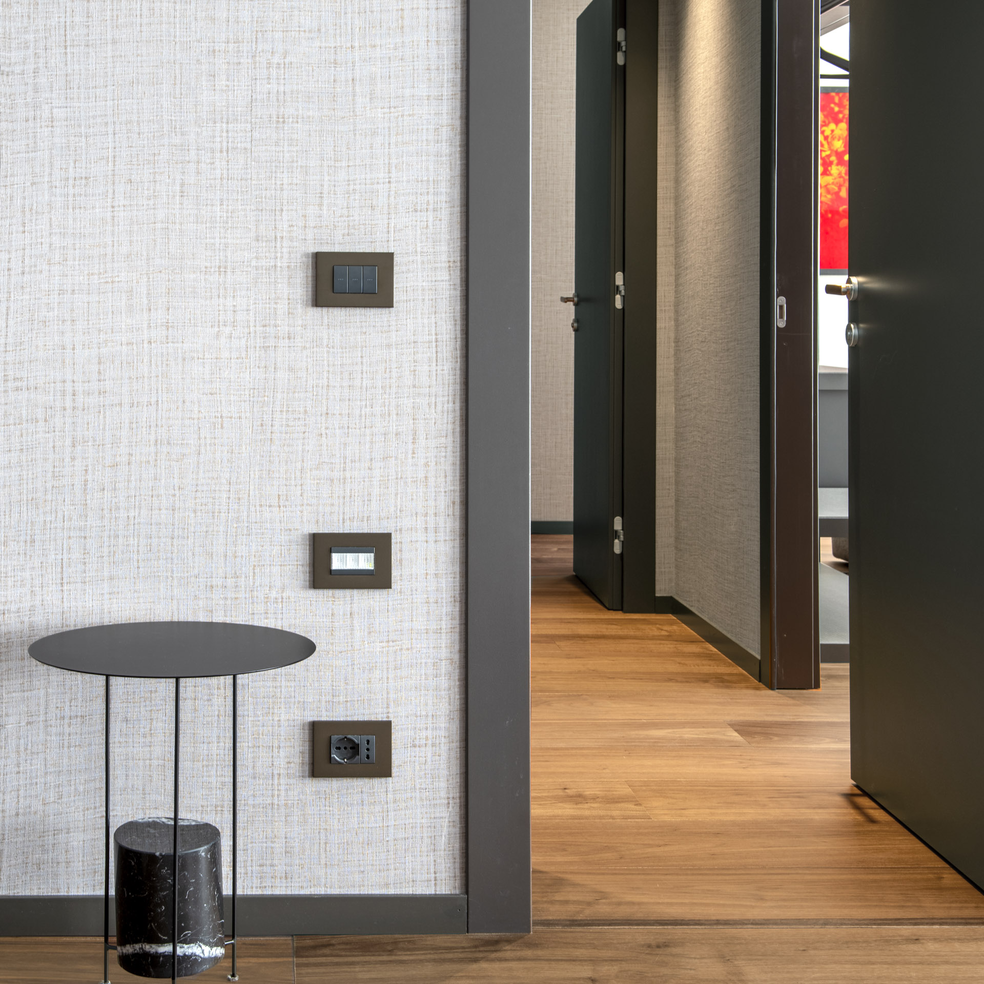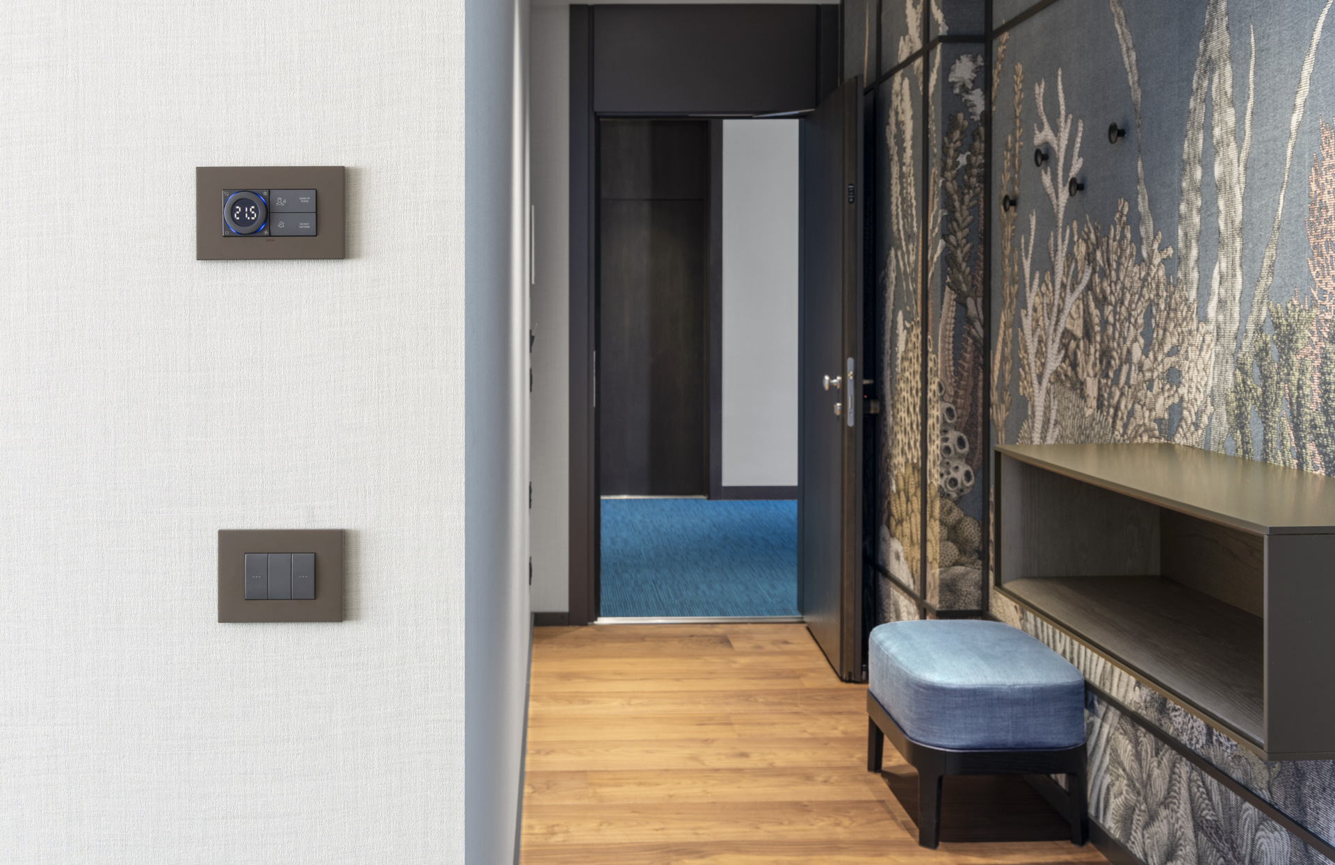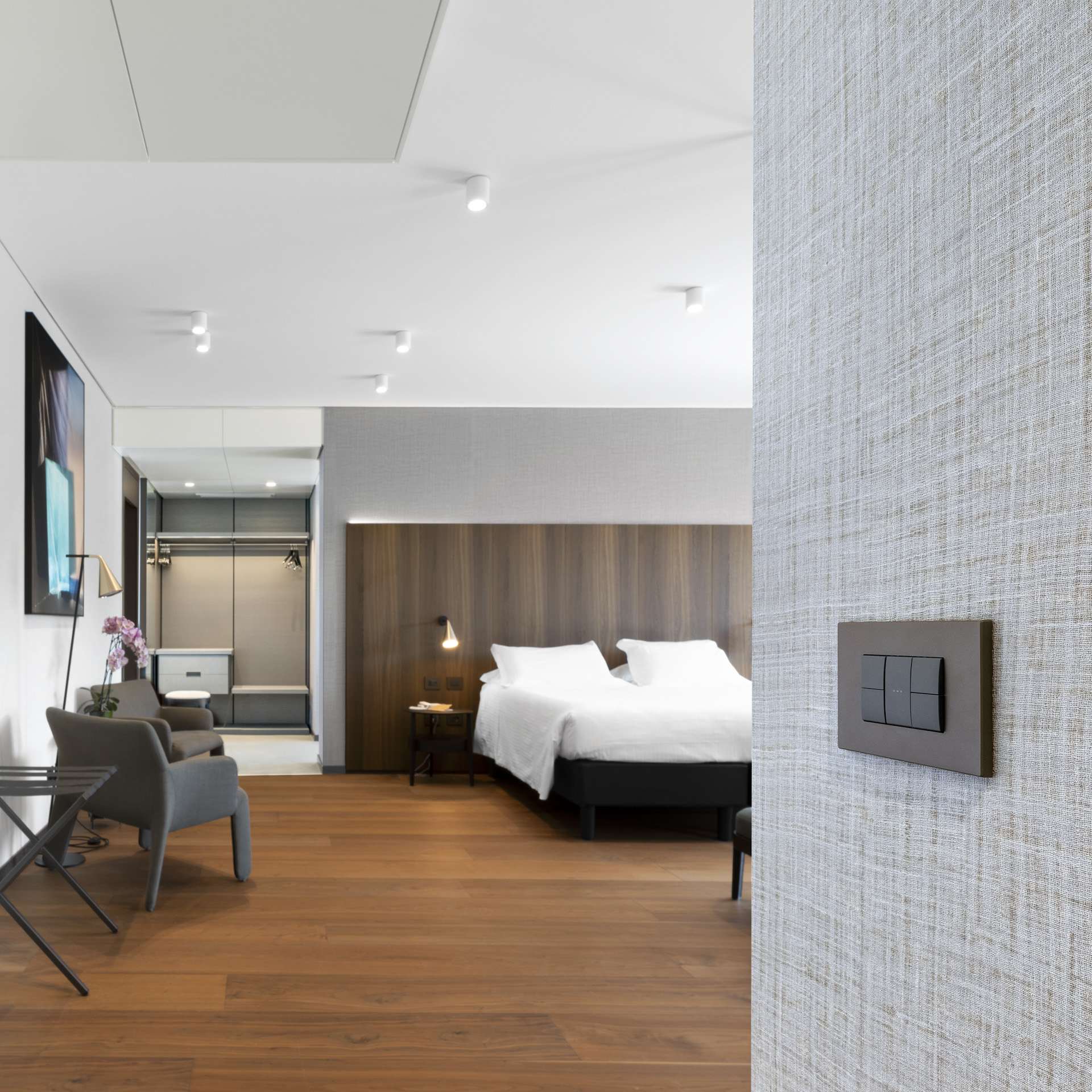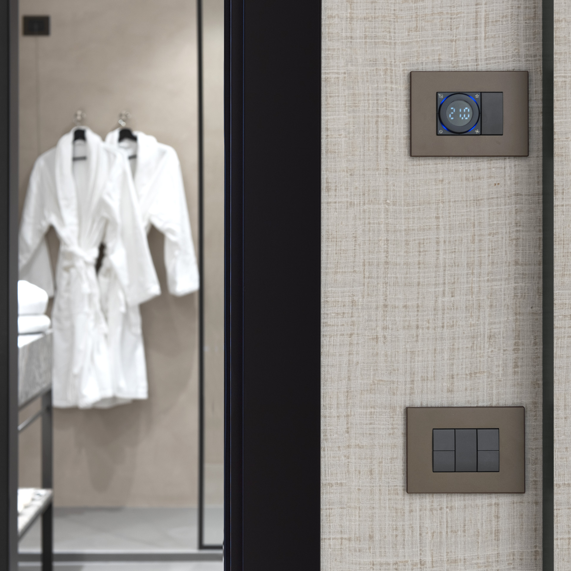 Proportionnellement aux besoins d'un tourisme de plus en plus orienté vers les séjours de courte durée, le récent projet de rénovation, supervisé par l'architecte Valter Canuto, sous la direction artistique d'Elisa Sighicelli, a relooké les appartements existants et créé de nouvelles suites au design moderne et sophistiqué. De larges baies vitrées inondent les pièces d’une lumière naturelle, offrant des vues fascinantes sur la ville. Les différents espaces disponibles permettent aux hôtes de choisir la solution la plus adaptée, avec des suites comprenant salon, salle à manger et cuisine, pour un séjour sous le signe du confort et de la liberté. Et pour ceux qui veulent profiter d’un moment de détente, le spa paradisiaque à l'intérieur de l'hôtel est équipé de douches tropicales, d'un bain de vapeur, d'un bain à remous et d'une cascade. Dans les suites relookées, le design minimaliste rencontre l'expressivité des matériaux naturels et la délicatesse des tons chauds et neutres, avec des touches écru. Chaque détail a été conçu pour transmettre équilibre, confort et beauté intemporelle, comme la finition bronze foncé brossé de la série Eikon Exé, choisie dans la version traditionnelle avec commandes grises ; profils plats, coins carrés pour une plaque qui représente l'essence pure de la forme et de la matière. À l'extérieur des chambres, la touche d'élégance supplémentaire est confiée aux lecteurs de carte Eikon Tactil. La surface lisse en cristal pur porte des symboles rétroéclairés par led qui avertissent le personnel que le client ne souhaite pas être dérangé ou, au contraire, qu'il demande que sa chambre soit refaite. Une présence imperceptible au charme délicat, dont la silhouette impeccable affleure de quelques millimètres de la surface du mur, avec possibilité de personnalisations rétroéclairées servant à identifier la fonction de la commande, même dans l'obscurité.