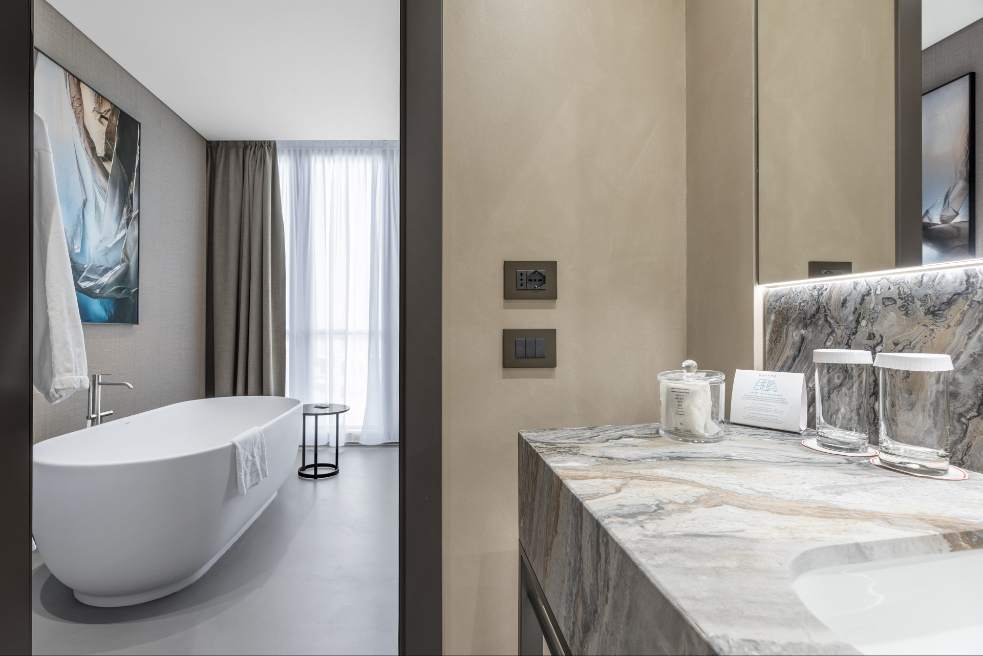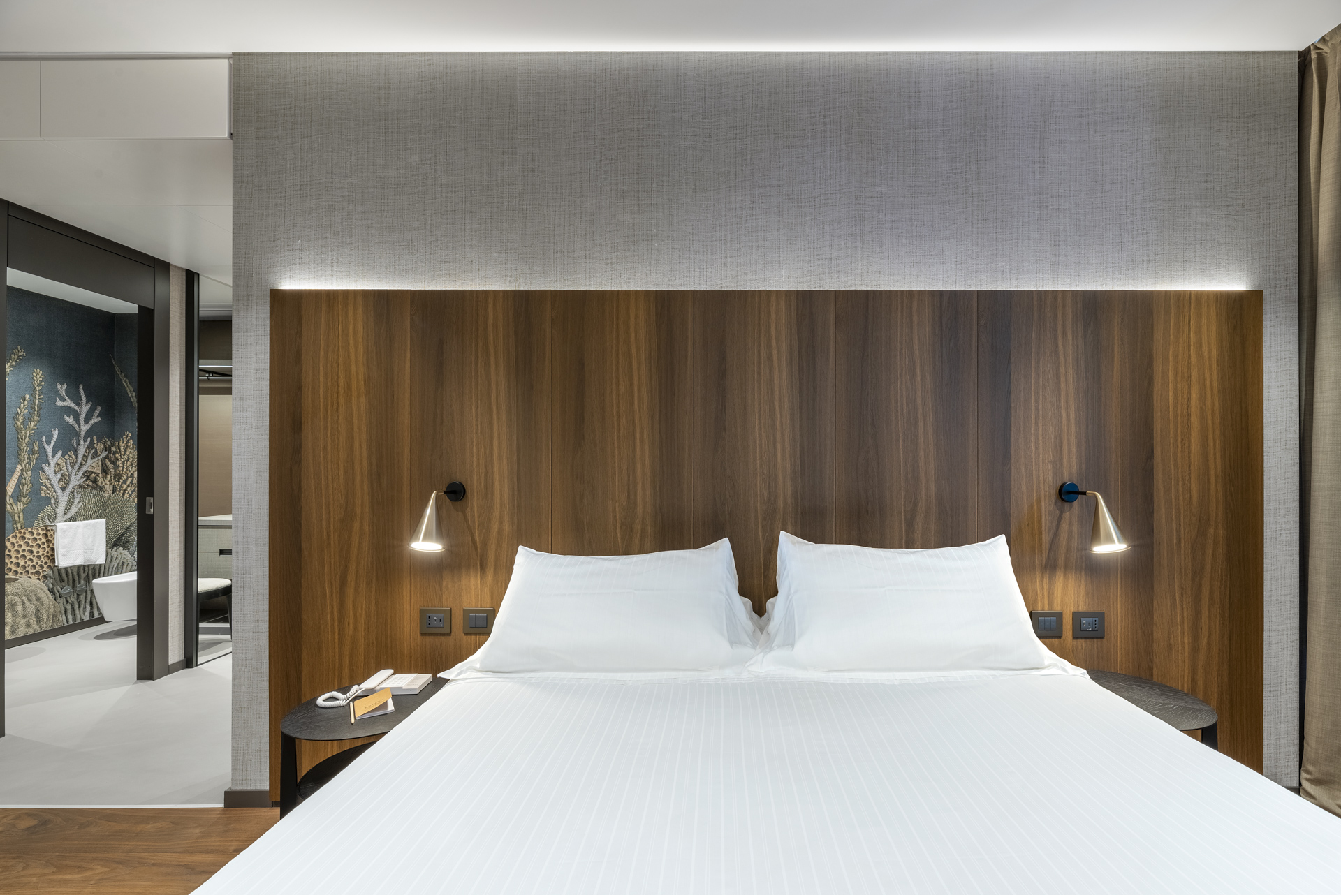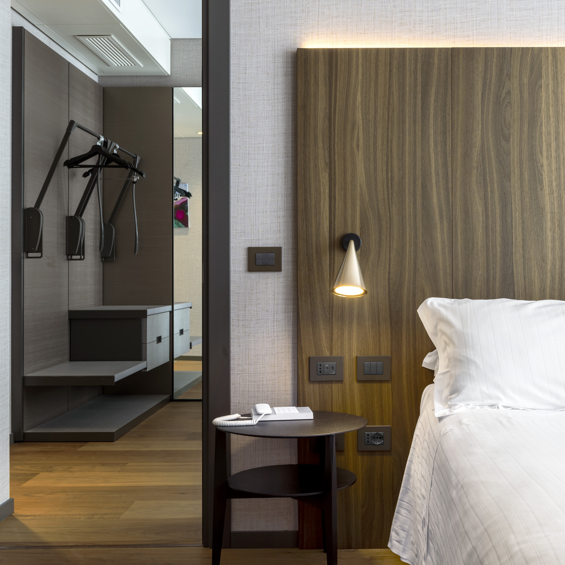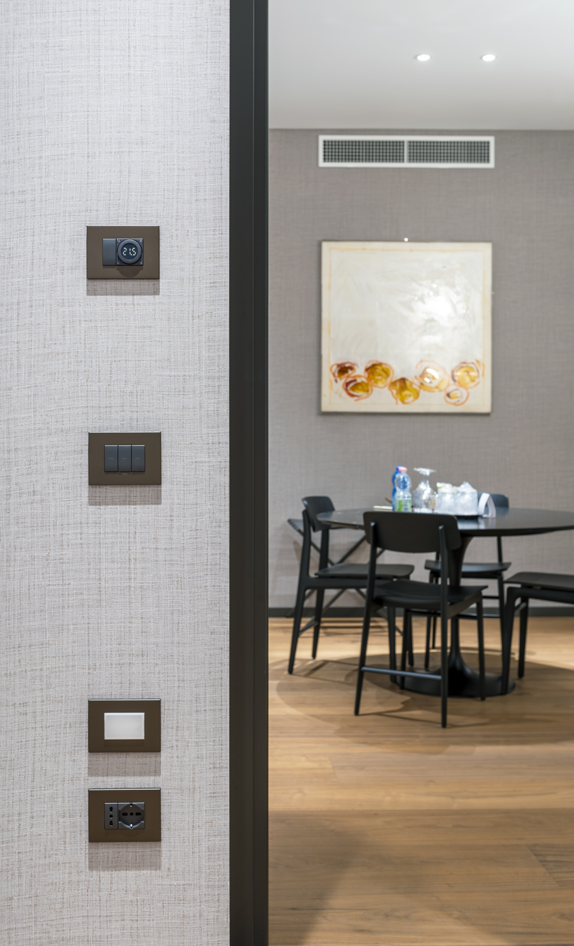 Proportionnellement aux besoins d'un tourisme de plus en plus orienté vers les séjours de courte durée, le récent projet de rénovation, supervisé par l'architecte Valter Canuto, sous la direction artistique d'Elisa Sighicelli, a relooké les appartements existants et créé de nouvelles suites au design moderne et sophistiqué. De larges baies vitrées inondent les pièces d’une lumière naturelle, offrant des vues fascinantes sur la ville. Les différents espaces disponibles permettent aux hôtes de choisir la solution la plus adaptée, avec des suites comprenant salon, salle à manger et cuisine, pour un séjour sous le signe du confort et de la liberté. Et pour ceux qui veulent profiter d’un moment de détente, le spa paradisiaque à l'intérieur de l'hôtel est équipé de douches tropicales, d'un bain de vapeur, d'un bain à remous et d'une cascade. Dans les suites relookées, le design minimaliste rencontre l'expressivité des matériaux naturels et la délicatesse des tons chauds et neutres, avec des touches écru. Chaque détail a été conçu pour transmettre équilibre, confort et beauté intemporelle, comme la finition bronze foncé brossé de la série Eikon Exé, choisie dans la version traditionnelle avec commandes grises ; profils plats, coins carrés pour une plaque qui représente l'essence pure de la forme et de la matière. À l'extérieur des chambres, la touche d'élégance supplémentaire est confiée aux lecteurs de carte Eikon Tactil. La surface lisse en cristal pur porte des symboles rétroéclairés par led qui avertissent le personnel que le client ne souhaite pas être dérangé ou, au contraire, qu'il demande que sa chambre soit refaite. Une présence imperceptible au charme délicat, dont la silhouette impeccable affleure de quelques millimètres de la surface du mur, avec possibilité de personnalisations rétroéclairées servant à identifier la fonction de la commande, même dans l'obscurité.