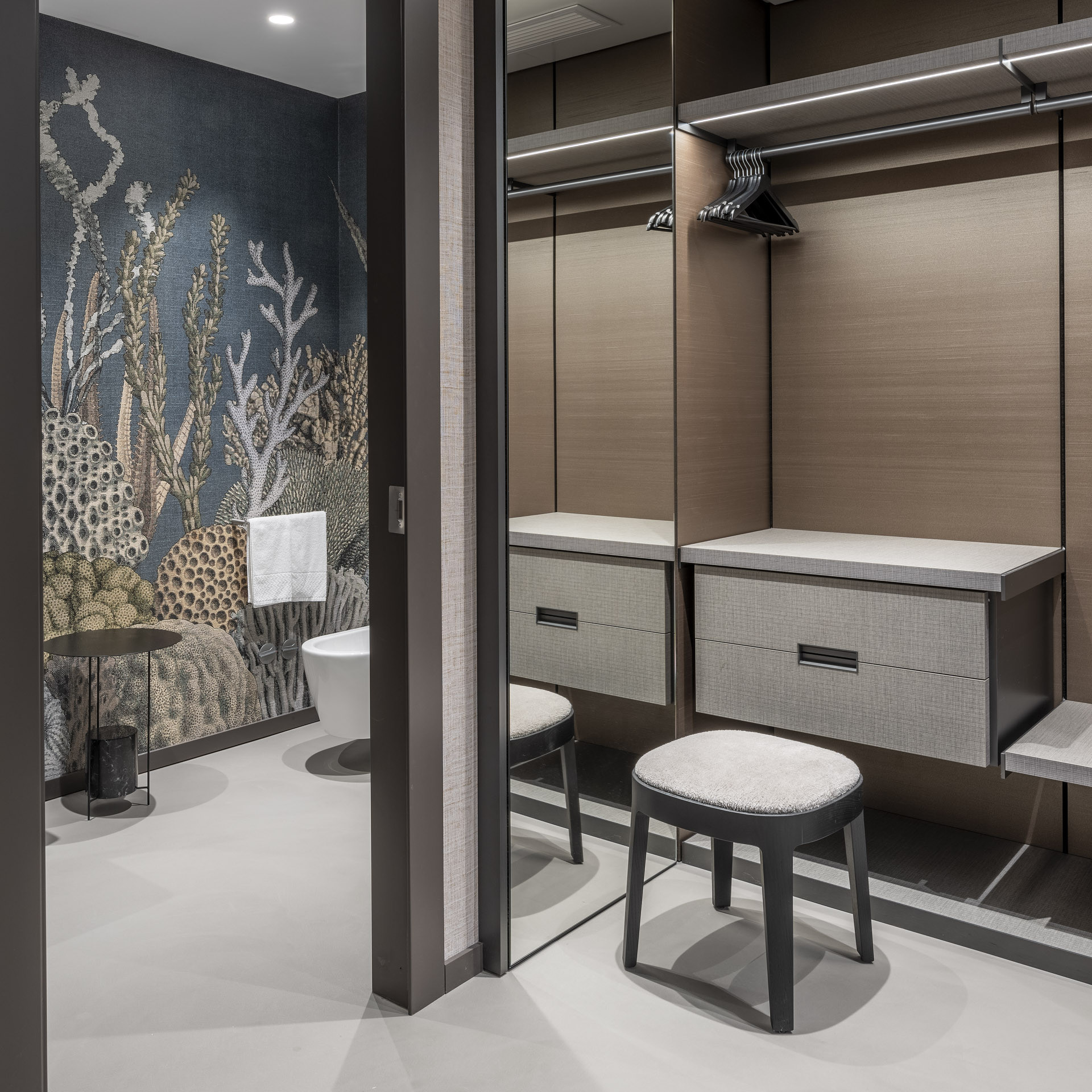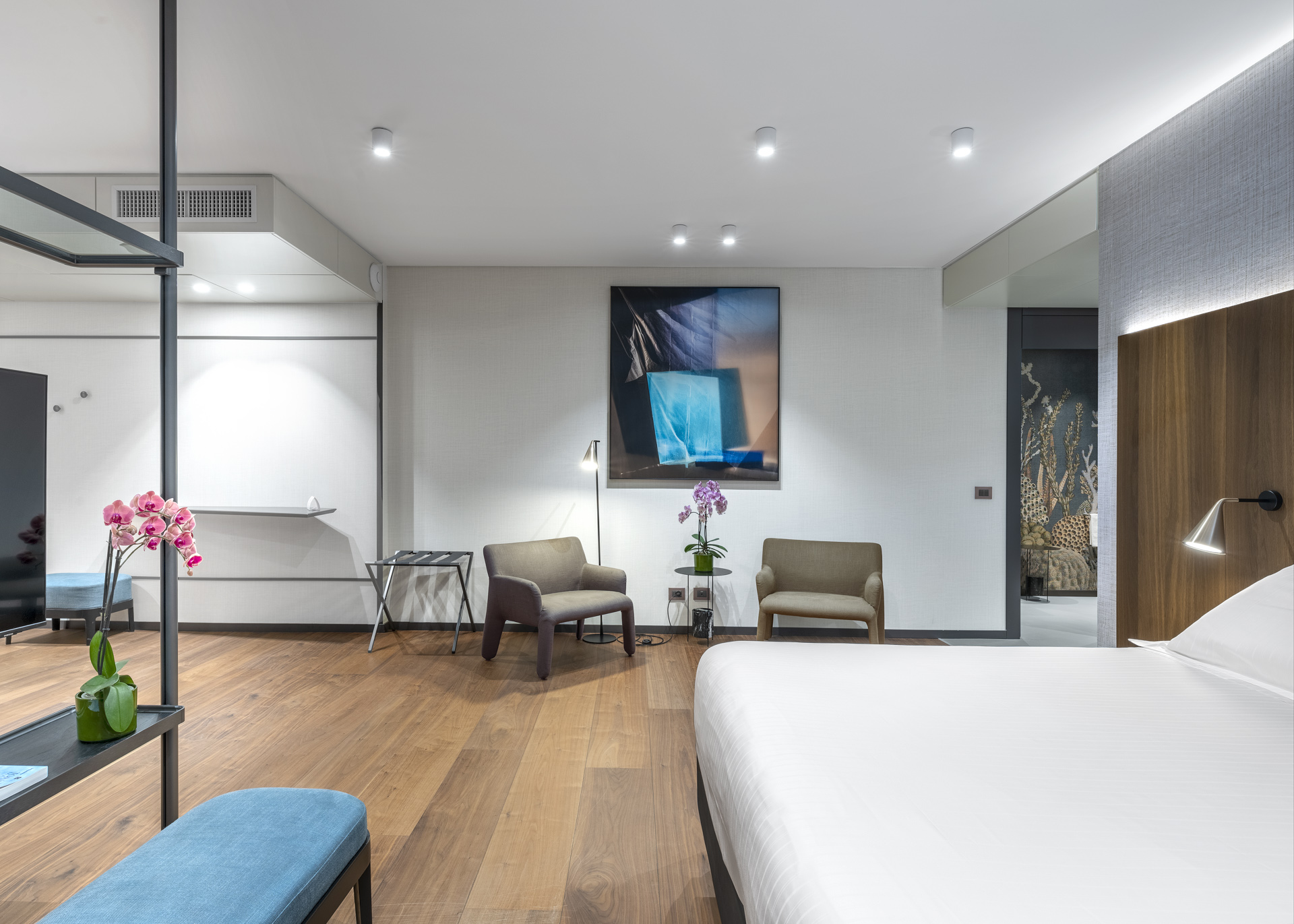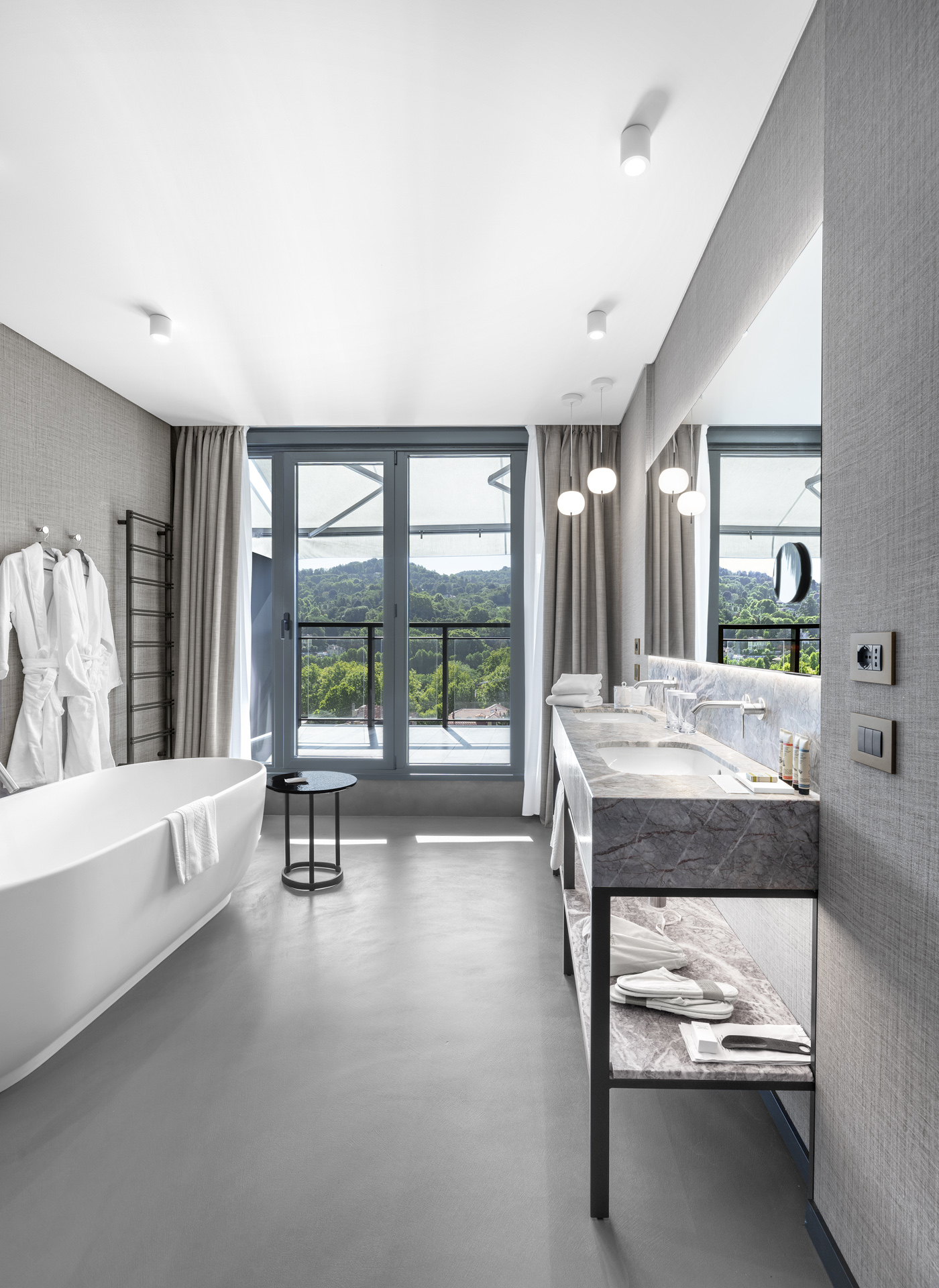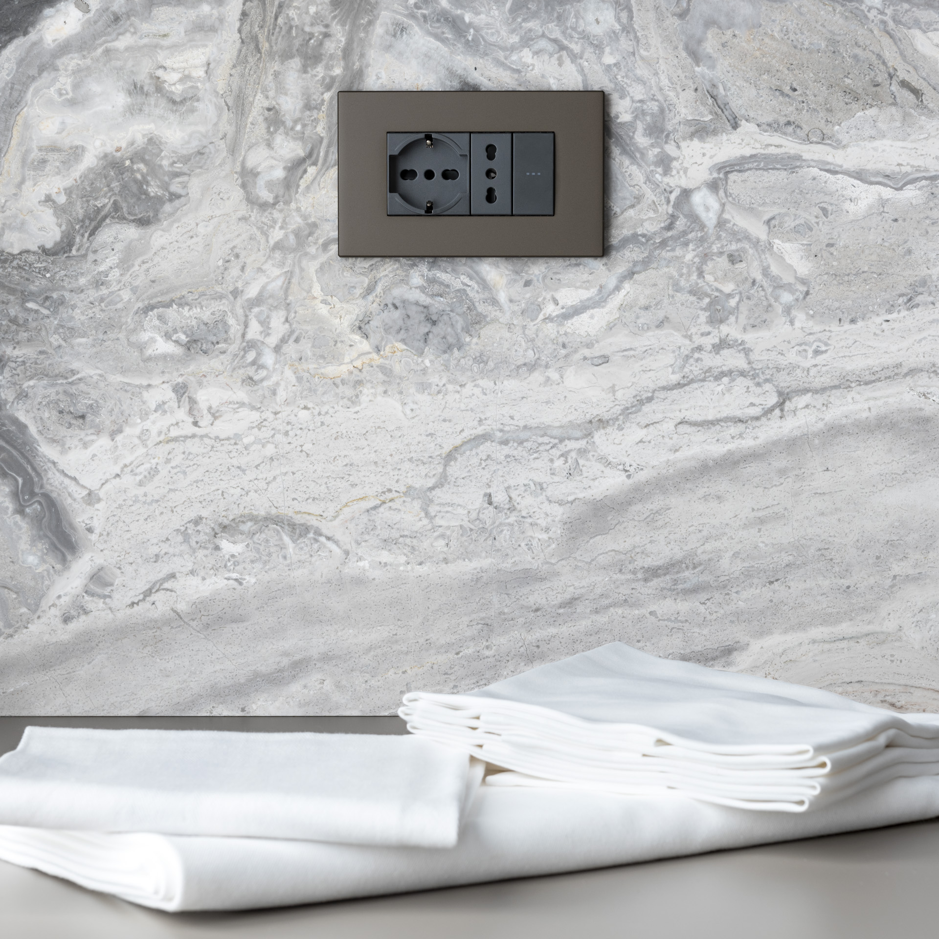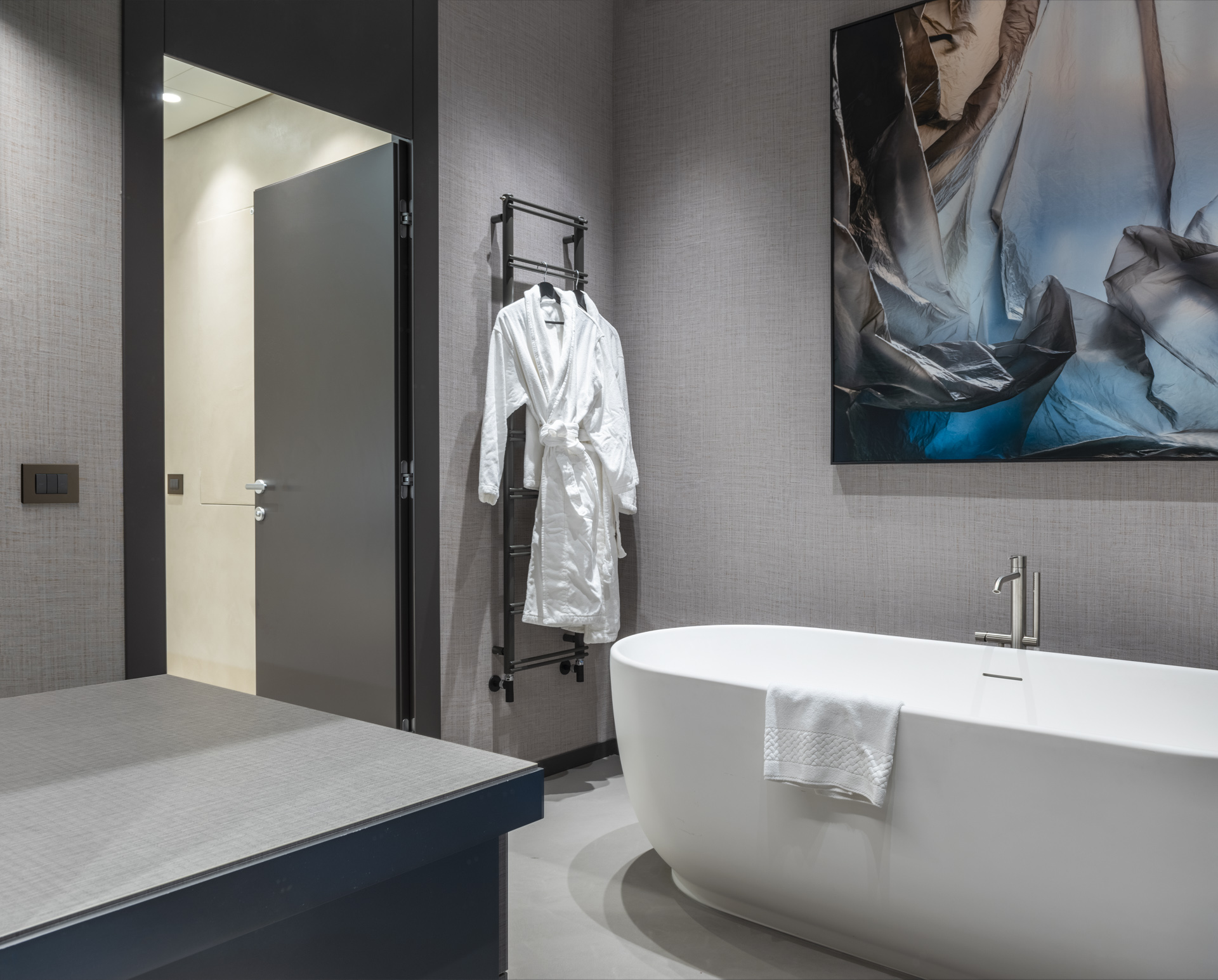 Proportionnellement aux besoins d'un tourisme de plus en plus orienté vers les séjours de courte durée, le récent projet de rénovation, supervisé par l'architecte Valter Canuto, sous la direction artistique d'Elisa Sighicelli, a relooké les appartements existants et créé de nouvelles suites au design moderne et sophistiqué. De larges baies vitrées inondent les pièces d’une lumière naturelle, offrant des vues fascinantes sur la ville. Les différents espaces disponibles permettent aux hôtes de choisir la solution la plus adaptée, avec des suites comprenant salon, salle à manger et cuisine, pour un séjour sous le signe du confort et de la liberté. Et pour ceux qui veulent profiter d’un moment de détente, le spa paradisiaque à l'intérieur de l'hôtel est équipé de douches tropicales, d'un bain de vapeur, d'un bain à remous et d'une cascade. Dans les suites relookées, le design minimaliste rencontre l'expressivité des matériaux naturels et la délicatesse des tons chauds et neutres, avec des touches écru. Chaque détail a été conçu pour transmettre équilibre, confort et beauté intemporelle, comme la finition bronze foncé brossé de la série Eikon Exé, choisie dans la version traditionnelle avec commandes grises ; profils plats, coins carrés pour une plaque qui représente l'essence pure de la forme et de la matière. À l'extérieur des chambres, la touche d'élégance supplémentaire est confiée aux lecteurs de carte Eikon Tactil. La surface lisse en cristal pur porte des symboles rétroéclairés par led qui avertissent le personnel que le client ne souhaite pas être dérangé ou, au contraire, qu'il demande que sa chambre soit refaite. Une présence imperceptible au charme délicat, dont la silhouette impeccable affleure de quelques millimètres de la surface du mur, avec possibilité de personnalisations rétroéclairées servant à identifier la fonction de la commande, même dans l'obscurité.