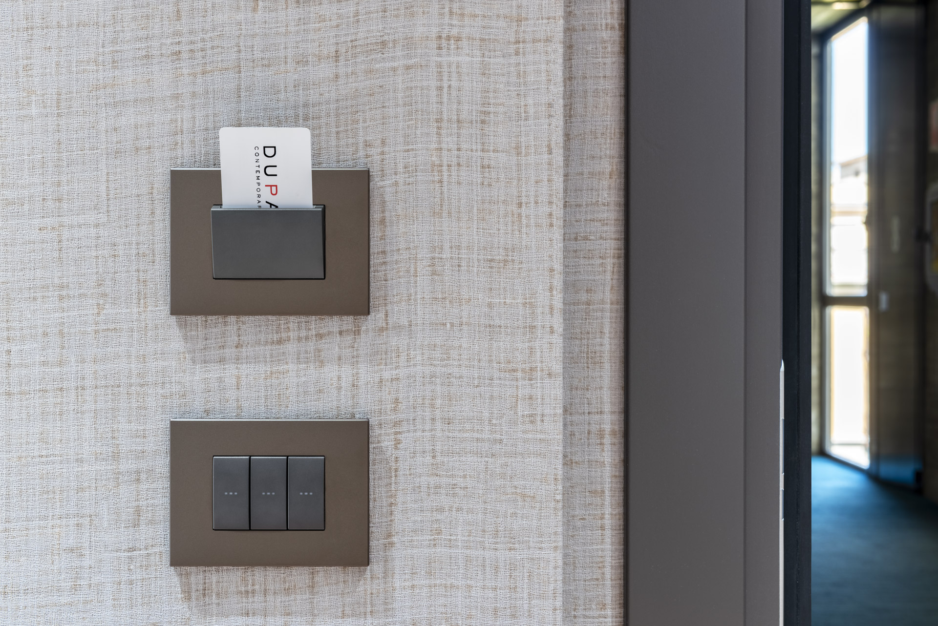 Le parcours de rénovation de ce lieu, où tout est conçu pour que les clients se sentent à l'aise, devait forcément se doter d’un système de gestion hôtelière KNX, avec intégration des produits Vimar, développé par Big Srl, sous la supervision de l'ingénieur Aldo Vavassori. Un système particulièrement complexe, pour une hospitalité intelligente, dans le respect de l’art et de l'histoire de l’architecture. Arrivées et départs, signalisation de la présence, état de l’éclairage et de la température, alarmes techniques ou de secours : tout est programmable et contrôlable à la réception, véritable salle de contrôle. Une technologie intelligente qui simplifie le travail du personnel et qui rendra votre séjour plus agréable. L'insertion de la carte dans le lecteur à transpondeur allume automatiquement la lumière, règle la température au niveau souhaité et signale la présence à la réception. Le Duparc Contemporary Suites se distingue comme un élément unique dans le paysage hôtelier, offrant une expérience qui combine l'art, l'architecture et le design de manière extraordinaire : une offre de pointe, où l'innovation technologique de Vimar transforme chaque séjour en une expérience avancée et personnalisée, en parfait équilibre entre esthétique et fonctionnalité.