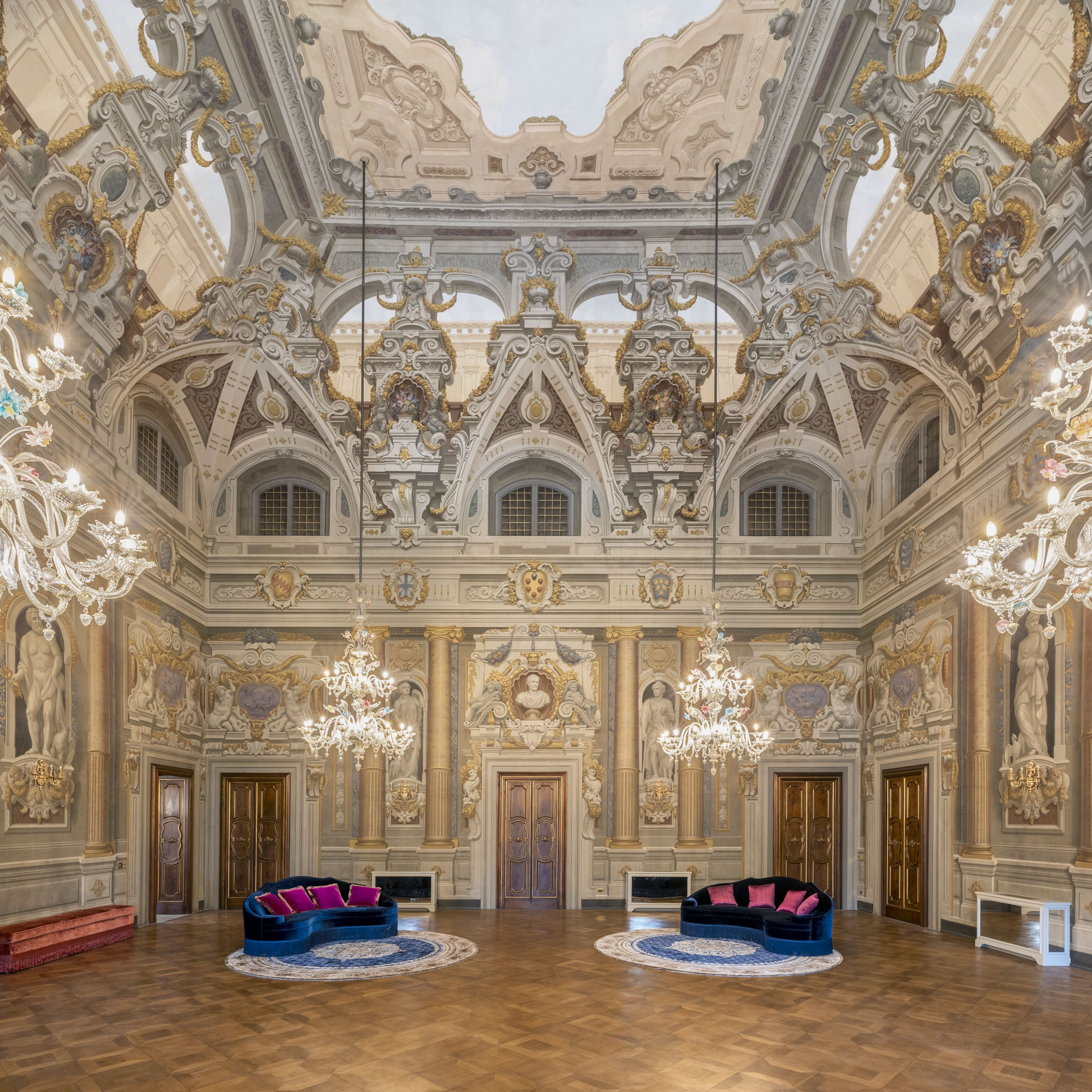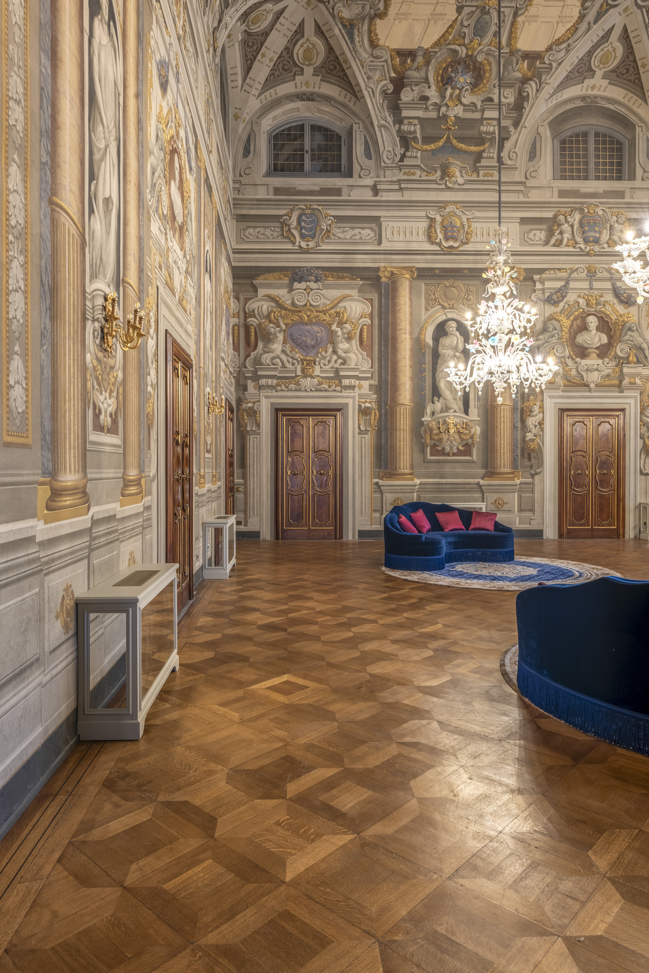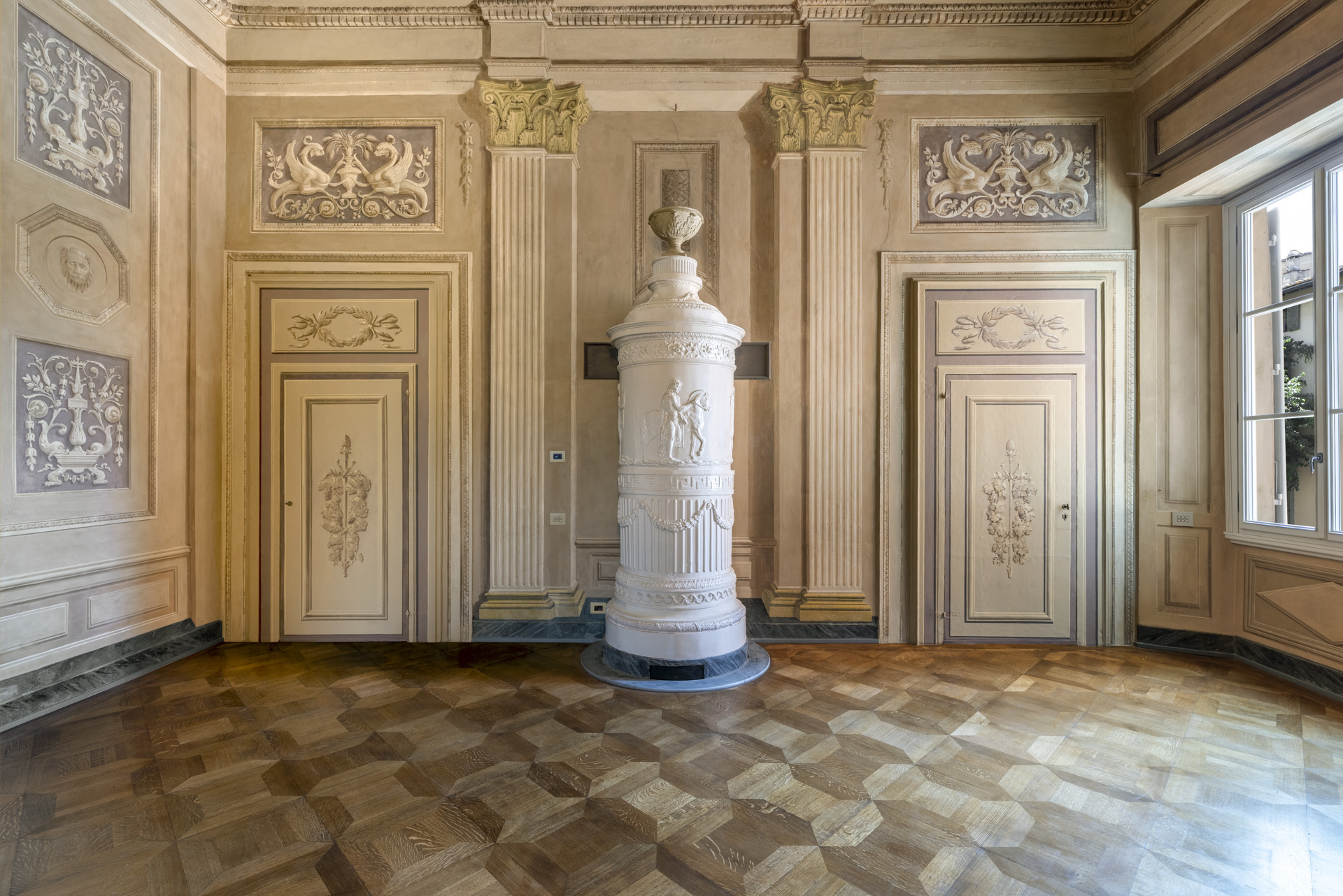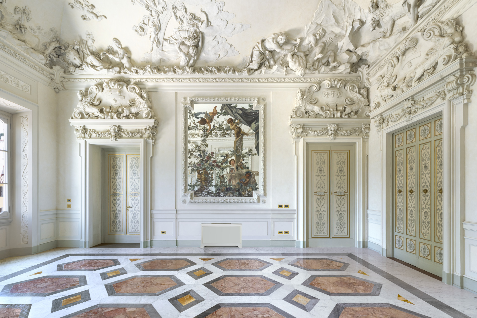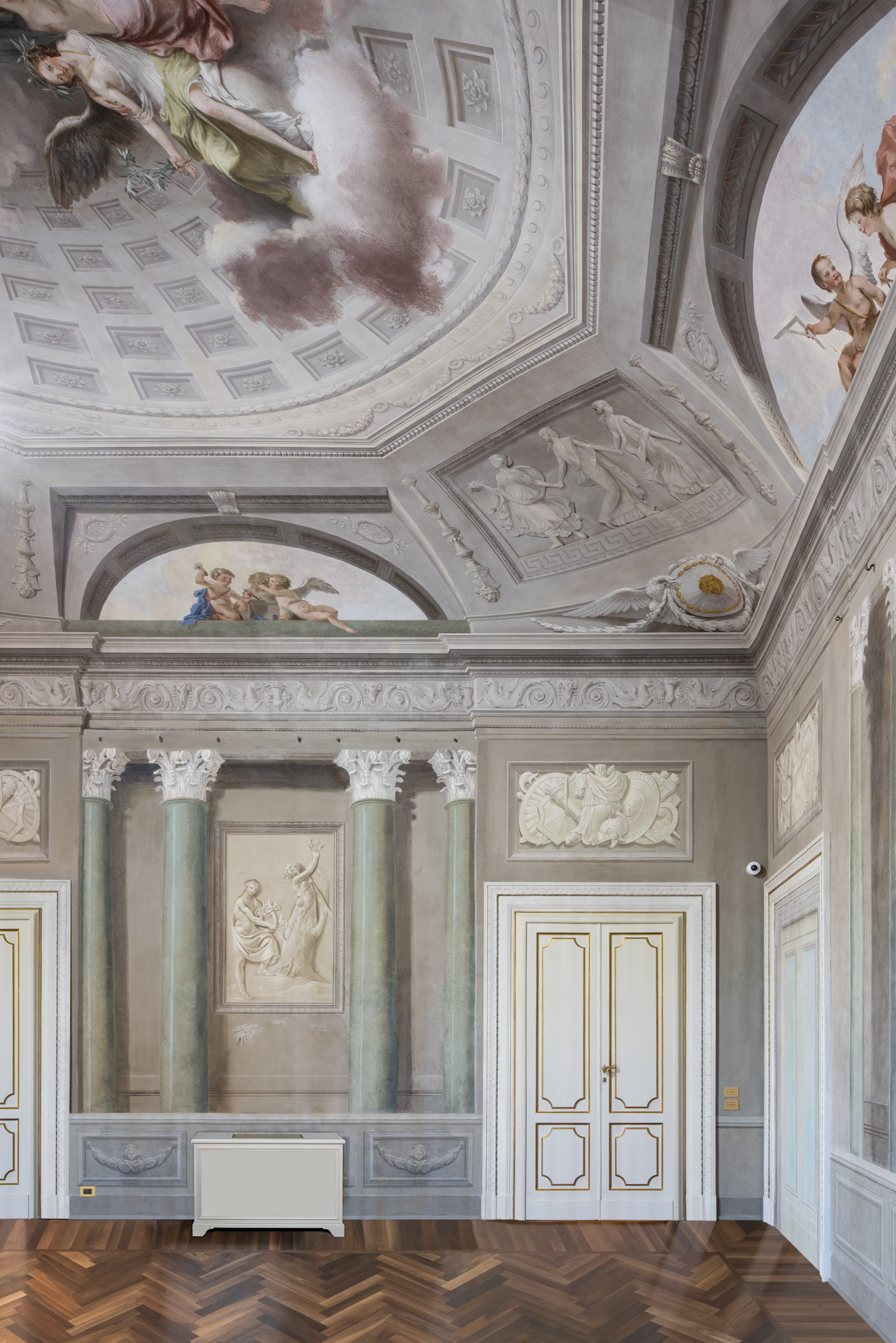 Aujourd'hui, après une restauration minutieuse menée par l'architecte Adriana Novelli - AnDesignteam Srl - la demeure historique répartie sur 5 étages et couvrant une superficie totale de 5 800 m2 avec un parc de plus de 3 000 m2, est devenue un complexe exclusif comprenant 12 appartements de luxe allant de 1 700 à 500 m2. Les plafonds et les murs décorés de fresques, les cheminées en marbre, la grande salle de bal, avec les premiers lustres en verre coloré de Murano, la somptueuse salle des glaces et un très rare poêle en terre cuite émaillée, racontent un passé glorieux, soigneusement préservé dans les moindres détails.