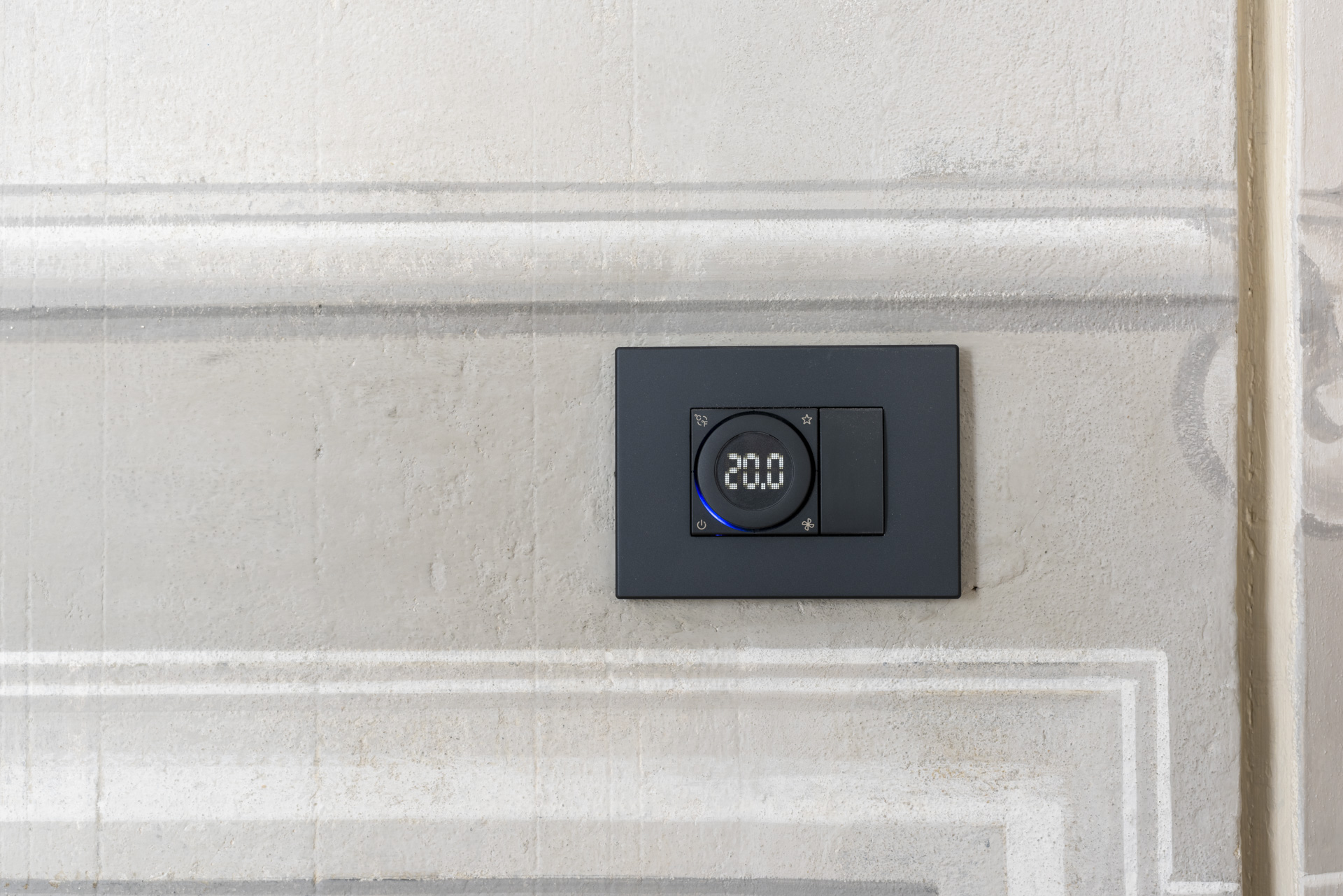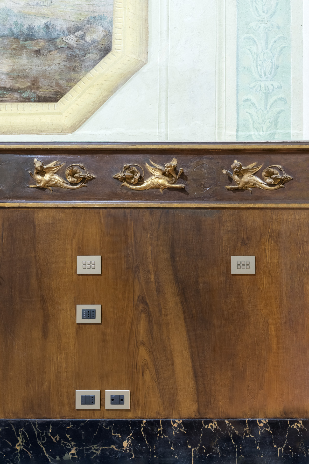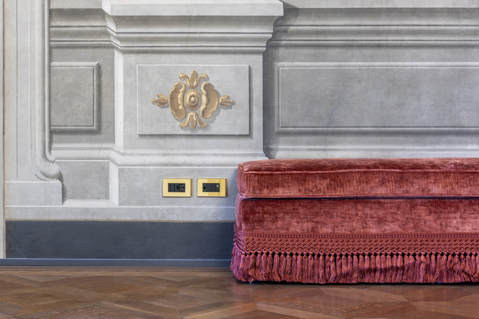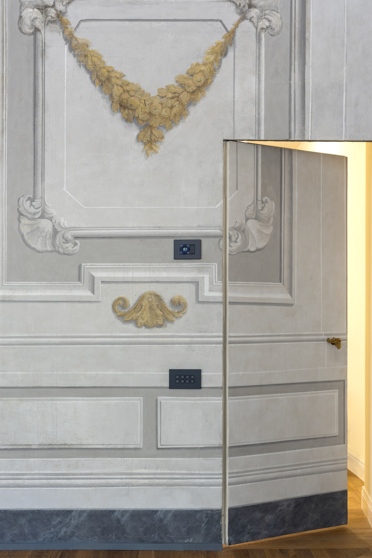 Lumière naturelle, matériaux nobles et innovation technologique : c'est dans cet équilibre entre esthétique et fonctionnalité que s'inscrit Vimar. La série résidentielle Eikon Exé avec les commandes Flat, proposée par AnDesignteam, s'harmonise avec discrétion et raffinement avec les couleurs des fresques murales, alternant les finitions en or, or satiné, blanc mat et gris anthracite, dans un dialogue continu entre le passé et le présent.