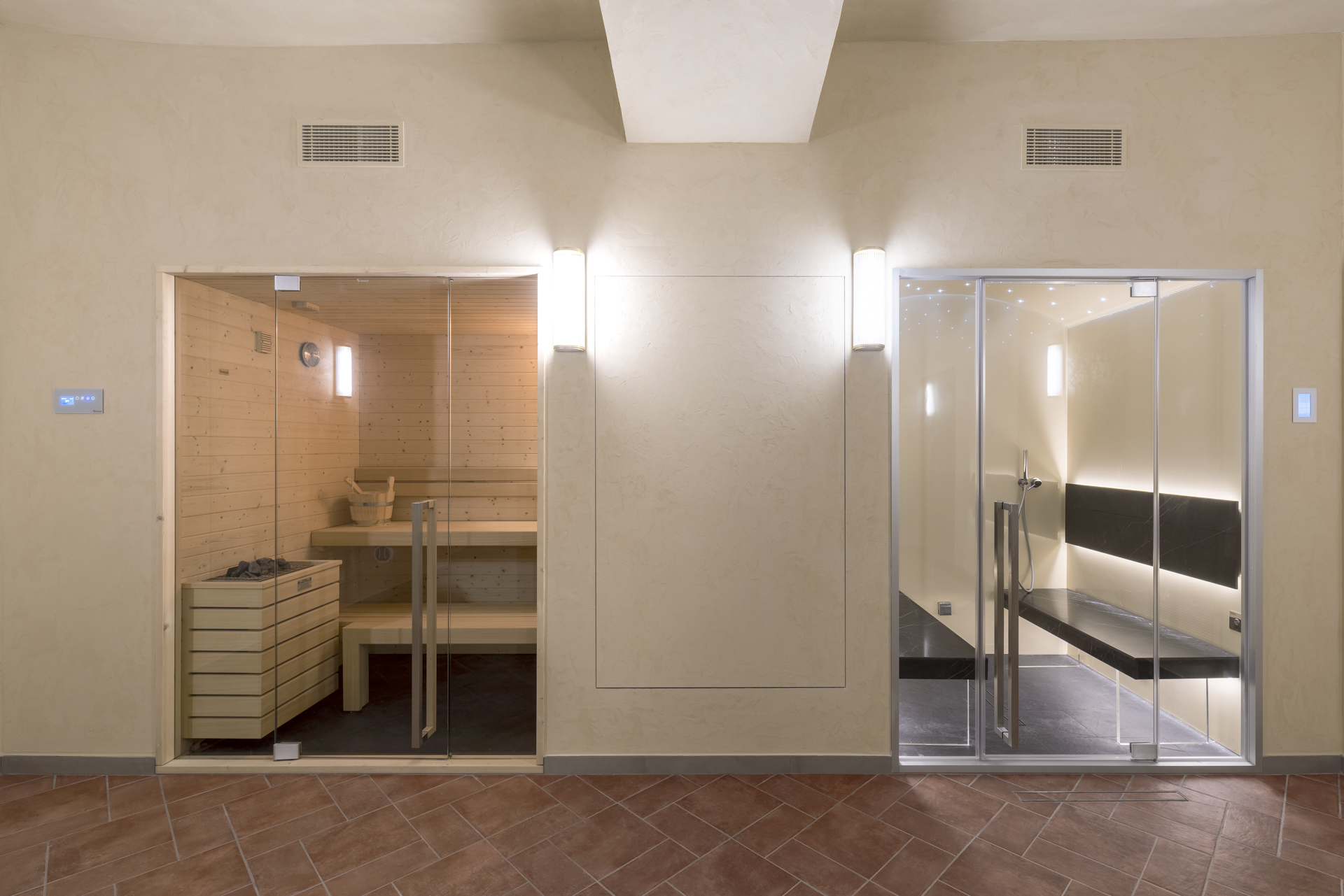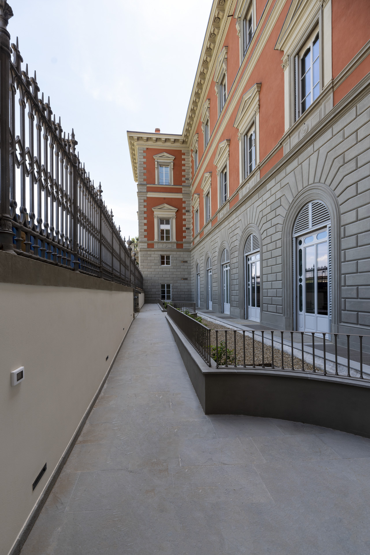 Pour la gestion de l’éclairage et la régulation thermique, fondamentale pour la conservation des fresques, le choix s’est porté sur un système domotique KNX avec intégration d'articles Vimar. Un système complexe qui permet la supervision des fonctions et la gestion centralisée du palais, assurant l'interopérabilité avec des tiers. Un autre aspect important pour un complexe exclusif comme l'est Palazzo Serristori est la sécurité ; Vimar propose des solutions particulièrement performantes, réalisées à partir des technologies les plus innovantes, en mesure de garantir la sécurité maximale du bâtiment dans toutes les conditions. Des systèmes anti-intrusion By-alarm Plus et de vidéosurveillance Elvox CCTV en mesure de dialoguer entre eux grâce à l’appli View ont été installés, pour une gestion intuitive, y compris à distance, avec notifications d’alarme et flux vidéo de contrôle. De plus, le système By-alarm Plus comprend des capteurs de contact et de détection du mouvement pour surveiller chaque zone du palais. Pour compléter l'expérience, avec tout le confort actuel, le palais dispose d’un spa, d’un espace fitness et d’un magnifique jardin monumental agrémenté d’une magnifique piscine extérieure protégée par la verdure.