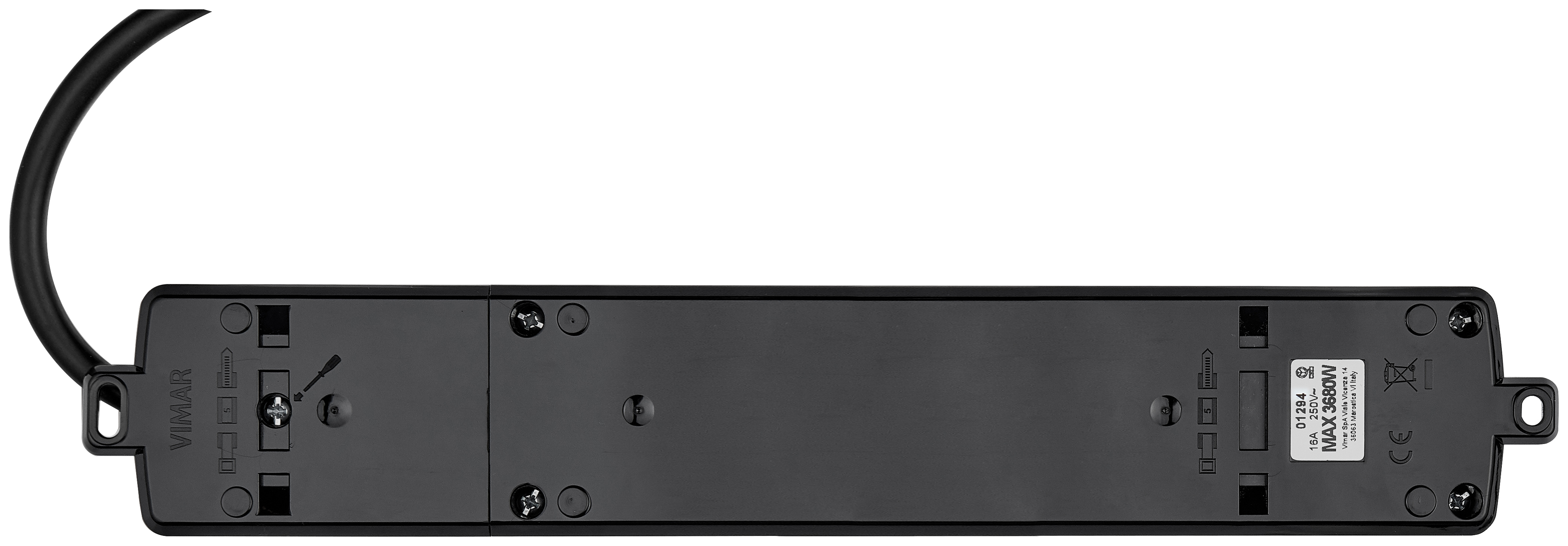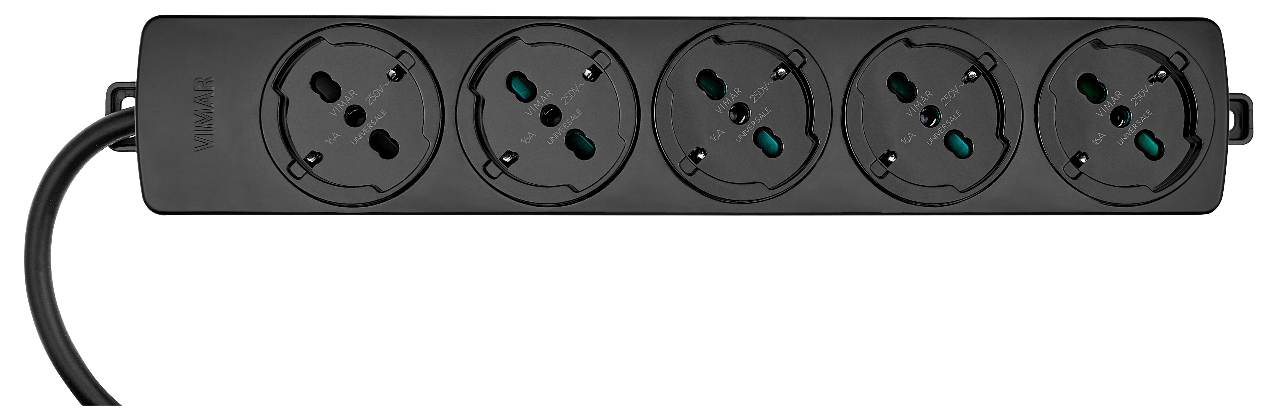 Presa mobile multipla 2P+T 16 A 250 V~, 5 uscite SICURY universale standard italiano tipo P40, cavo da 2 m con 3 conduttori da 1,5 mm2 (3G1 ,5), spina 2P+T 16 A standard italiano tipo S17, potenza massima prelevabile 3680 W, nero