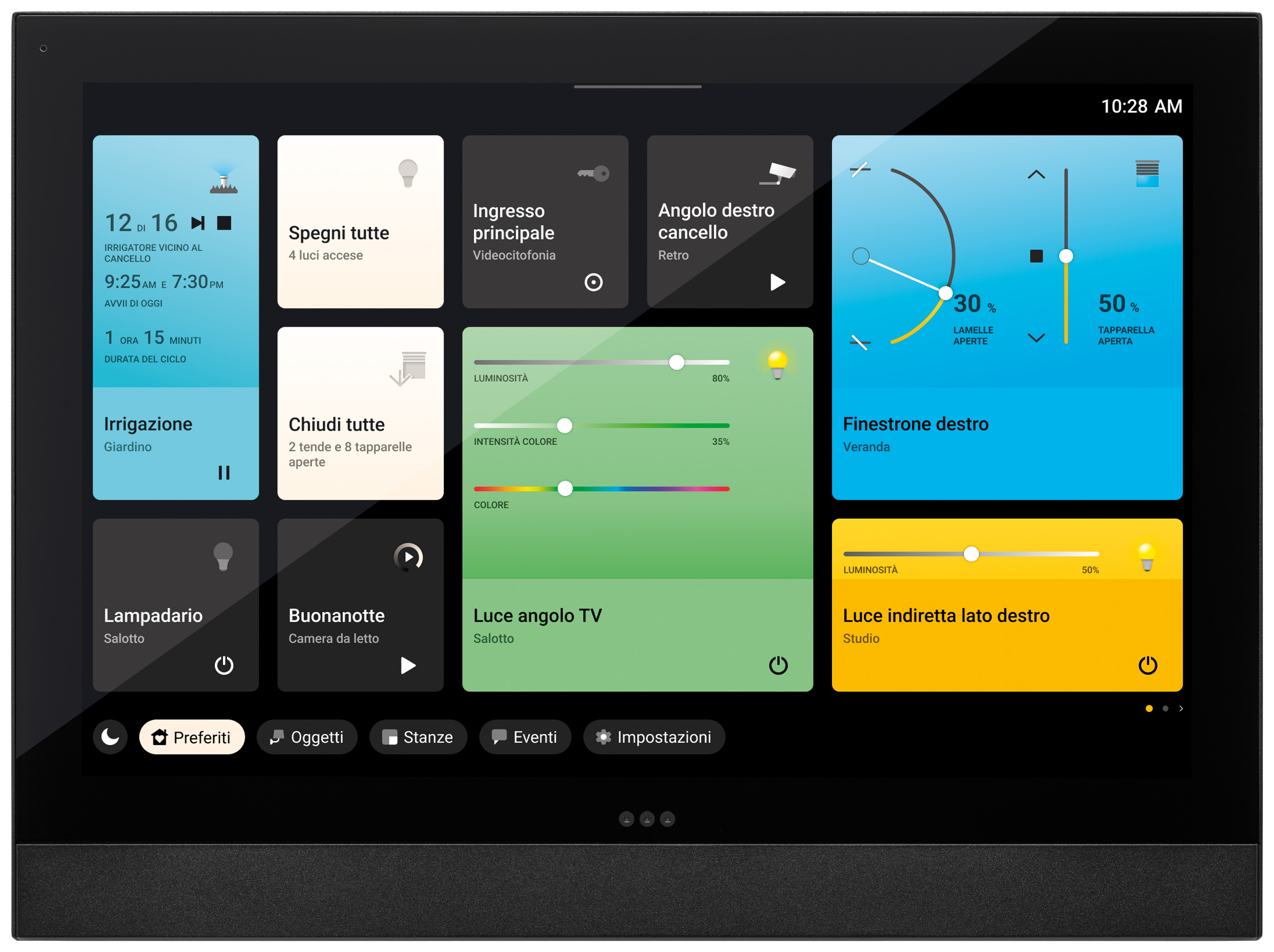 - Supervisione completa dell’impianto: gestione centralizzata dei sistemi di antintrusione, videocitofonia e controllo accessi, dell’i lluminazione, di tende, tapparelle e veneziane, del comfort termico, della visualizzazione dei consumi energetici, con funzioni di monitoraggio e gestione antiblackout, e dell’attivazione degli scenari. La gestione dell’irrigazione è disponibile solo per impianti By-me Plus