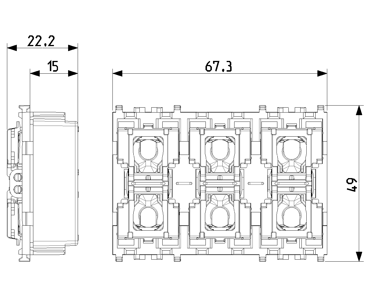 Apparecchio di comando a sei pulsanti 1P NO 24 Vdc 50 mA max., da completare con mezzi tasti intercambiabili, illuminabile - 3 moduli