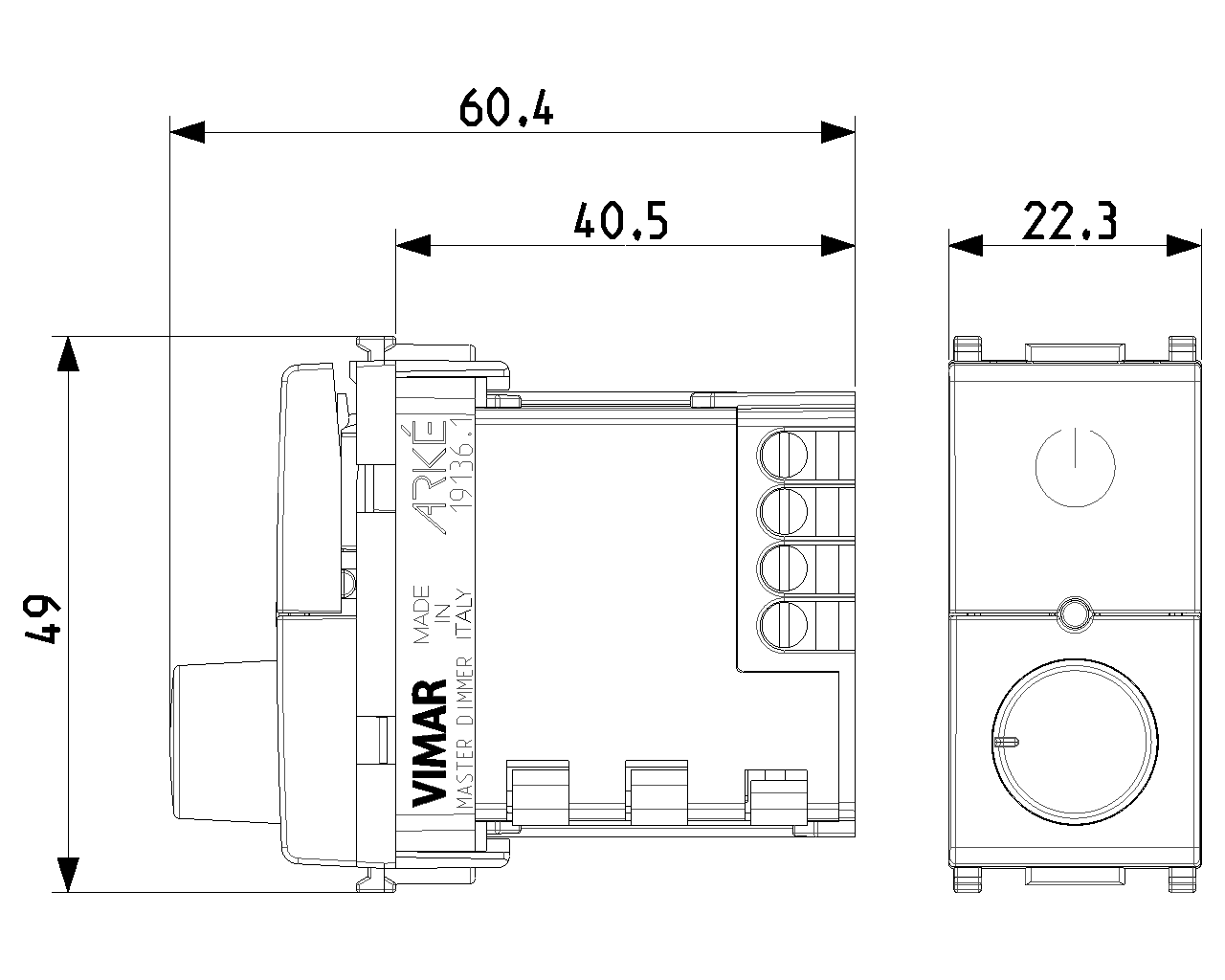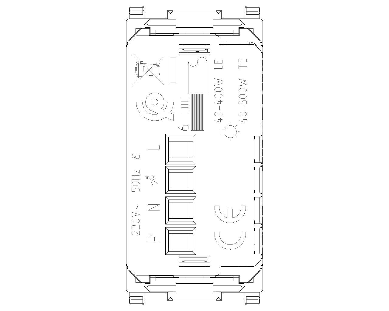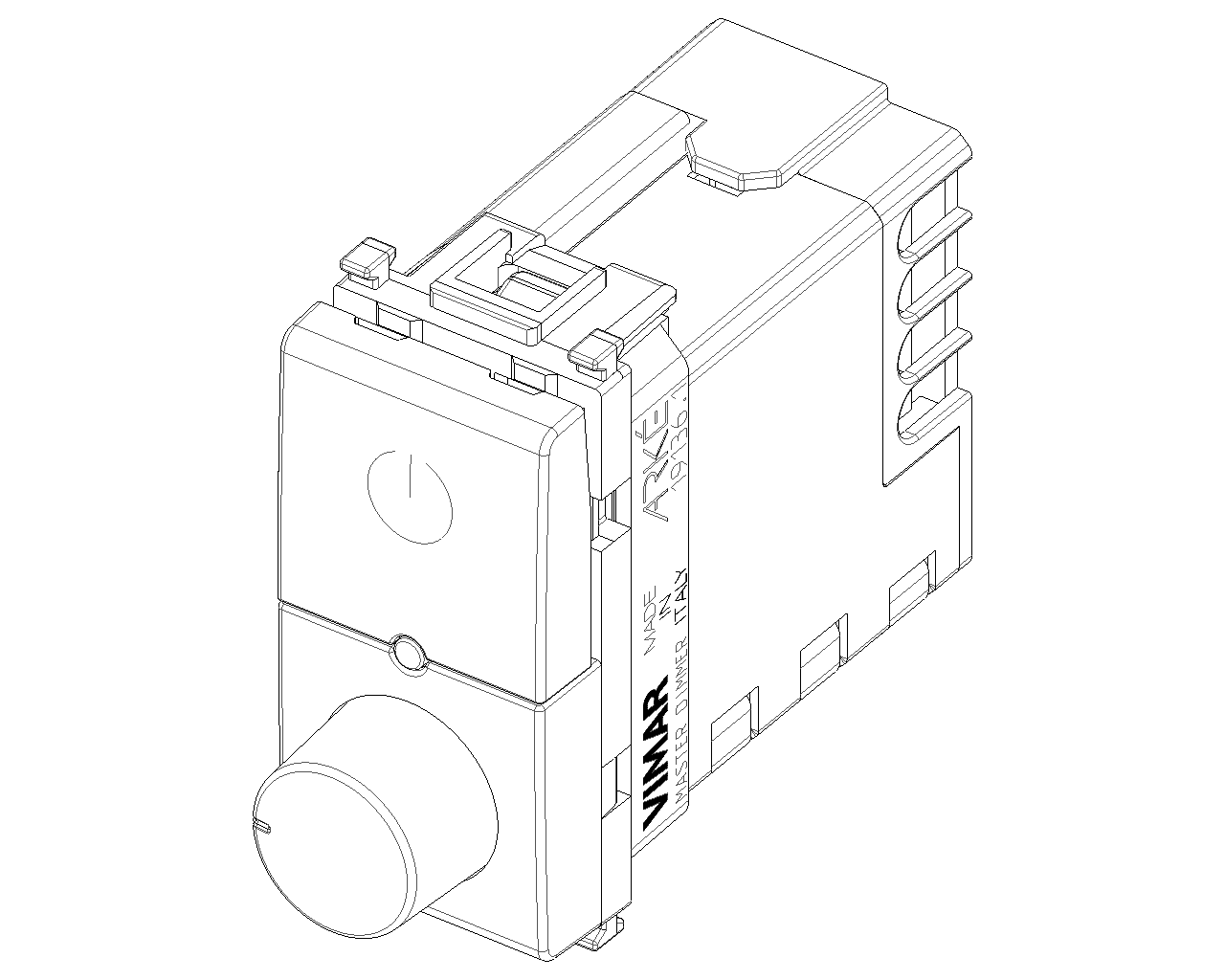 Dimmer universale 230 V~ 50 Hz a taglio di fase, per lampade ad incandescenza 40-400 W, trasformatori elettronici 40-300 VA, lampade CFL 10-200 W, lampade LED 3-200 W, per alimentatori elettronici LED a taglio di fase, comando ON/OFF con pulsante incorporato o da più punti con pulsanti NO, regolazione con potenziometro rotativo incorporato, funzione MASTER per 19137, regolazione intensità luminosa minima, individuazione al buio, bianco. Apparecchio non installabile nei contenitori Isoset