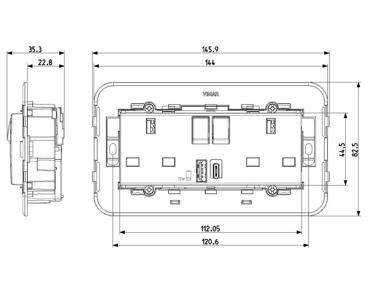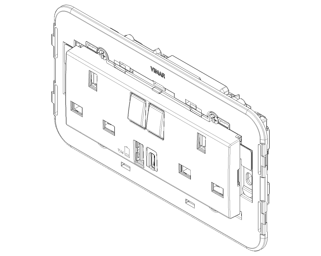 Due prese SICURY 2P+T 13 A 250 V~ standard inglese con due interruttori 2P con segno rosso, alimentatore USB 15 W 3 A 5 V con 1 uscita USB tipo A e 1 uscita USB tipo C ottimizzate per caricare contemporaneamente 2 dispositivi (es. tablet, smartphone), complete di supporto per installazione in scatole rettangolari BS, da completare con placca 5 moduli BS, Metal