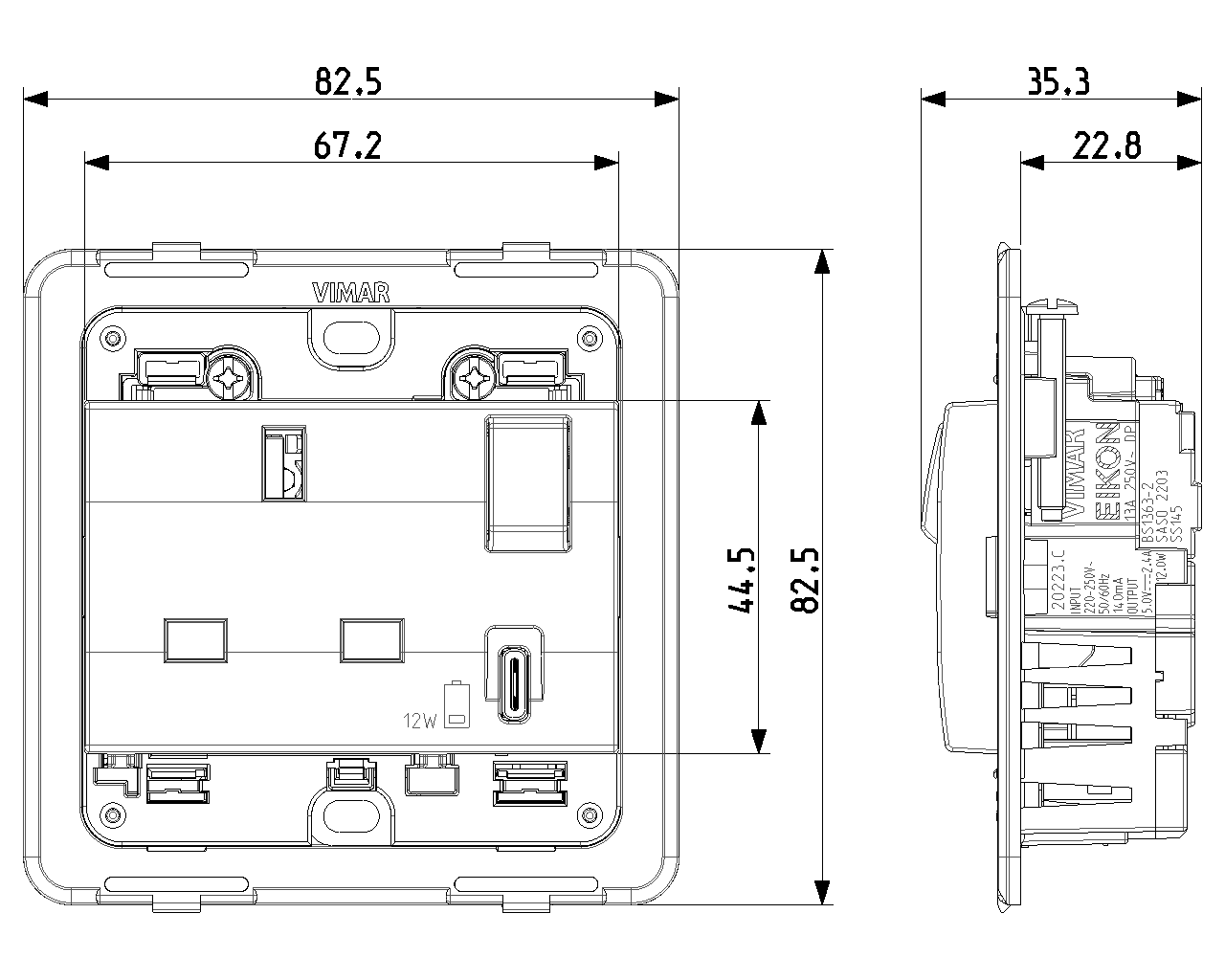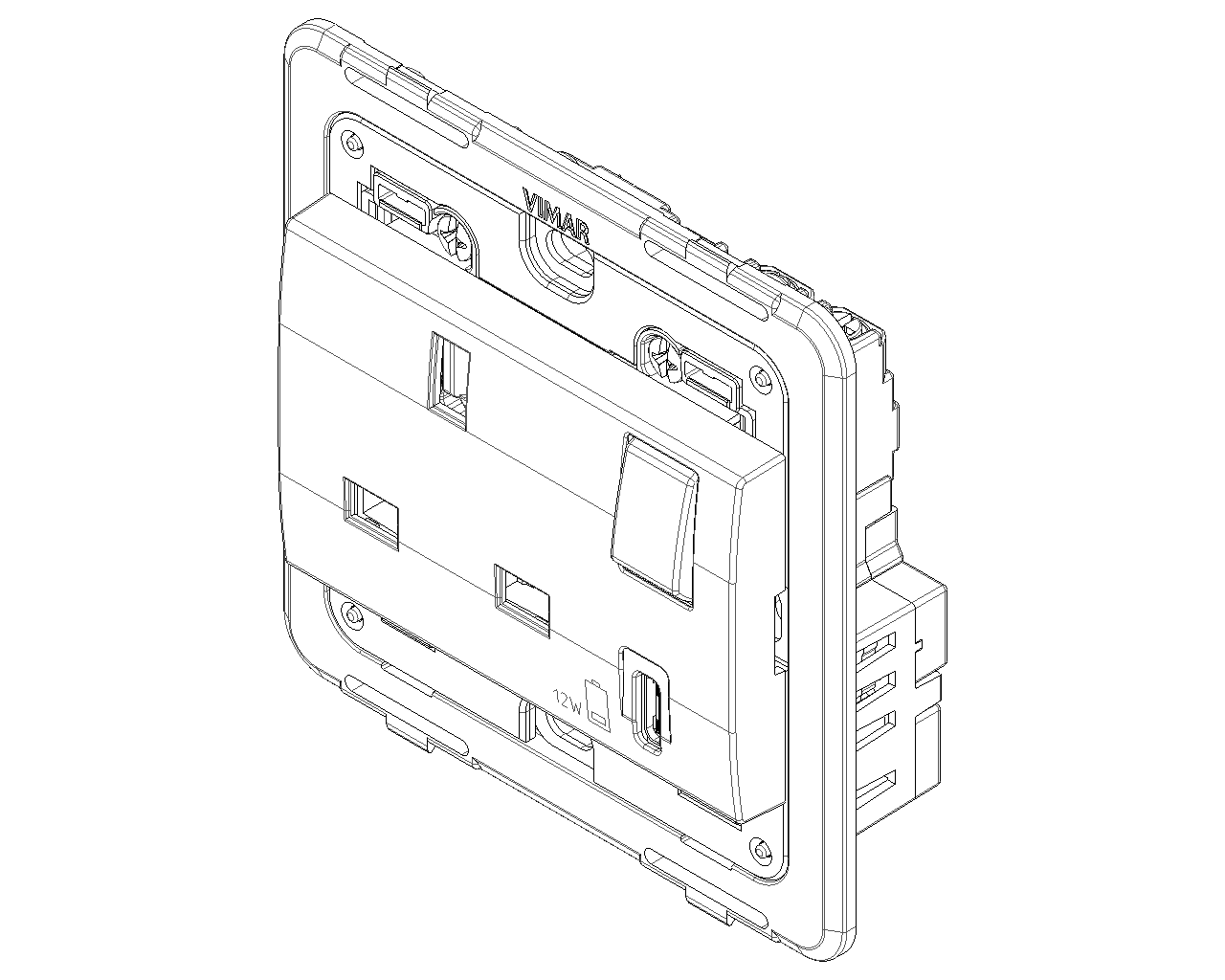 Presa SICURY 2P+T 13 A 250 V~ standard inglese con interruttore 2P con segno rosso, alimentatore USB 12 W 2,4 A 5 V con 1 uscita USB tipo C per dispositivi elettronici, completa di supporto per installazione in scatole quadrate BS, da completare con placca 3 moduli BS, grigio