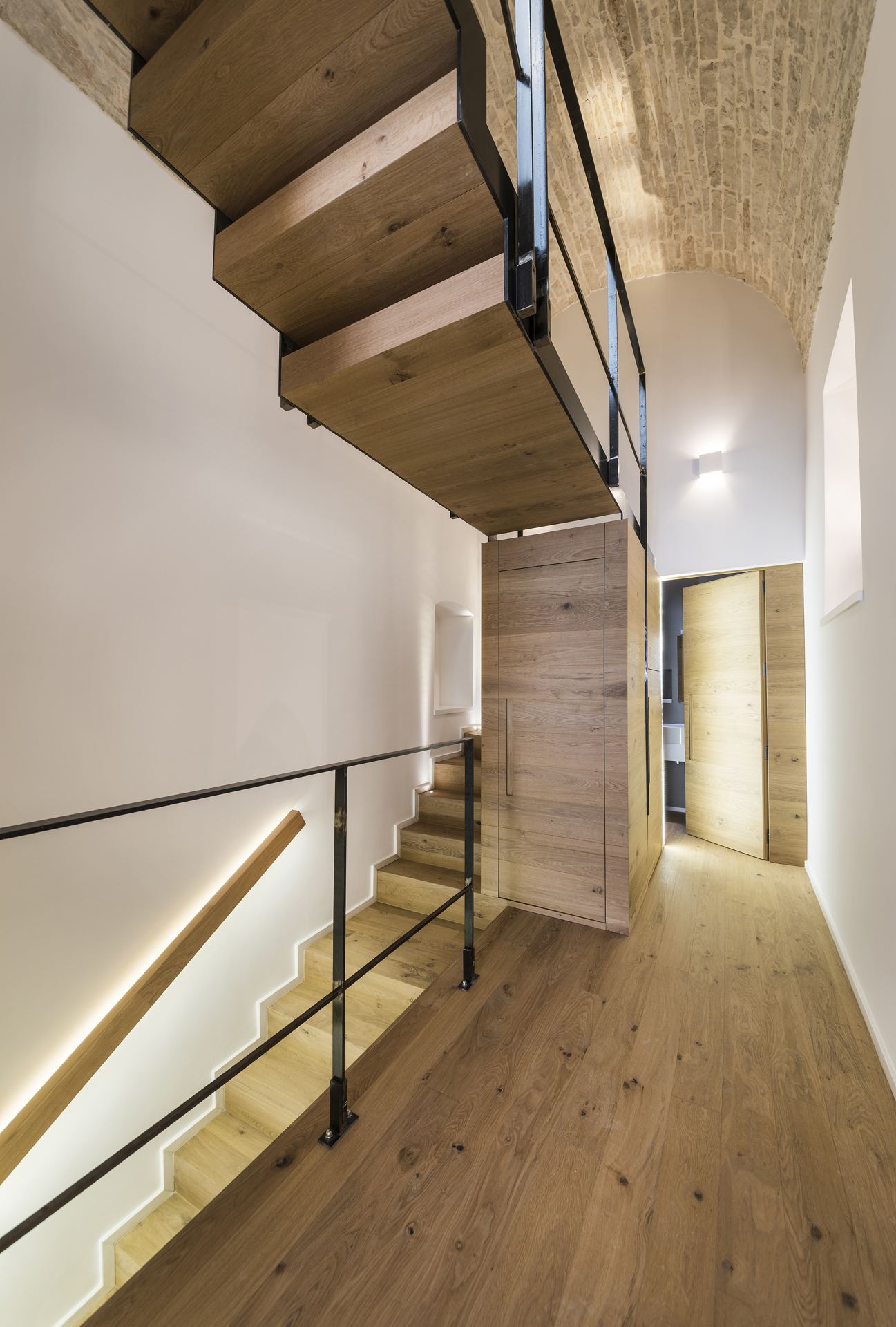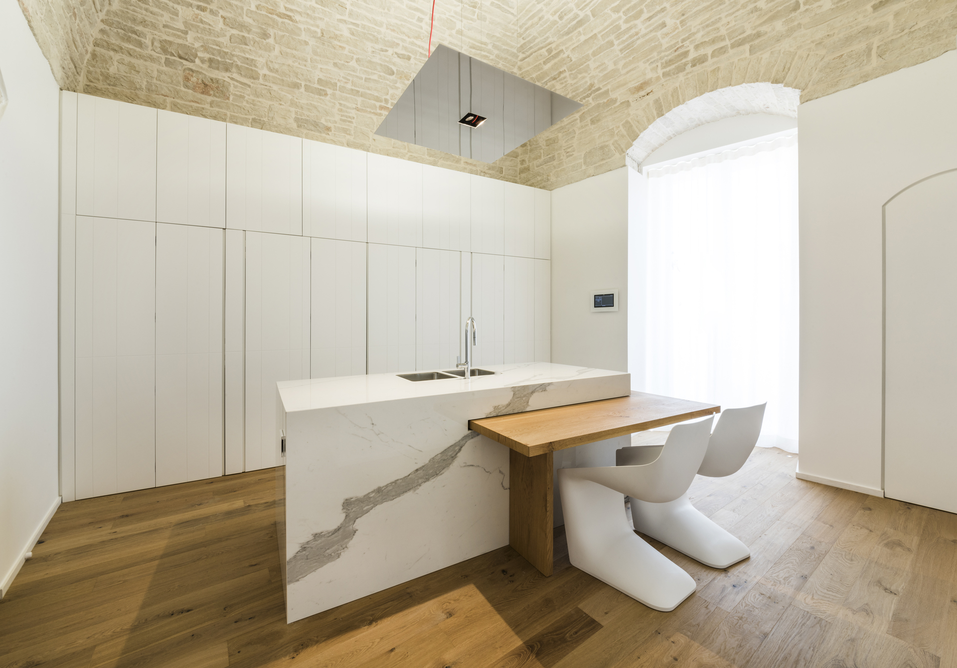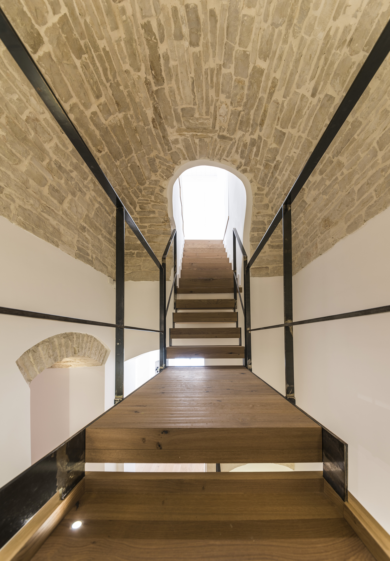 La scelta di pochi ed intensi materiali - il legno appunto, ma anche l’intonaco bianco e la pietra che si unisce nelle volte - ha dato vita ad un concetto di spazio liberato ed epurato da quegli elementi che prima opprimevano l’architettura esistente.