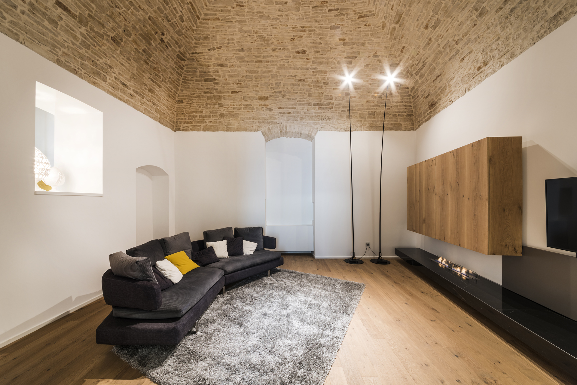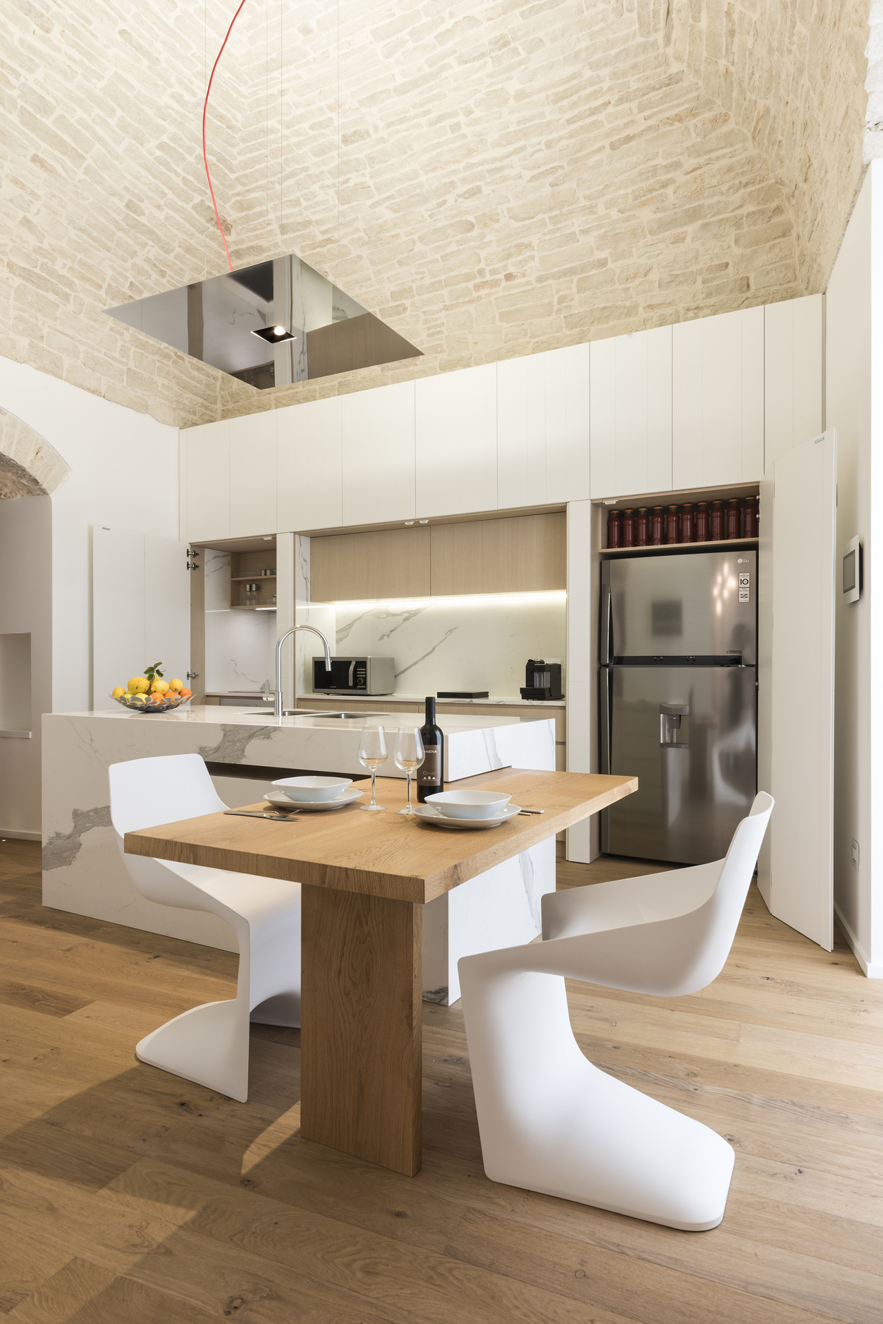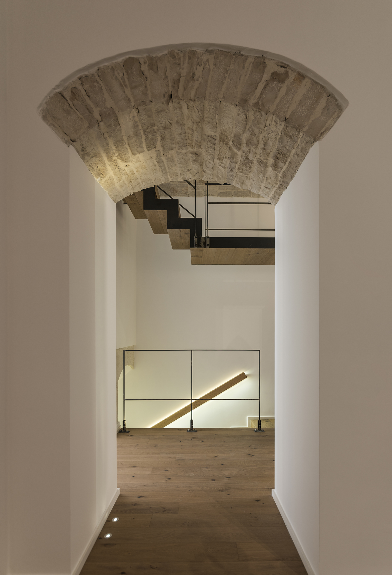 La scelta di pochi ed intensi materiali - il legno appunto, ma anche l’intonaco bianco e la pietra che si unisce nelle volte - ha dato vita ad un concetto di spazio liberato ed epurato da quegli elementi che prima opprimevano l’architettura esistente.
