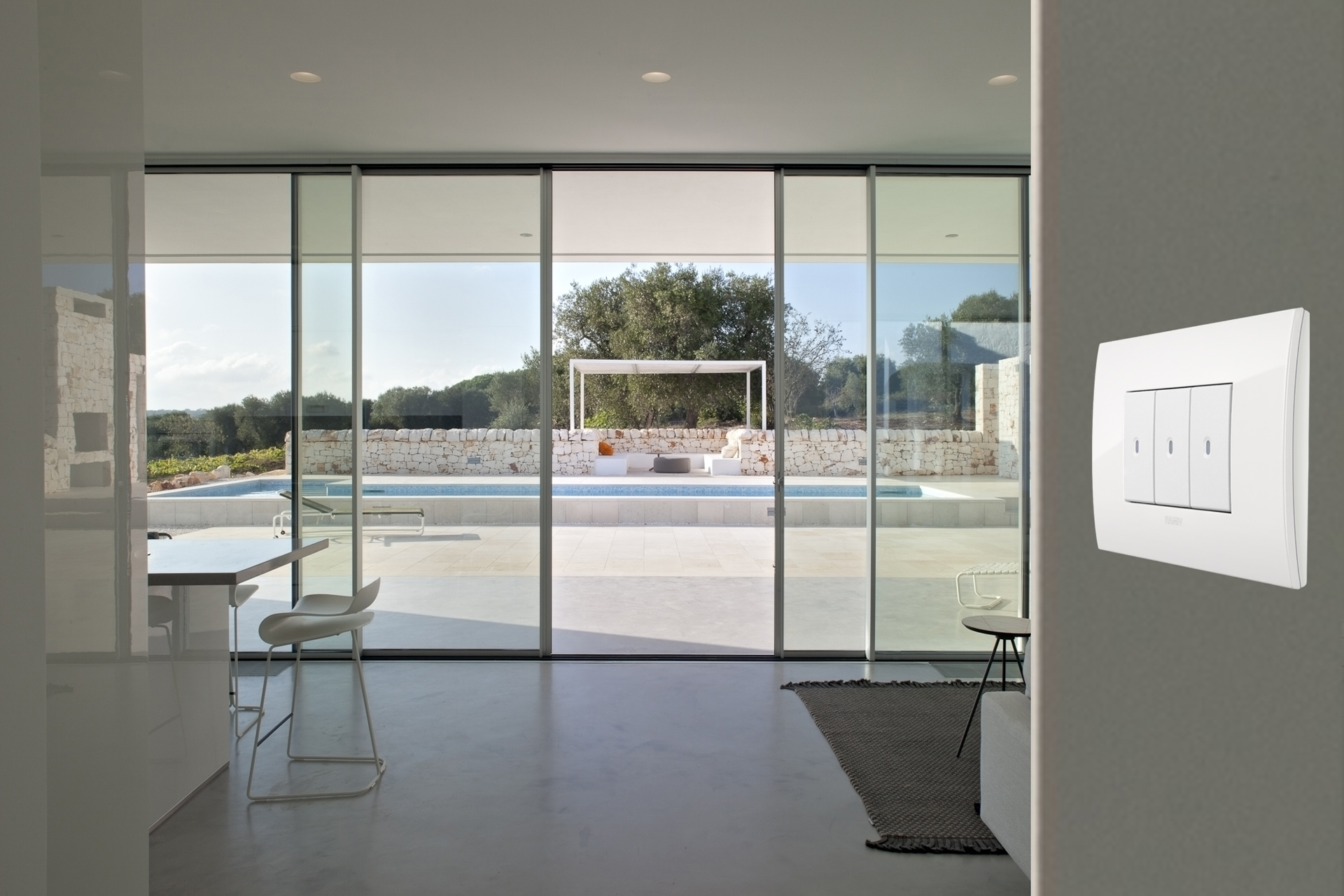 Le scelte di arredi e materiali sono minimali: il tradizionale intonaco scialbato a latte di calce per le murature, pietra di Apricena per le pavimentazioni esterne e cemento lisciato per quelle interne. Un mood che si ritrova anche nella scelta dei dispositivi di comando dell’impianto elettrico. Tra le pareti interne spicca infatti il design contemporaneo della serie civile Arké di Vimar. Scelta nella versione Classic, dalla geometria razionale, il profilo lineare e gli angoli netti, questa serie si spoglia da ogni decoro fine a sé stesso definendo un nuovo modello di energia. Il materiale scelto in questo caso è il metallo con finitura Polar total look, lavorato con l’attenzione per le finiture tipica dell’inconfondibile stile di Vimar e trattato con procedimenti eco-friendly. Disegnata nel presente per il futuro, Arké si integra perfettamente in questo contesto dove la semplicità è il vero valore aggiunto.