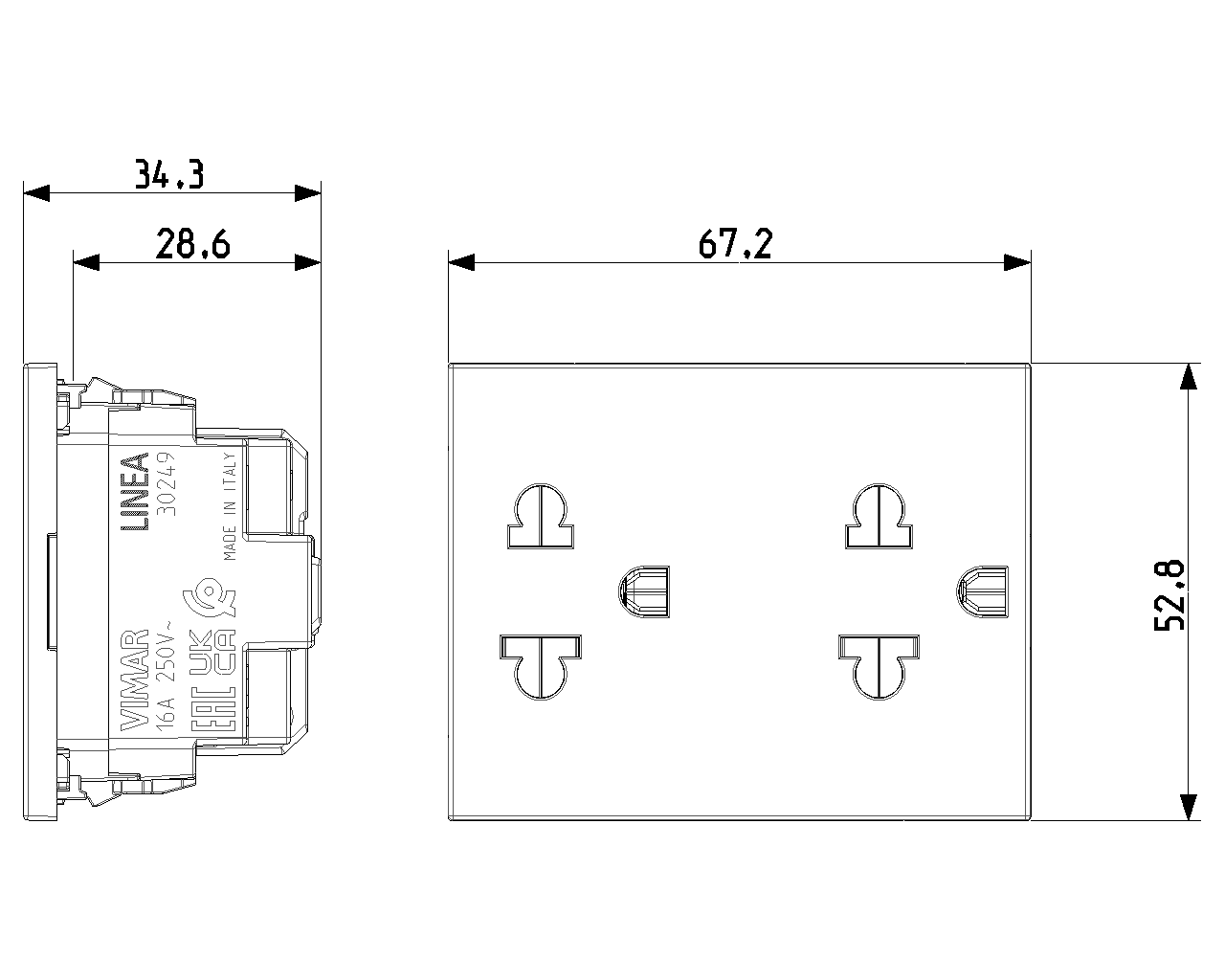 Two SICURY 2P+T 16 A 250 V~ socket outlets, polarised Euro-American standard, white - 3 modules