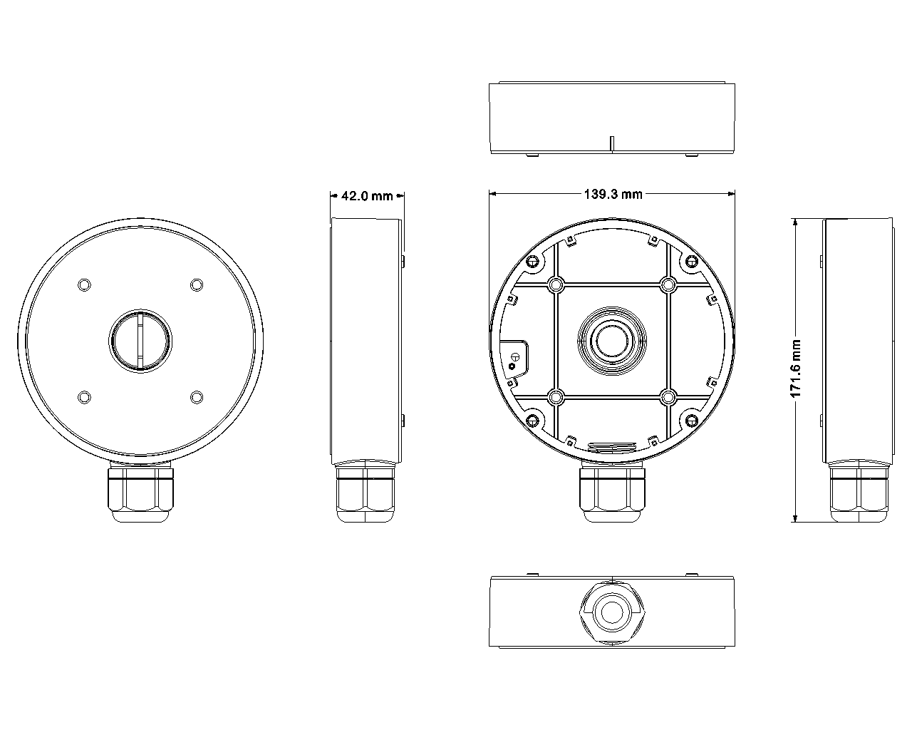 Bracket with contact box for Dome VF cameras for surface or ceiling mounting.