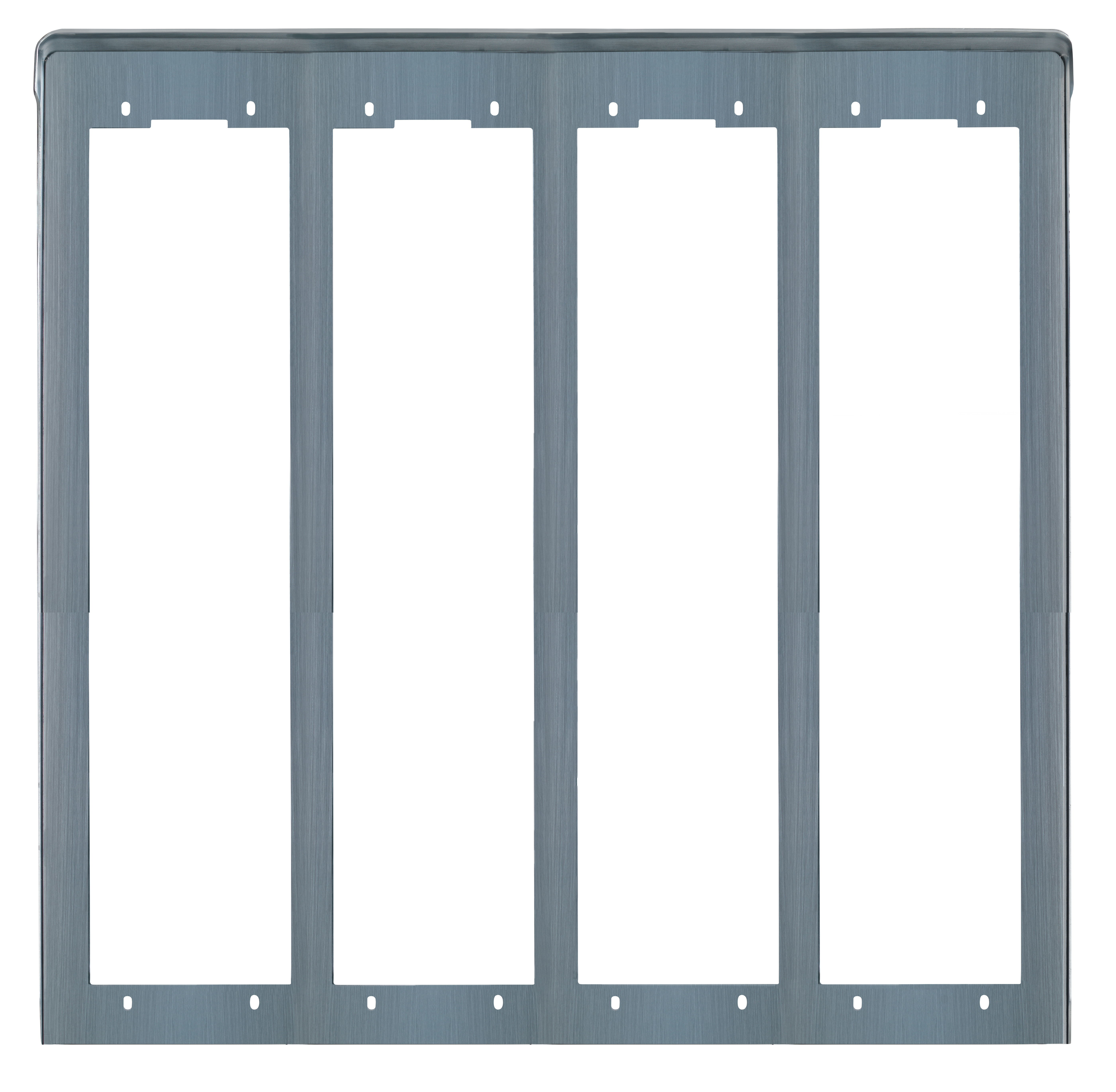Rainproof trim for 4 x 3-module cover plates, electropolished anodized aluminium. Dimensions: 420x402x39 mm